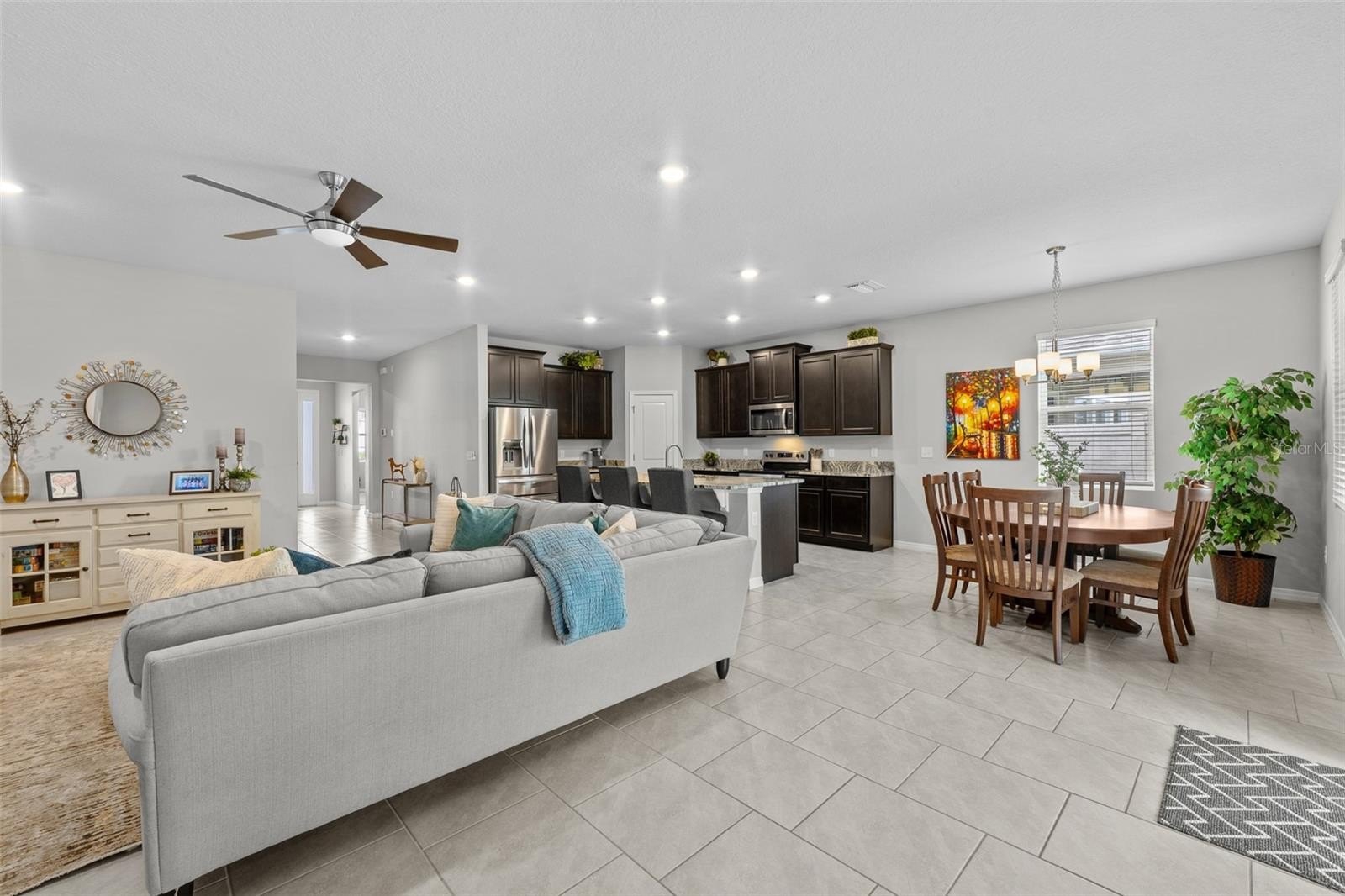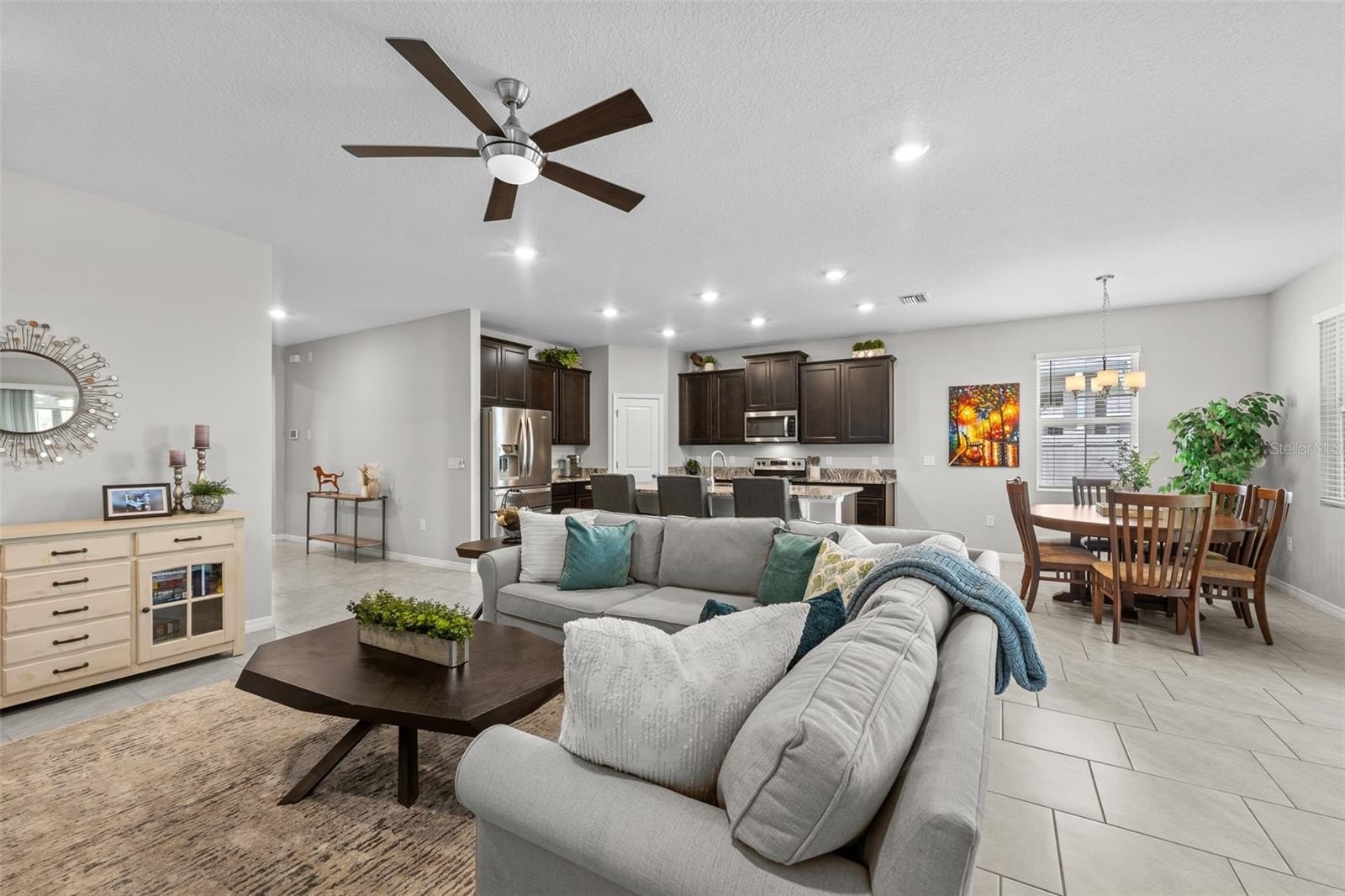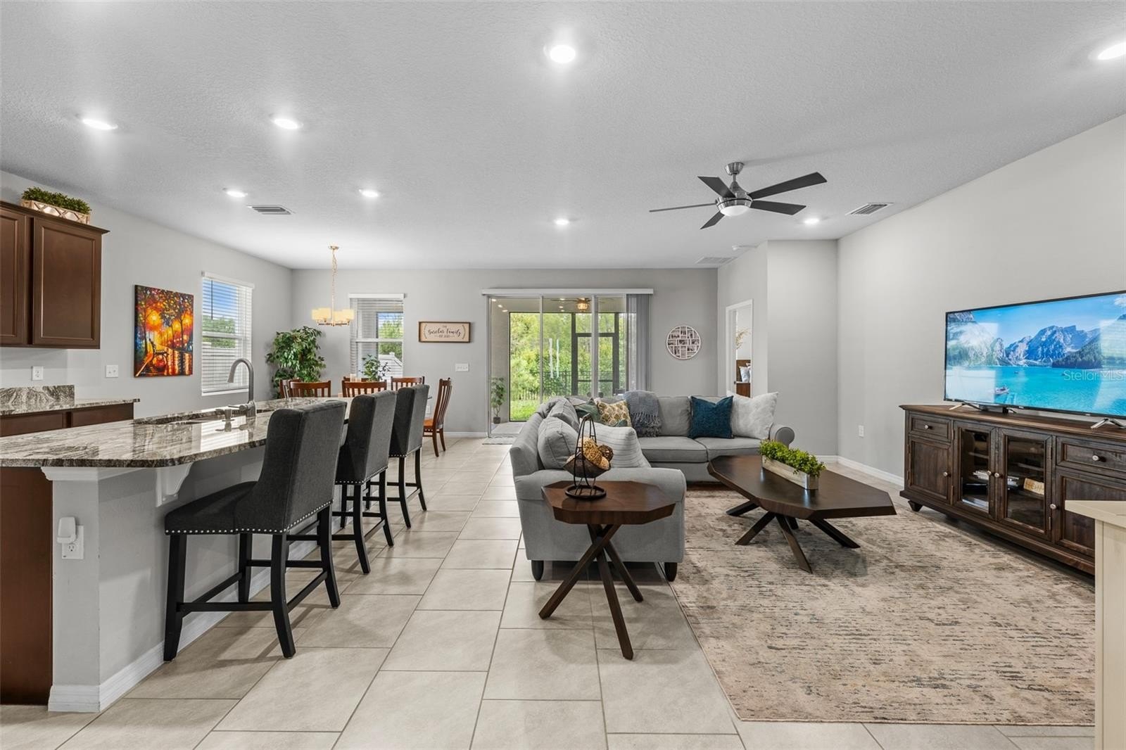 This one-story, all-concrete block home offers an open concept floor plan with a spacious kitchen overlooking large living and dining areas that flow seamlessly to a covered lanai—perfect for relaxing or dining alfresco. Two bedrooms share a full bath at the front of the home, with a fourth bedroom (optional den) and powder bath nearby. The private owner’s suite is tucked at the back with an en-suite bath. The home includes a stainless-steel dishwasher, range, and microwave.