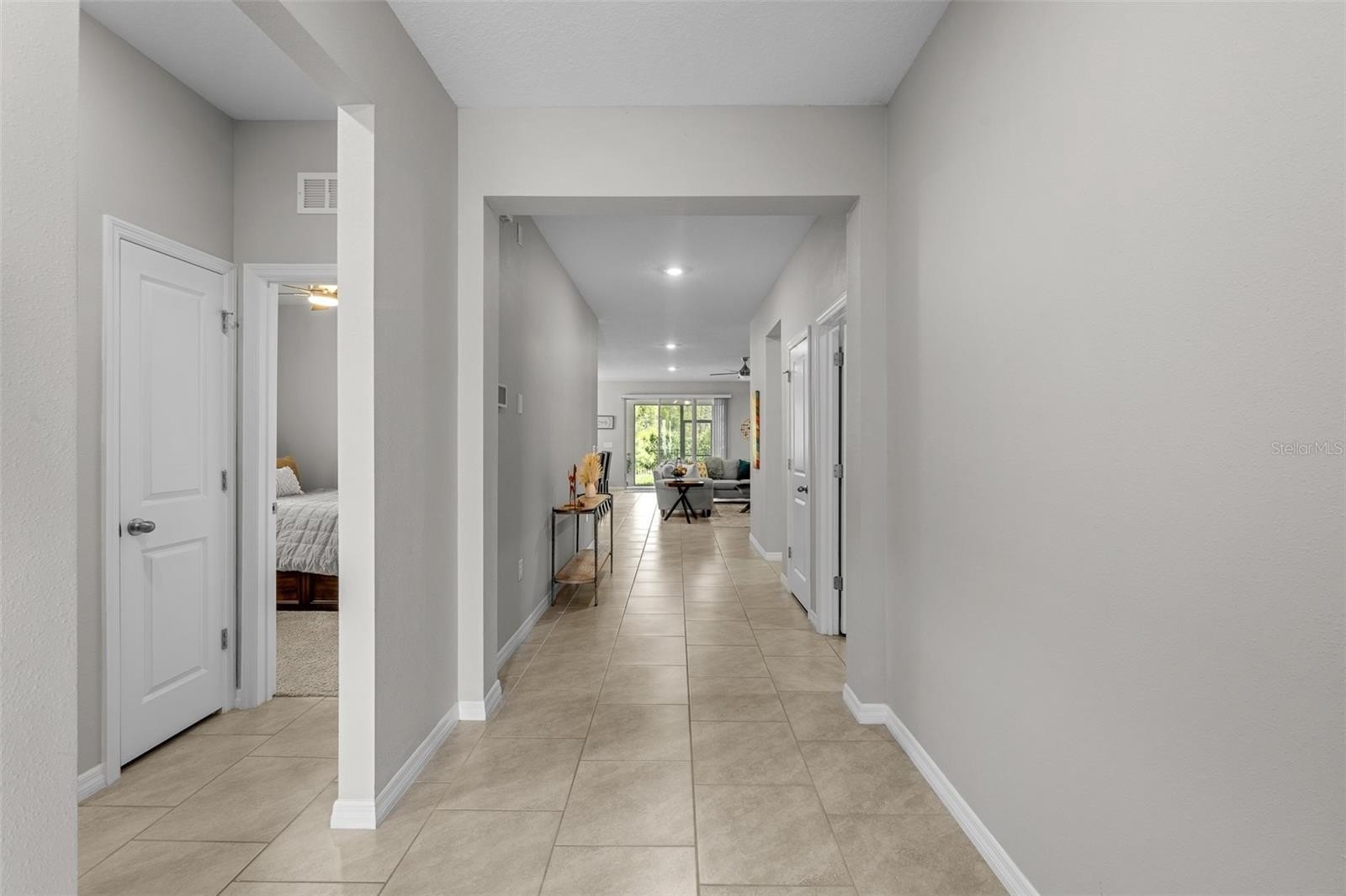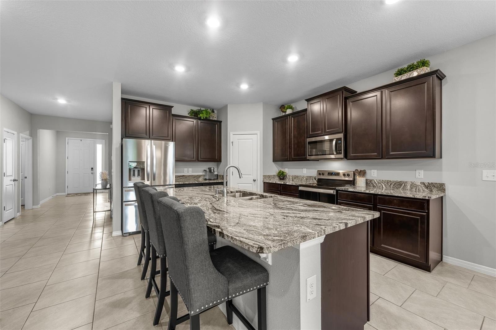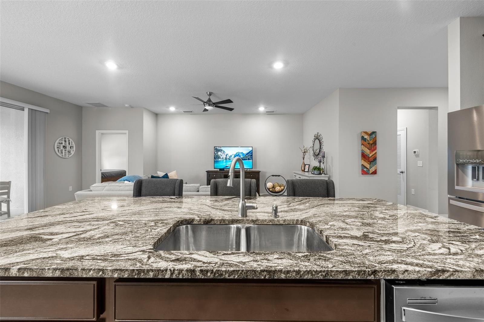 This one-story, all-concrete block home offers an open concept floor plan with a spacious kitchen overlooking large living and dining areas that flow seamlessly to a covered lanai—perfect for relaxing or dining alfresco. Two bedrooms share a full bath at the front of the home, with a fourth bedroom (optional den) and powder bath nearby. The private owner’s suite is tucked at the back with an en-suite bath. The home includes a stainless-steel dishwasher, range, and microwave.