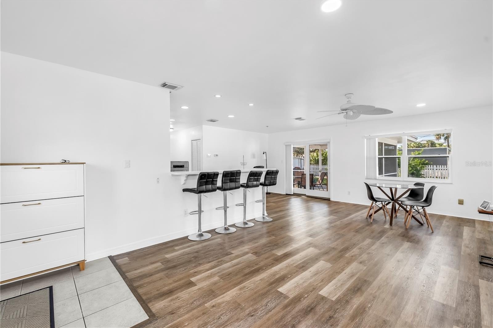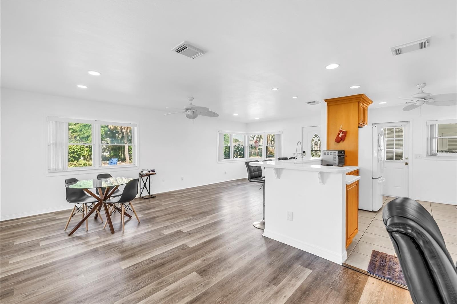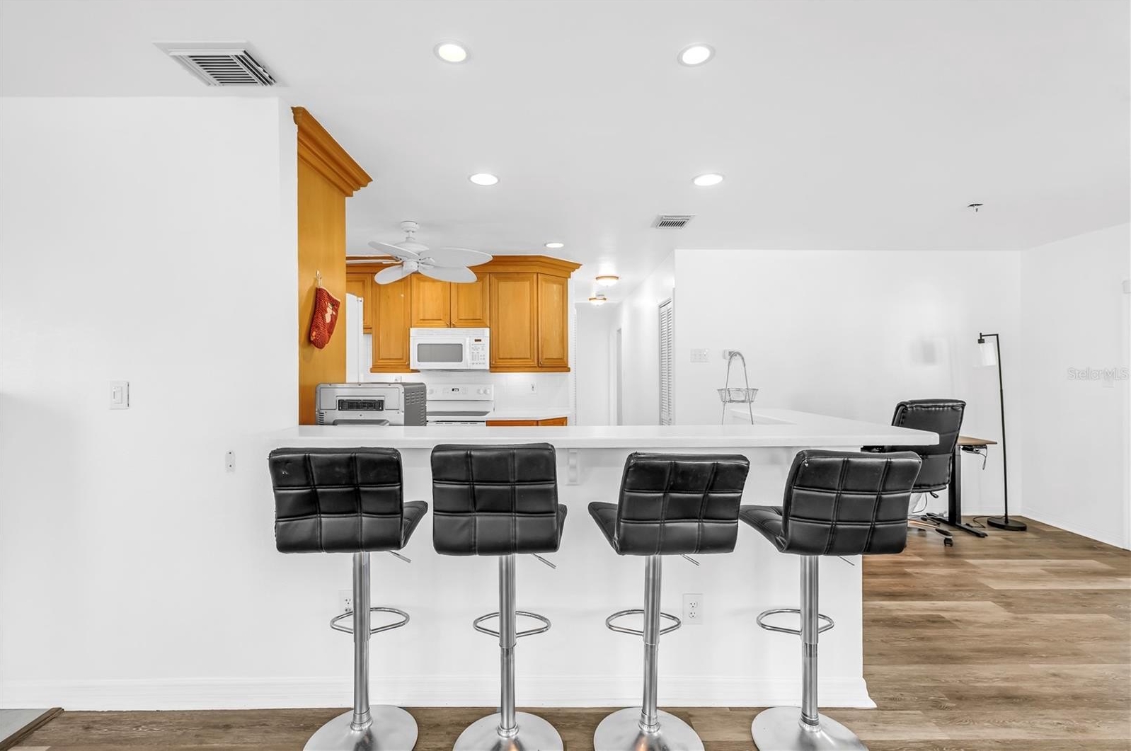 The kitchen is perfect for entertaining, with a peninsula offering bar seating, ample counter space, and generous storage. A nearby hallway leads to a convenient laundry closet and a modernized guest bathroom.