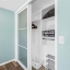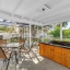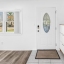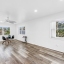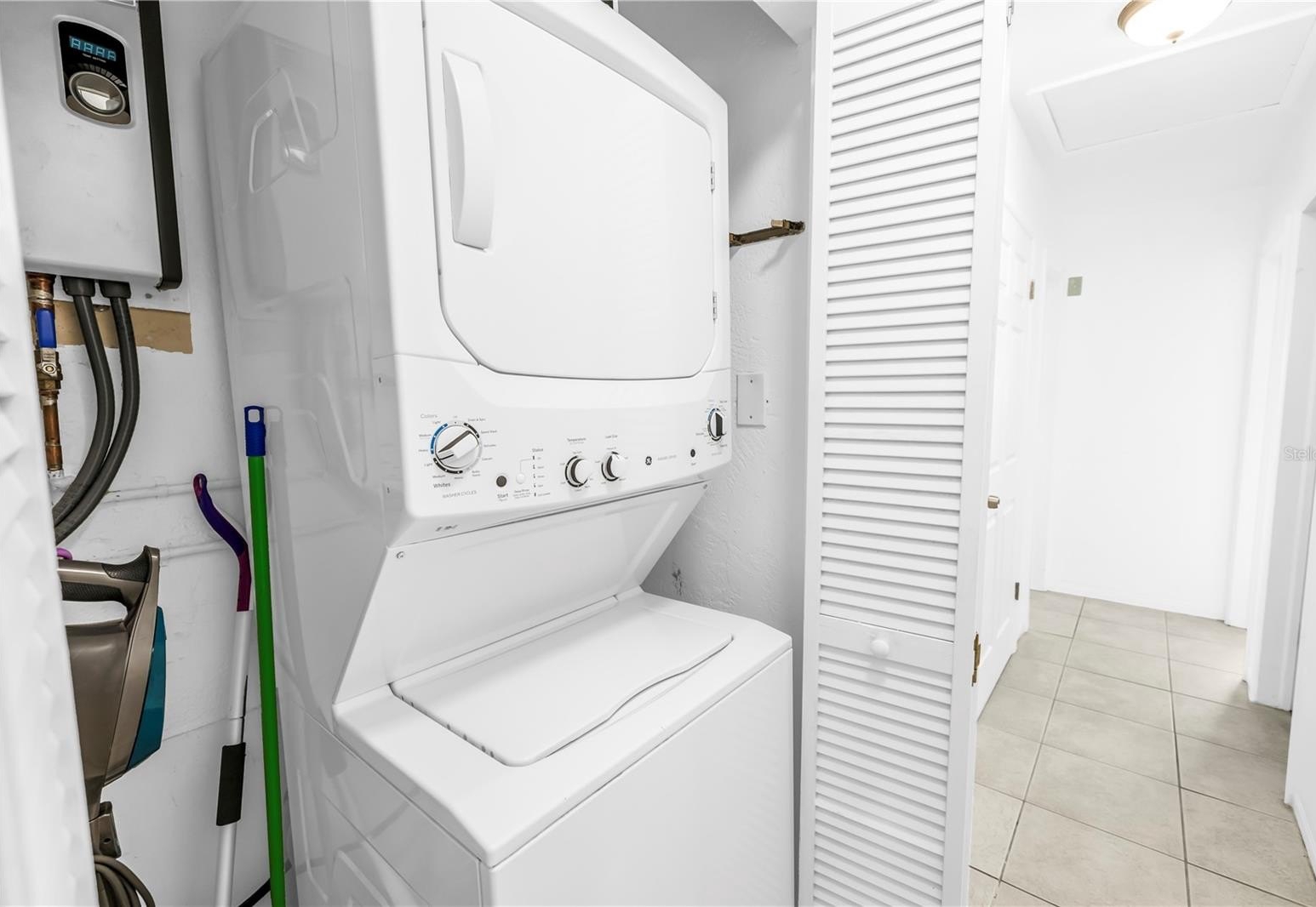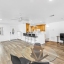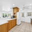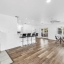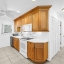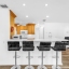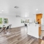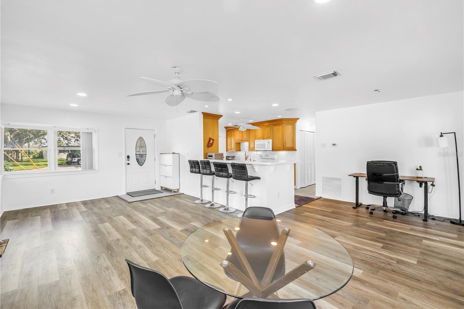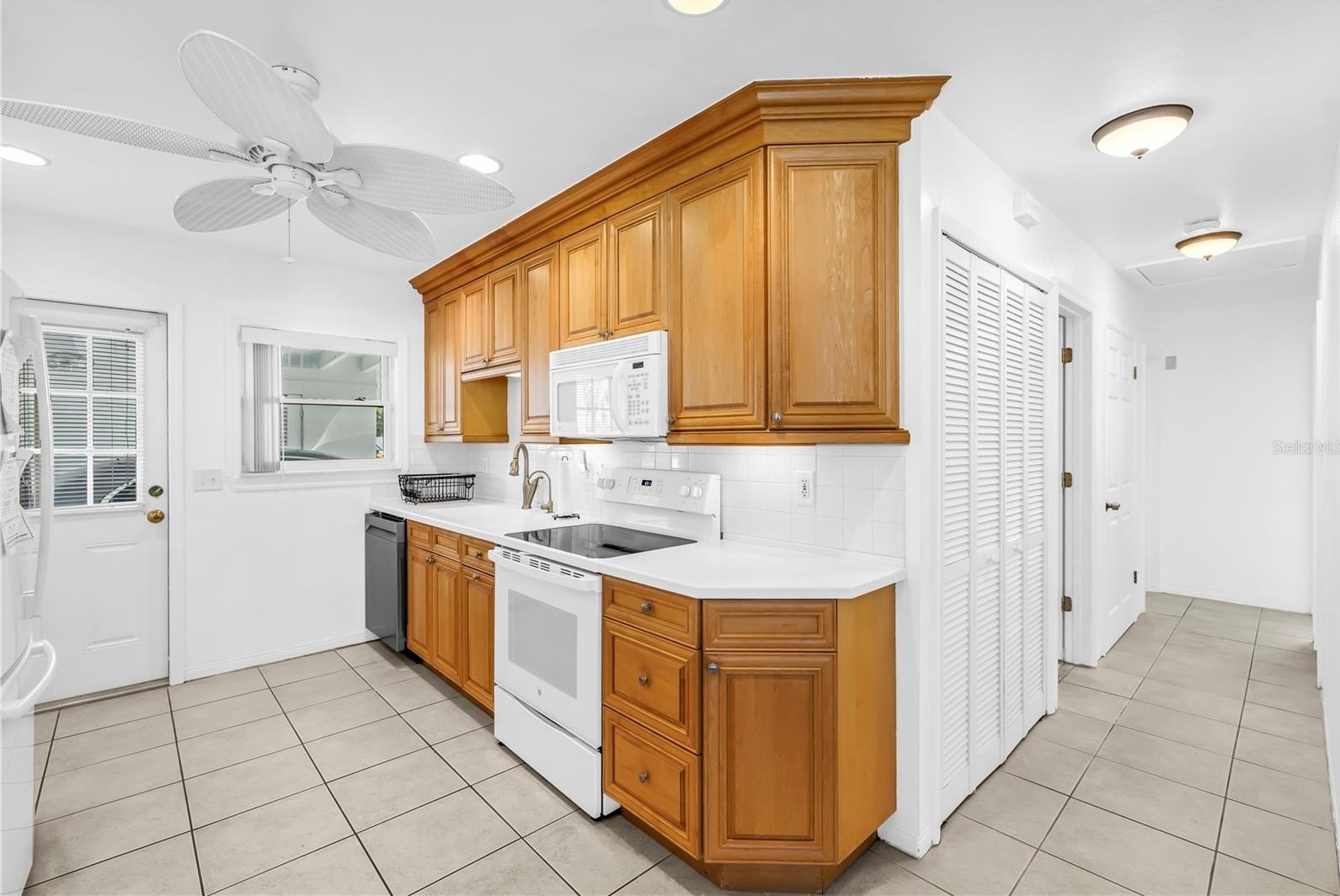 The kitchen is perfect for entertaining, with a peninsula offering bar seating, ample counter space, and generous storage. A nearby hallway leads to a convenient laundry closet and a modernized guest bathroom.