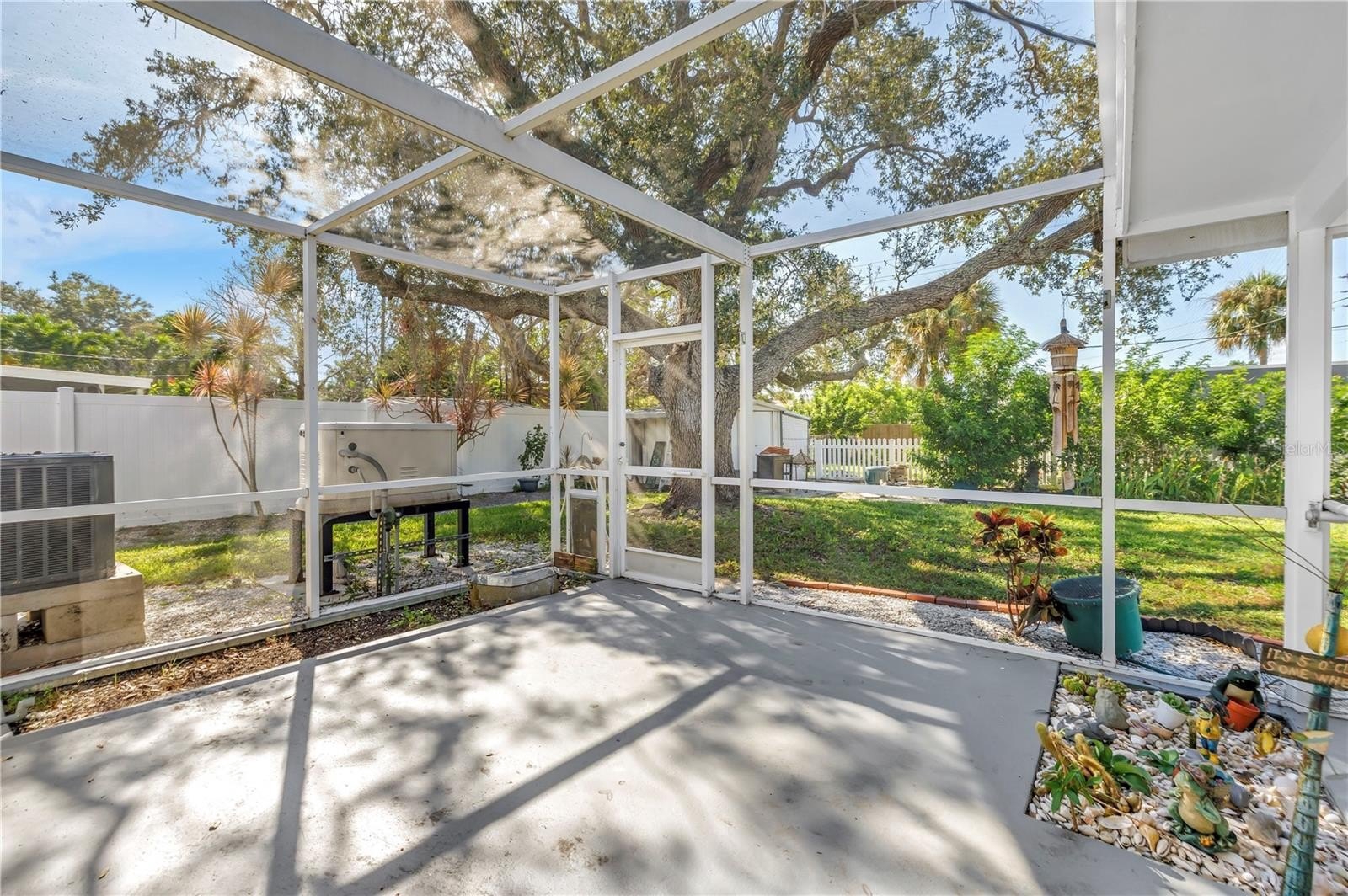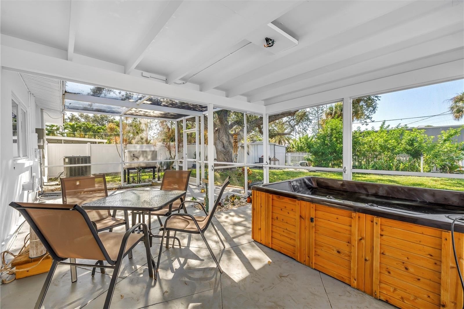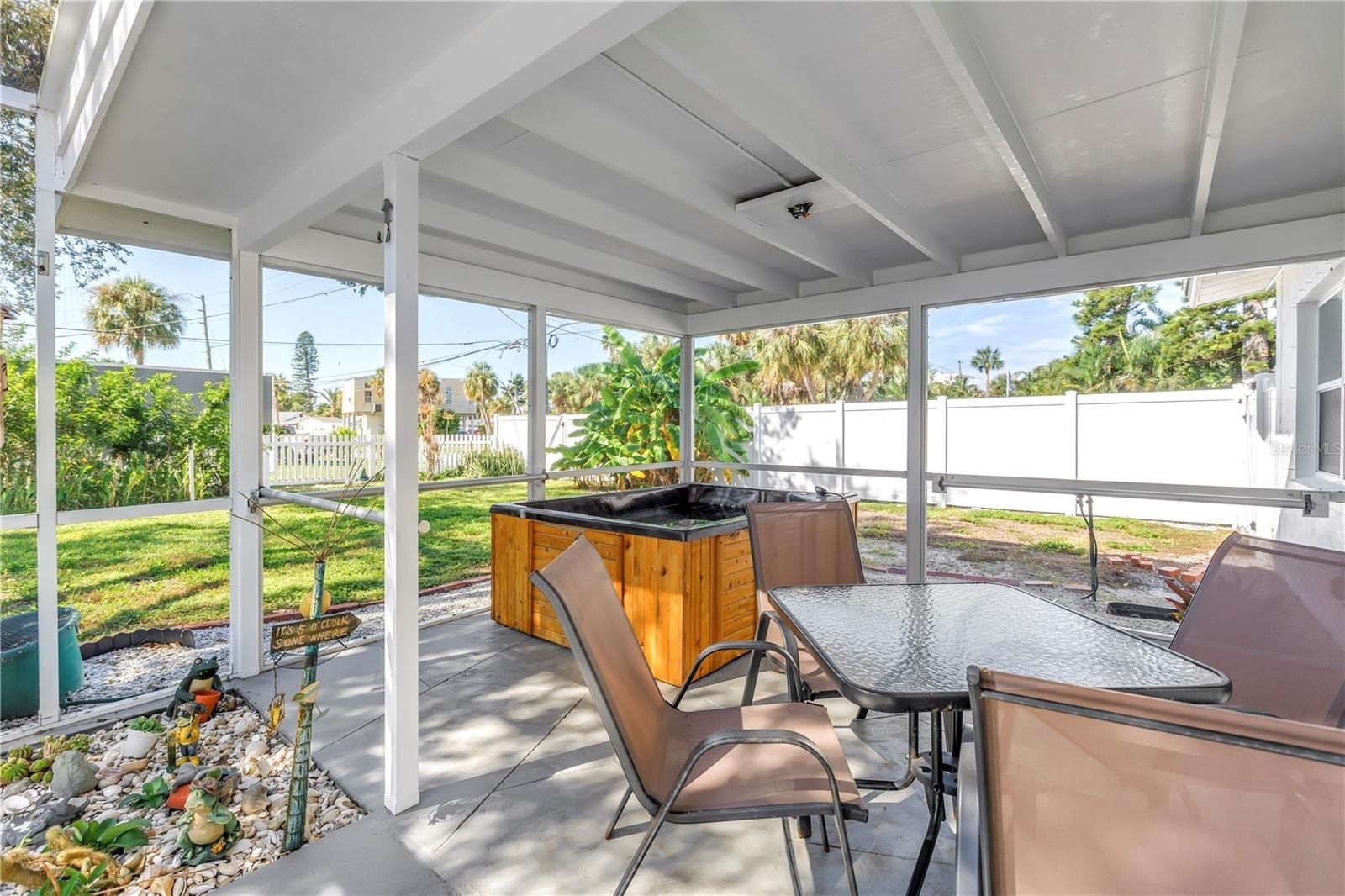 All three bedrooms, including a private primary suite, include built-in closets. Open the sliding glass doors to a screened lanai with a covered lounge area and a newer hot tub (installed in 2019), all overlooking backyard oasis with a brand new fence.