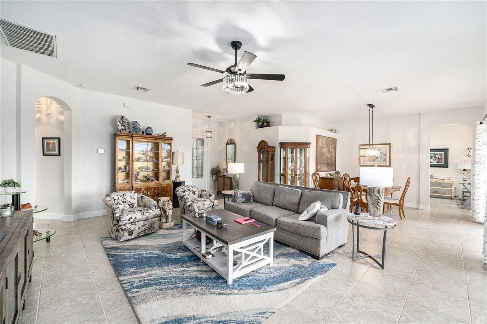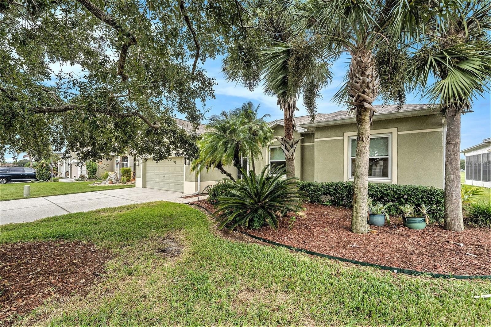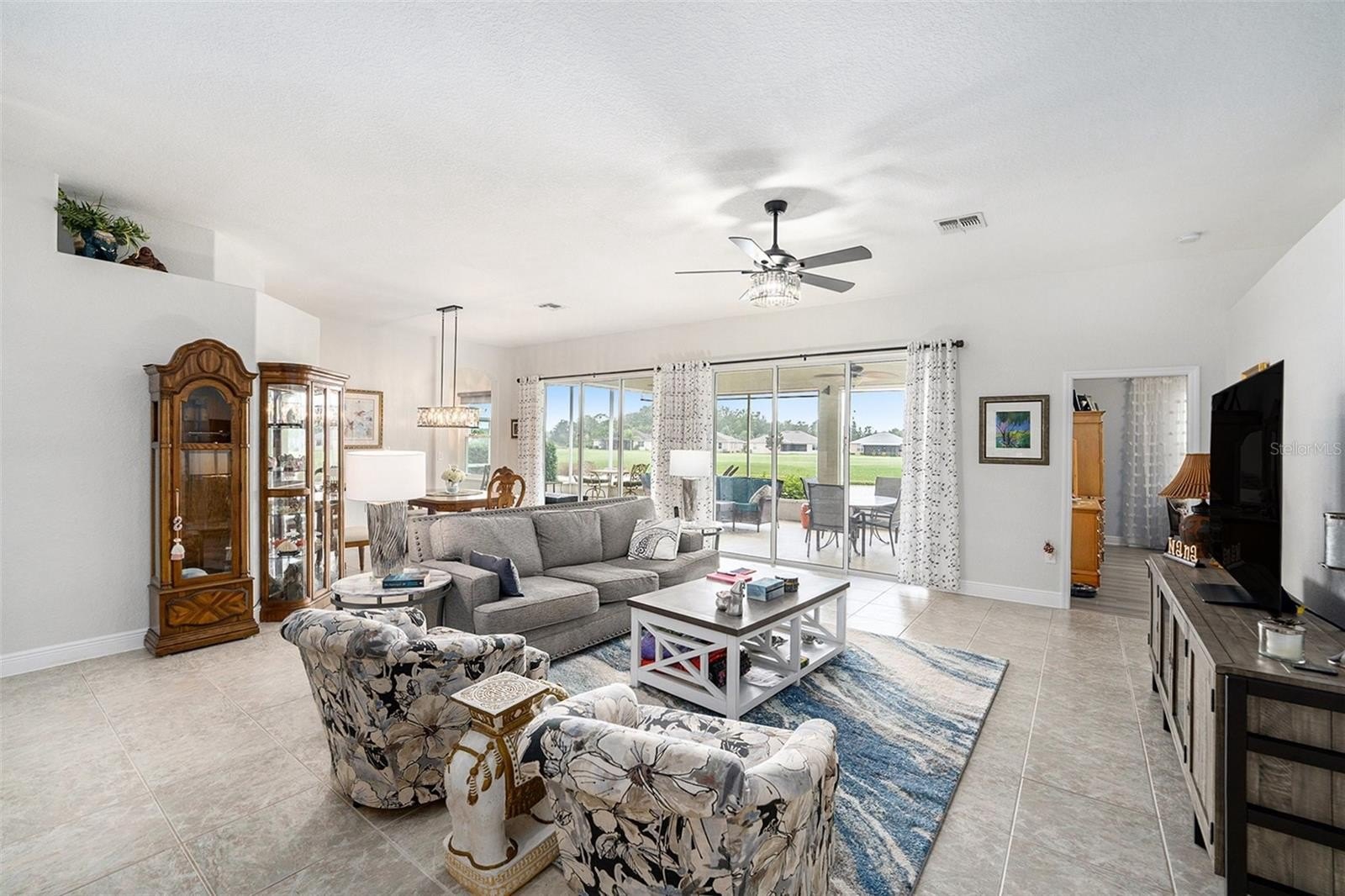 Beautiful Golf Course & Pond Views. Located in the sought-after 55+ community of Tampa Bay Golf and Country Club, this 3-bedroom home combines modern updates with stunning outdoor scenery. Step inside through a decorative glass front door into a spacious great room with 9.5-foot ceilings. Two sets of tinted sliding glass doors open to an oversized screened lanai with panoramic views of the pond and 10th hole. The kitchen has been recently remodeled with stainless steel appliances, quartz countertops, glass-tile backsplash, abundant cabinetry, pantry, and a dine-in area. The primary bedroom suite offers two closets, including an extra-large walk-in, plus a tiled shower with frameless glass enclosure and a relaxing whirlpool tub. The guest bathroom features a striking glass bowl sink with matching vanity cabinet. Updated light fixtures and ceiling fans add a modern touch throughout. Common rooms and wet areas have tile floors while bedrooms all have a matching luxury vinyl that complements the tile. The laundry room off the kitchen offers a stacked washer/dryer, utility sink, and broom closet for added convenience. Major updates include a new roof (2021), A/C (2019), and a tankless water heater for instant hot water. Enjoy access to resort-style amenities including two golf courses, swimming pools, fitness center, pickleball and tennis courts, and an on-site restaurant. HOA Fees include Cable, Internet, and Lawn Care. This home offers a low-maintenance, amenity-rich lifestyle with one of the best views in the community.