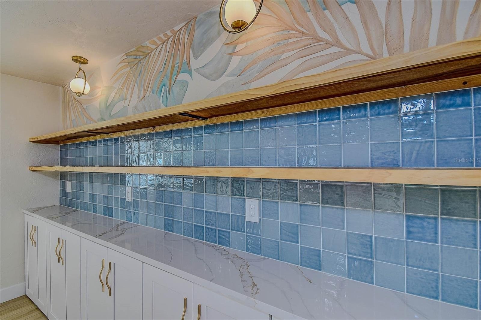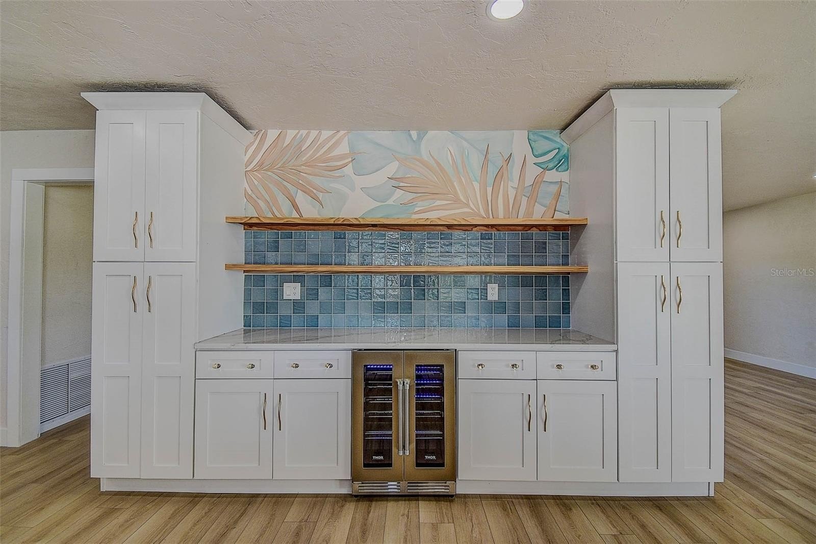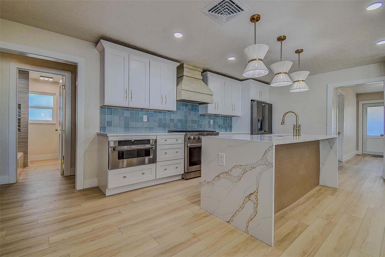 Wow!! The GOURMET KITCHEN boasts TILE BACKSPLASH, extensive storage, solid QUARTZ countertops with a WATERFALL island, ALL WOOD cabinets, DRY BAR, and a THOR appliance package including WINE COOLER, CUSTOM range hood, MICROWAVE DRAWER, and 6-burner, 36-inch NATURAL GAS range. And the PASS-THROUGH sliding window allows instant access to the lanai.
