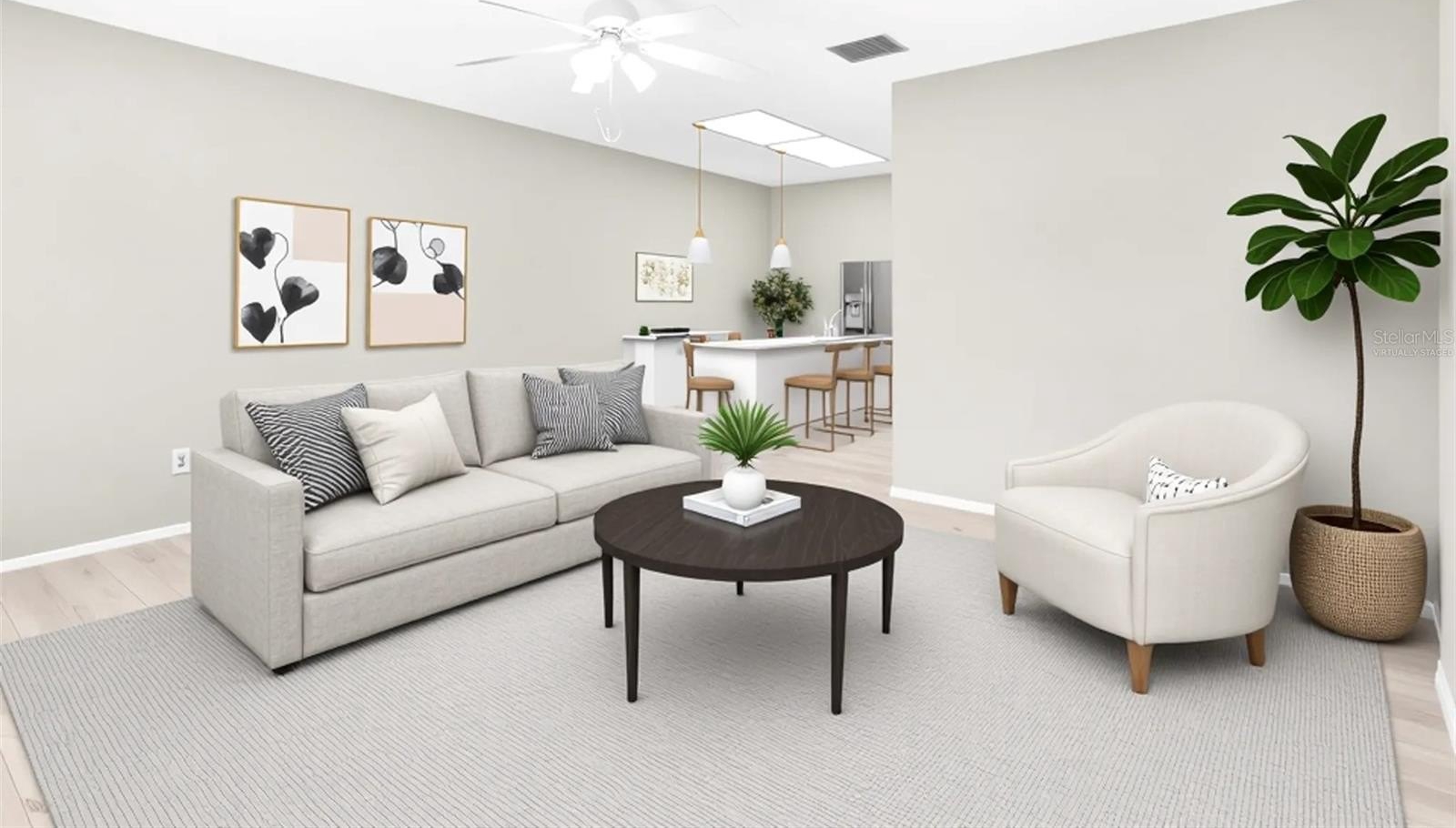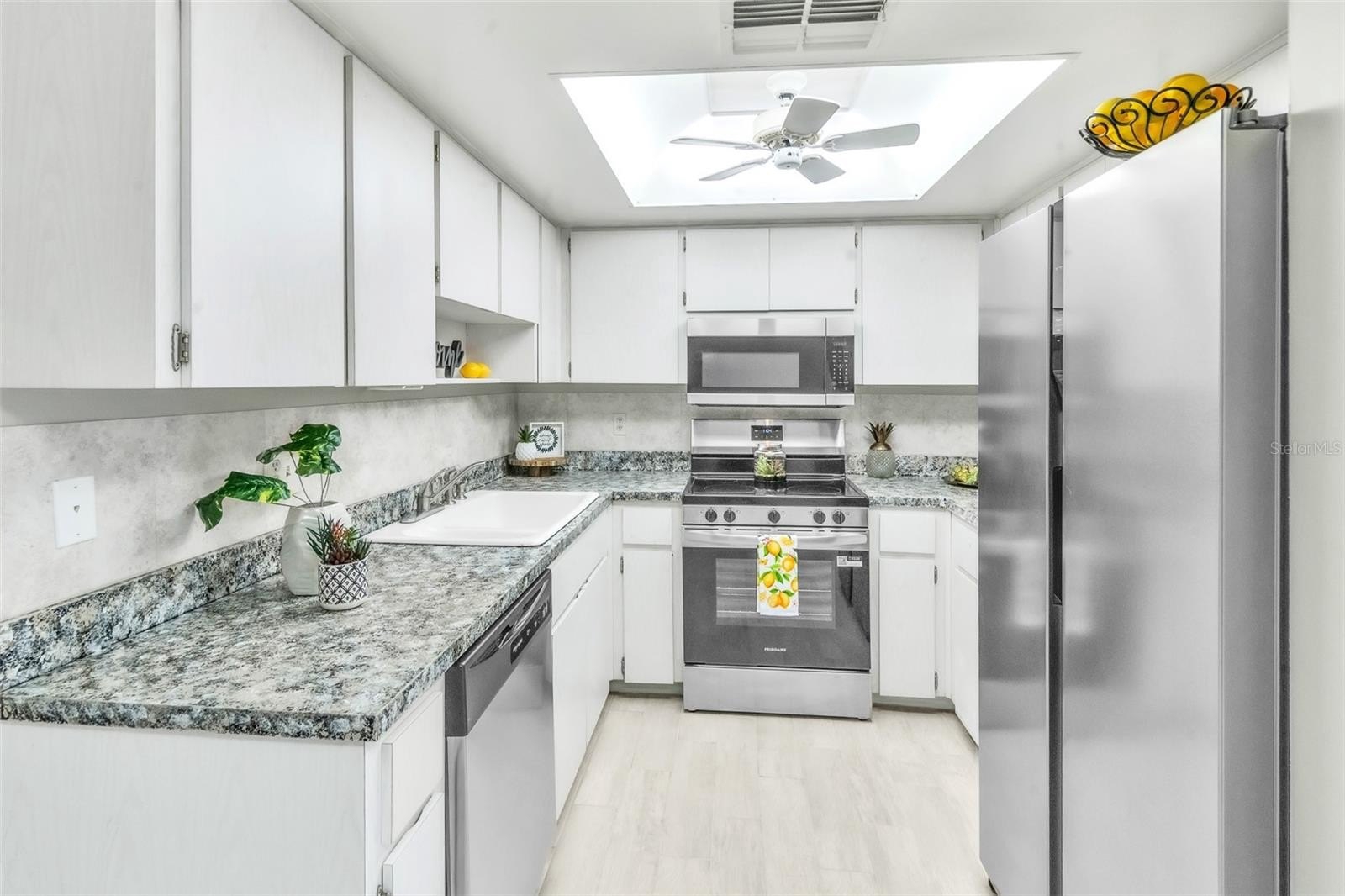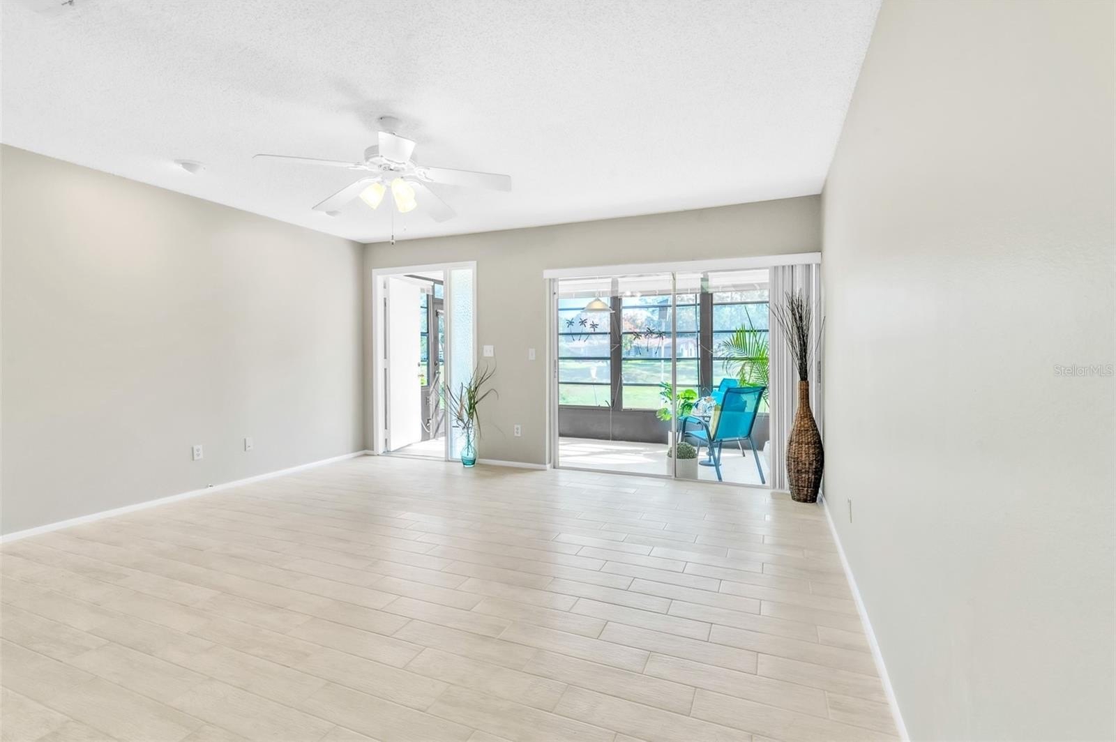 One or more photo(s) has been virtually staged. Welcome to this beautifully refreshed 2-bedroom, 2-bath villa offering 918 sq ft of comfortable living space along with a convenient 1-Car Garage. Single level living in one of Palm Harbor’s most desirable active adult communities. Brand-New Porcelain Tile flooring throughout and the whole unit has been freshly painted. The open floor plan connects the living, dining, and kitchen areas seamlessly, making it great for both relaxing and entertaining. Both bedrooms are spacious, and the bathrooms have been recently updated with NEW VANITIES and TOILETS, ensuring privacy and comfort. BRAND-NEW ROOF (2025), HVAC System (2022), Water Heater (2023), and a stylish modern hallway light. The kitchen features BRAND-NEW STAINLESS-STEEL APPLIANCES, and a door from the dining room leads to the garage, which provides extra storage, vehicle protection, and access to the washer, dryer, and utility sink. Sit back and relax knowing this unit is in a High Elevation, NON-Evacuation Zone and Non-Flood Zone and received no storm or flood damage. HOA fee covers cable, internet, water, sewer, trash, and exterior maintenance—so all you need to do is come relax in your screened-in lanai with mosquito-free breezes, or cruise around in your golf cart.