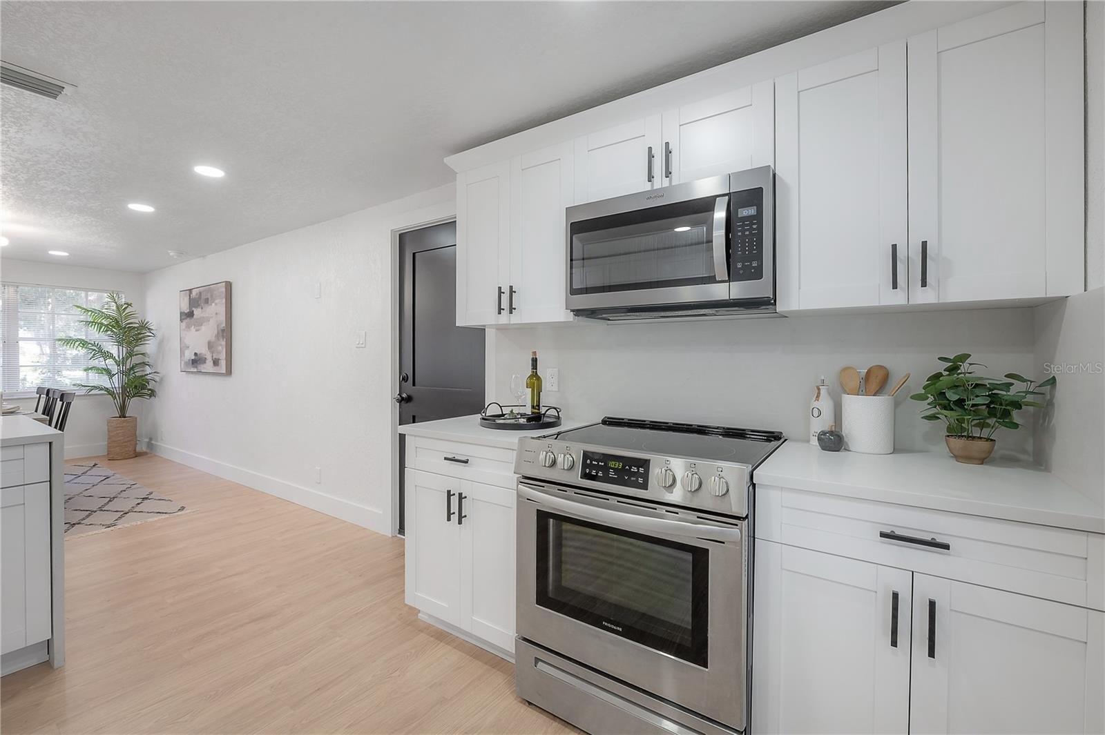 Step inside and feel the story unfold, an open layout where the kitchen, dining, and living areas merge effortlessly, designed for togetherness. The shaker cabinets gleam beneath the light dancing off waterfall quartz counters. Luxury vinyl floors guide your steps from room to room, each one whispering modern comfort and possibility.