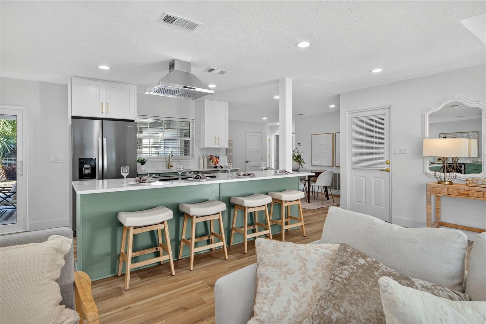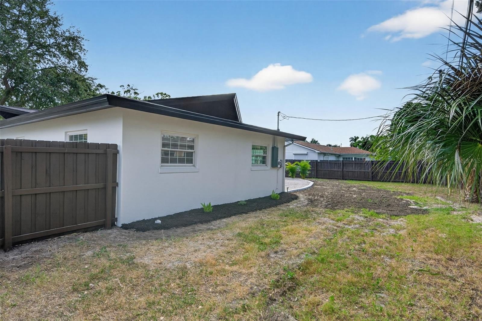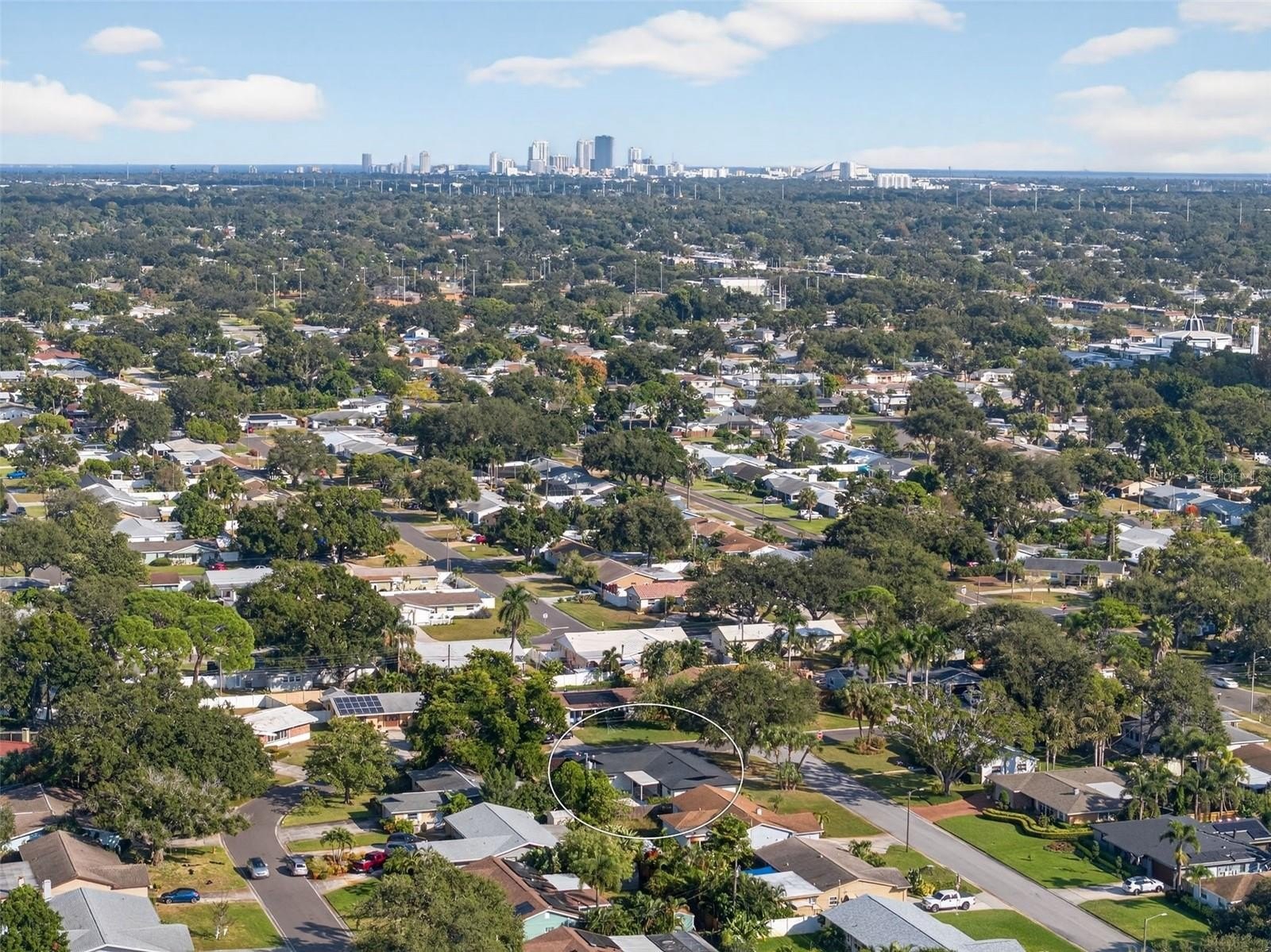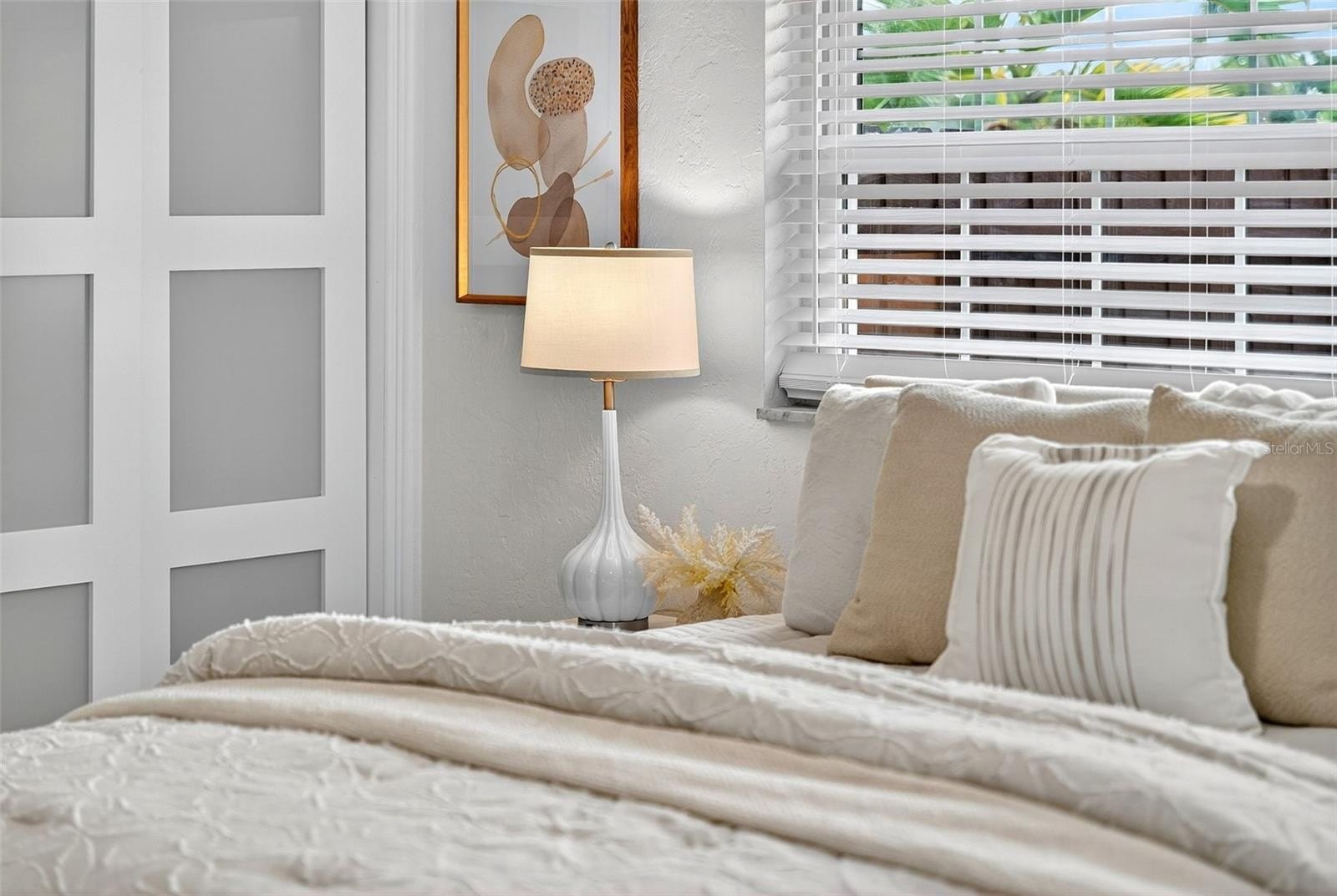 Step inside to discover a thoughtfully designed split-bedroom floor plan offering two guest bedrooms on one side of the home and a private primary suite on the other. The primary retreat features a gorgeous en-suite bathroom with a walk-in shower, dual vanity, and custom closets with built-in storage. The two additional bedrooms are generously sized and include built-in closet systems, sharing a beautifully updated hallway bath. A convenient interior laundry room and abundant storage, including multiple hallway closets and a large pantry, add everyday functionality. The open-concept living, dining, and kitchen areas flow seamlessly together, creating the perfect environment for relaxing or entertaining. Two sliding doors open to the covered lanai and backyard, extending your living space outdoors. The kitchen offers an organic yet contemporary vibe with muted green lower cabinets, crisp white uppers, stunning quartz countertops, and a full suite of new stainless steel appliances. A chic dry bar with a wine cooler and beverage fridge is perfectly positioned for entertaining or unwinding after a long day. Every detail of this home has been upgraded in 2025, including a new roof, HVAC system and ductwork, plumbing, water heater, PGT windows, and a stylish new front door with sidelights. Freshly painted inside and out, this home is truly move-in ready! Located in a high-and-dry, flood zone X area, this home is just minutes from the Gulf beaches, walking distance to schools, and close to shopping, dining, and entertainment. Downtown St. Pete is a quick 15-minute drive away, with both TPA and PIE airports approximately 30 minutes from your doorstep.