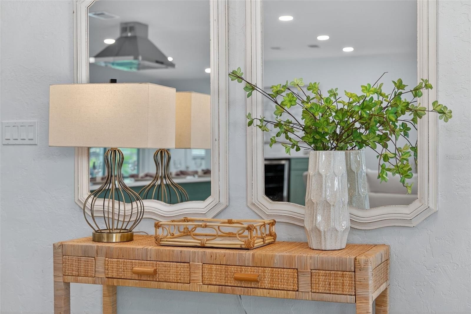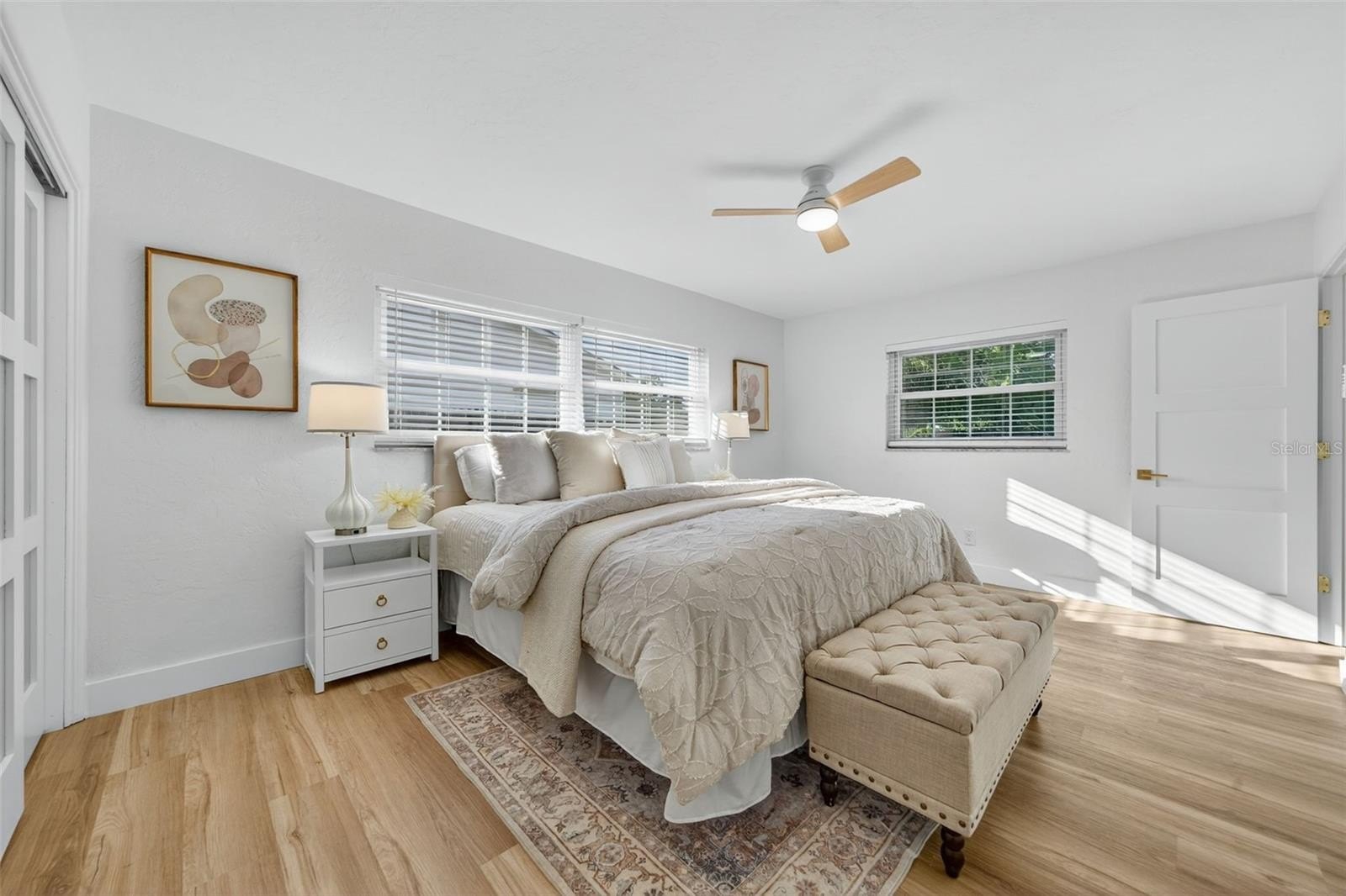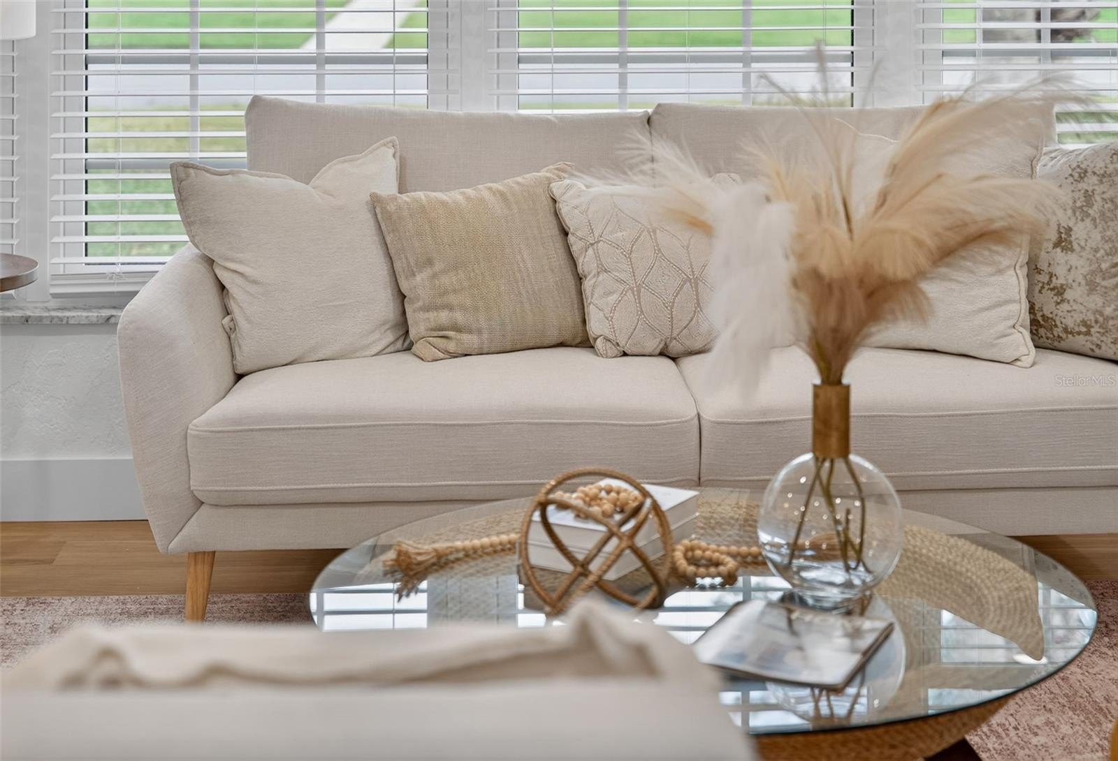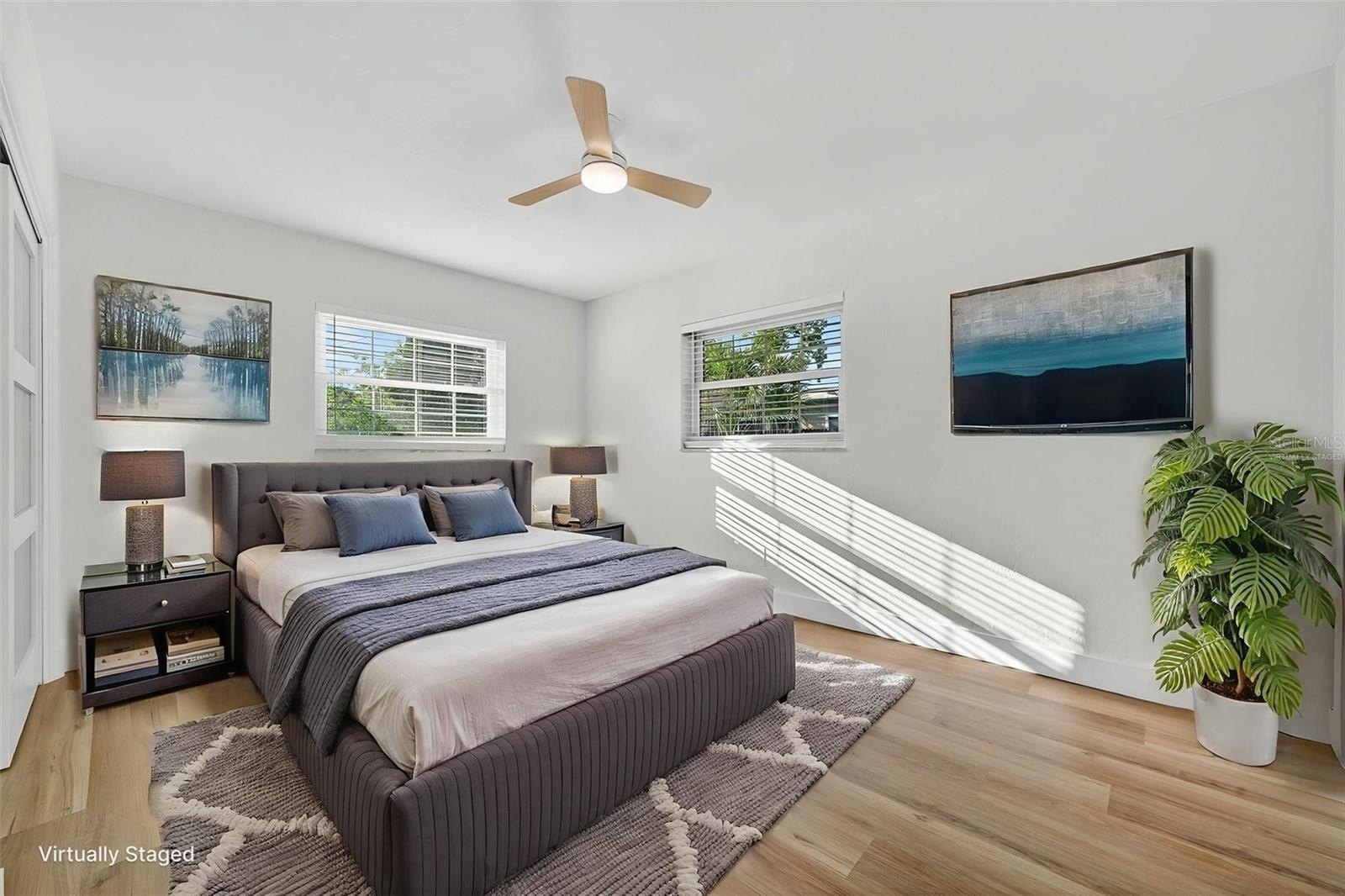 Step inside to discover a thoughtfully designed split-bedroom floor plan offering two guest bedrooms on one side of the home and a private primary suite on the other. The primary retreat features a gorgeous en-suite bathroom with a walk-in shower, dual vanity, and custom closets with built-in storage. The two additional bedrooms are generously sized and include built-in closet systems, sharing a beautifully updated hallway bath. A convenient interior laundry room and abundant storage, including multiple hallway closets and a large pantry, add everyday functionality. The open-concept living, dining, and kitchen areas flow seamlessly together, creating the perfect environment for relaxing or entertaining. Two sliding doors open to the covered lanai and backyard, extending your living space outdoors. The kitchen offers an organic yet contemporary vibe with muted green lower cabinets, crisp white uppers, stunning quartz countertops, and a full suite of new stainless steel appliances. A chic dry bar with a wine cooler and beverage fridge is perfectly positioned for entertaining or unwinding after a long day. Every detail of this home has been upgraded in 2025, including a new roof, HVAC system and ductwork, plumbing, water heater, PGT windows, and a stylish new front door with sidelights. Freshly painted inside and out, this home is truly move-in ready! Located in a high-and-dry, flood zone X area, this home is just minutes from the Gulf beaches, walking distance to schools, and close to shopping, dining, and entertainment. Downtown St. Pete is a quick 15-minute drive away, with both TPA and PIE airports approximately 30 minutes from your doorstep.