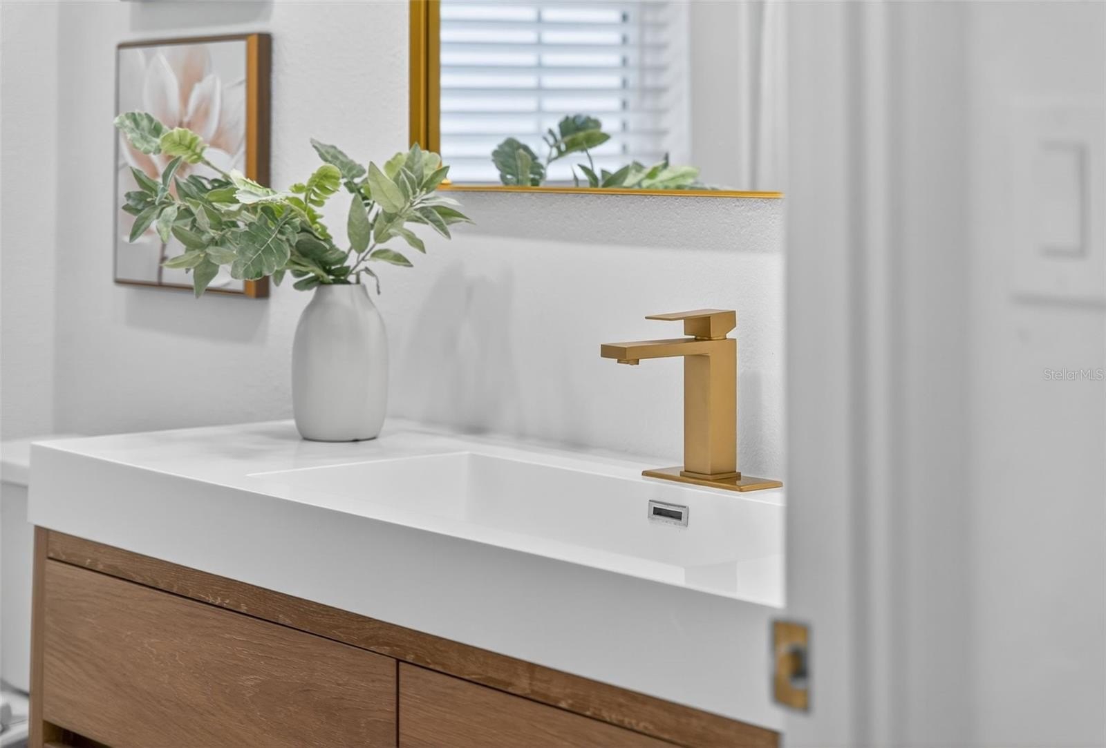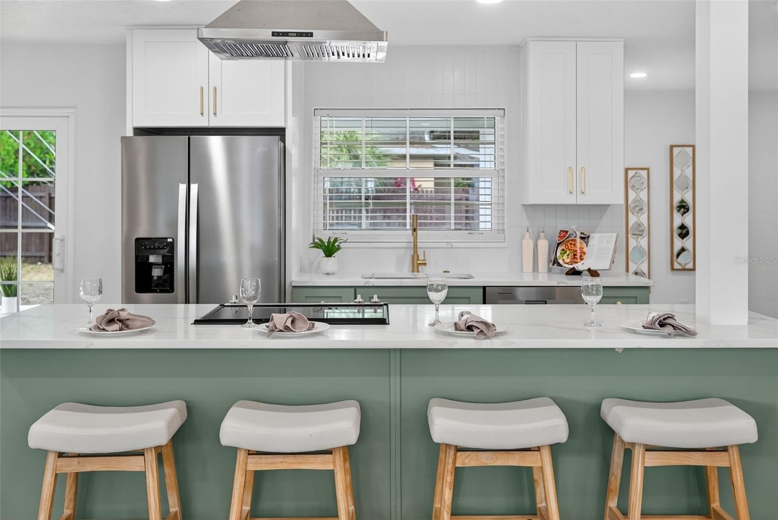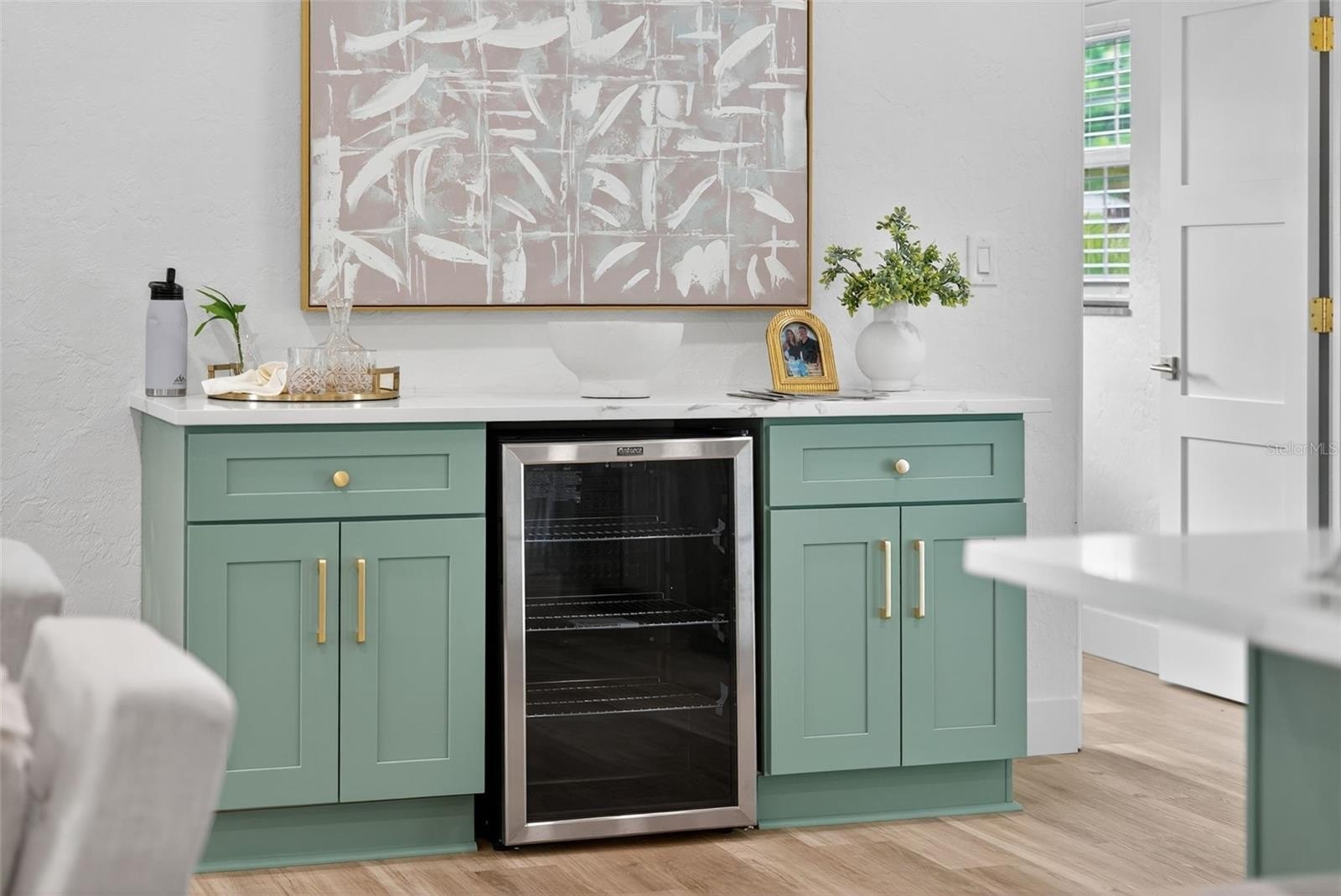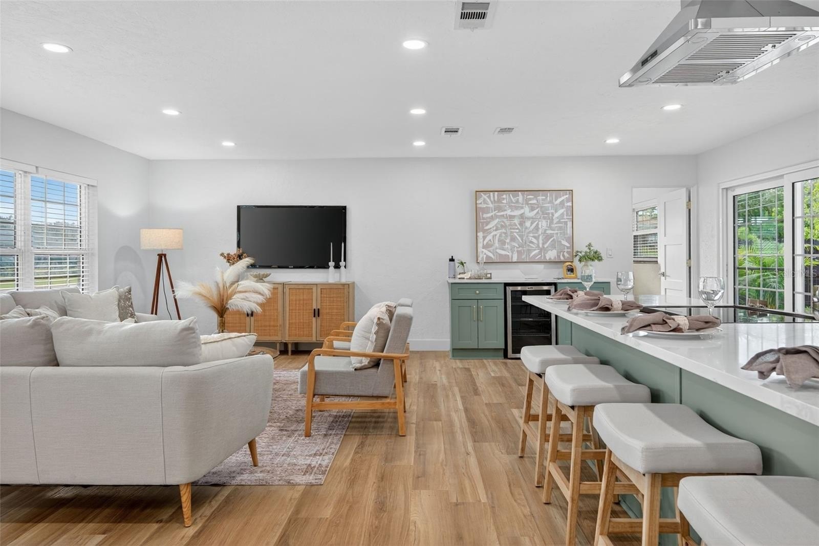 Step inside to discover a thoughtfully designed split-bedroom floor plan offering two guest bedrooms on one side of the home and a private primary suite on the other. The primary retreat features a gorgeous en-suite bathroom with a walk-in shower, dual vanity, and custom closets with built-in storage. The two additional bedrooms are generously sized and include built-in closet systems, sharing a beautifully updated hallway bath. A convenient interior laundry room and abundant storage, including multiple hallway closets and a large pantry, add everyday functionality. The open-concept living, dining, and kitchen areas flow seamlessly together, creating the perfect environment for relaxing or entertaining. Two sliding doors open to the covered lanai and backyard, extending your living space outdoors. The kitchen offers an organic yet contemporary vibe with muted green lower cabinets, crisp white uppers, stunning quartz countertops, and a full suite of new stainless steel appliances. A chic dry bar with a wine cooler and beverage fridge is perfectly positioned for entertaining or unwinding after a long day. Every detail of this home has been upgraded in 2025, including a new roof, HVAC system and ductwork, plumbing, water heater, PGT windows, and a stylish new front door with sidelights. Freshly painted inside and out, this home is truly move-in ready! Located in a high-and-dry, flood zone X area, this home is just minutes from the Gulf beaches, walking distance to schools, and close to shopping, dining, and entertainment. Downtown St. Pete is a quick 15-minute drive away, with both TPA and PIE airports approximately 30 minutes from your doorstep.