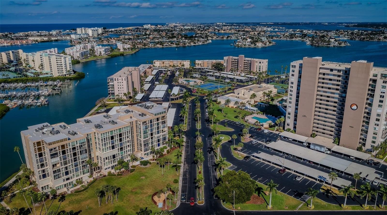 One or more photo(s) has been virtually staged. WELCOME TO BAY ISLAND...THE GEM OF SOUTH PASADENA. This spacious, light and bright corner unit offers 2 spacious bedrooms, 2 bathrooms, and an office with a built-in desk. The bedrooms are both en-suite. The primary suite features a large walk-in closet. The primary suite has the feeling of being in a tropical oasis with plantation shutters and floor to ceiling windows. Storage is plentiful in the second suite, which includes five closets. Water views from all windows. The kitchen offers a tray ceiling, new refrigerator (2019), new dishwasher (2024), and new oven (2025). The thoughtful layout of this condo creates an impression of expansive living. Stone tile flooring in living room and dining room. The entire condo was freshly painted October 2025. The Admiral building has passed the Milestone Inspection and Structural Integrity Report providing you peace of mind. Bay Island is a vibrant community offering resort-style amenities: cable, internet, WIFI, trash, water, sewer, flood insurance included. Along with a 24-hour guarded security gate. The clubhouse features a ballroom, kitchen, saunas, arts and crafts studio, library, game rooms, billiards and social areas. Outdoor features include two spas, six heated pools, tennis courts, pickle ball courts, grill stations, fishing docks, marina and boat slips (boat slips purchased separately). Surrounding the entire Bay Island complex is a waterfront walking trail. Two small pets are allowed (under 15 lbs). Bay Island is ideally located just minutes to St. Pete Beach and Treasure Island. A small shopping center is located just outside the guard gate with restaurants, hair salon, etc. A short 10-minute walk over the Corey Bridge brings you to Horan Park, which offers bands and festivities on the weekends. The Corey Avenue Sunday Market offers fresh fruit and fresh produce among other items. Corey Avenue offers restaurants, bars, nightlife, shopping, and the Beach Theater. An HCA hospital is located in South Pasadena. Downtown St. Petersburg is a short 20-minute drive. St. Petersburg offers many museums, art galleries, shopping, sports activities, festivals, restaurants, and nightlife. St. Pete-Clearwater International Airport and Tampa International Airport both a short distance from South Pasadena. Come and live the dream in this gorgeous condo.