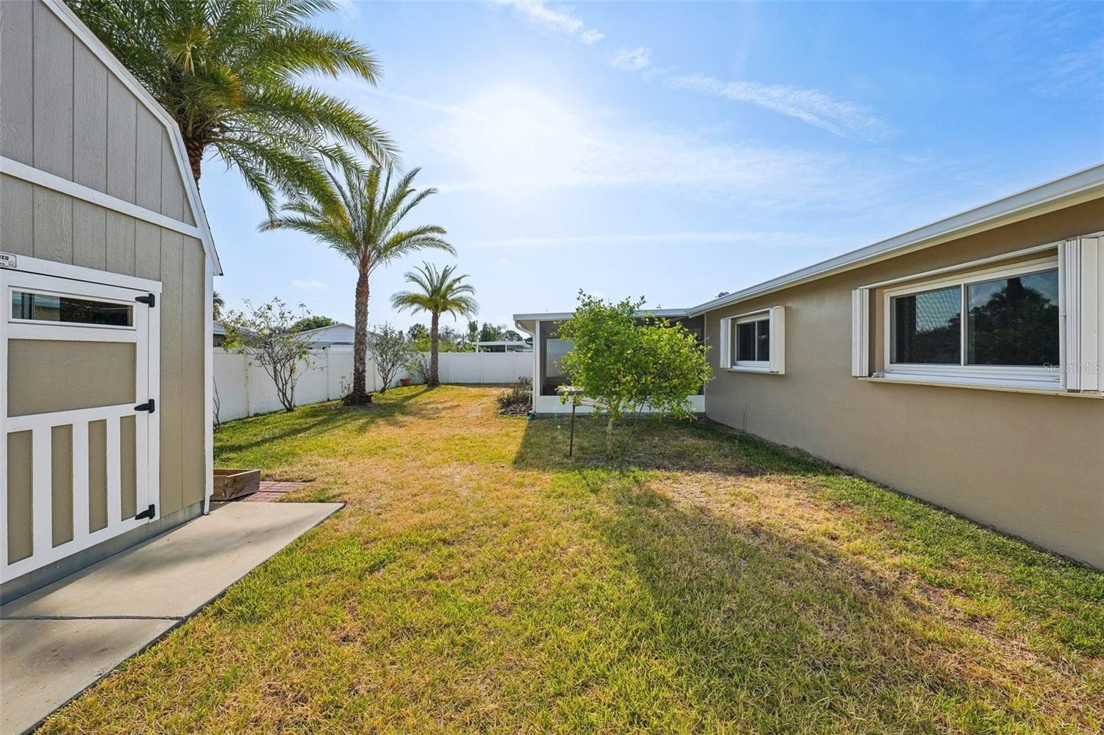 Two sets of FRENCH DOORS open to a SPACIOUS SCREENED-IN BACK PORCH, perfect for entertaining or relaxing while enjoying the FLORIDA BREEZE. The PRIVATE, FULLY FENCED VINYL BACKYARD offers plenty of space for play or pets and includes a CONVENIENT STORAGE SHED. A CIRCULAR DRIVEWAY provides ample parking and easy access.