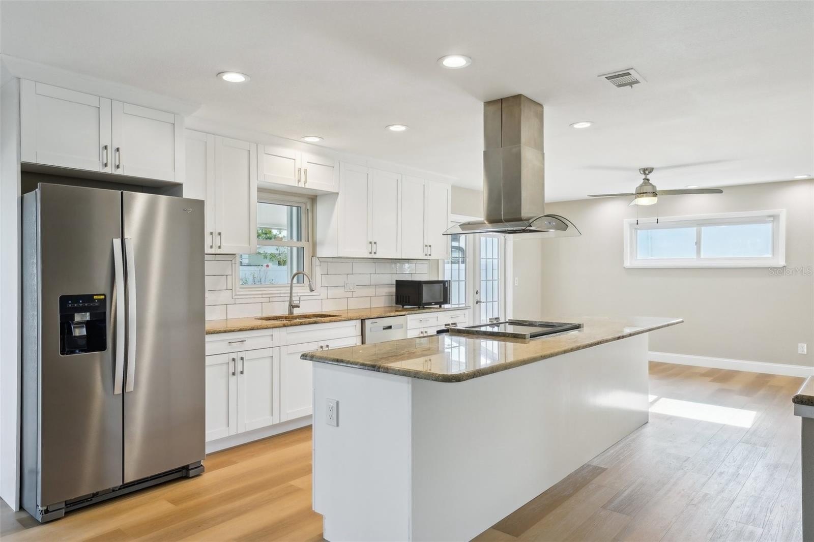The GOURMET KITCHEN is the showpiece of the home, boasting a LARGE CENTER ISLAND with cooktop and sleek range hood, GRANITE COUNTERTOPS, DESIGNER TILE BACKSPLASH, and STAINLESS-STEEL APPLIANCES. Both bathrooms have been beautifully remodeled with CUSTOM TILE SHOWER DESIGNS and STYLISH FIXTURES.