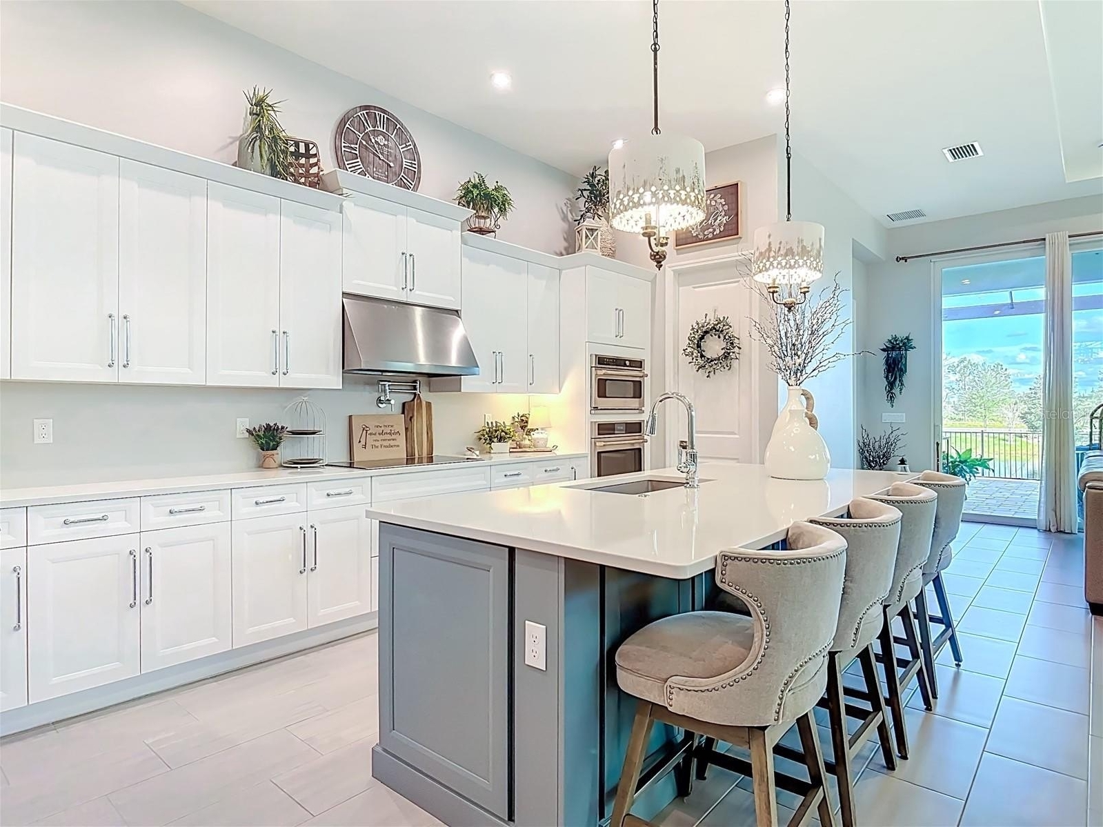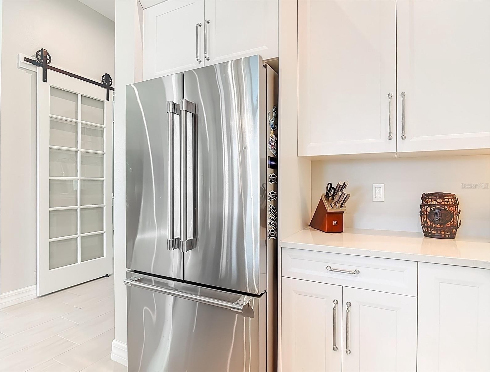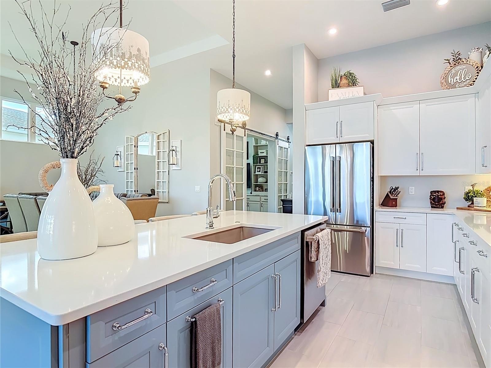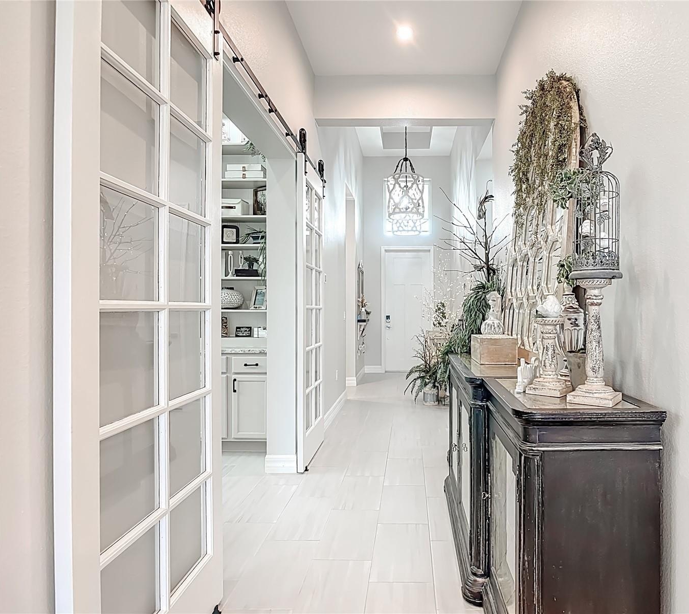 The gourmet kitchen is a showpiece designed for both everyday living and entertaining. It features a custom island wrap, pot filler, stunning chandeliers, included barstools, and a pantry with custom shelving and a beverage fridge. All appliances stay. A flex room with custom-built-ins and barn doors offers the ideal space for a home office or creative retreat.