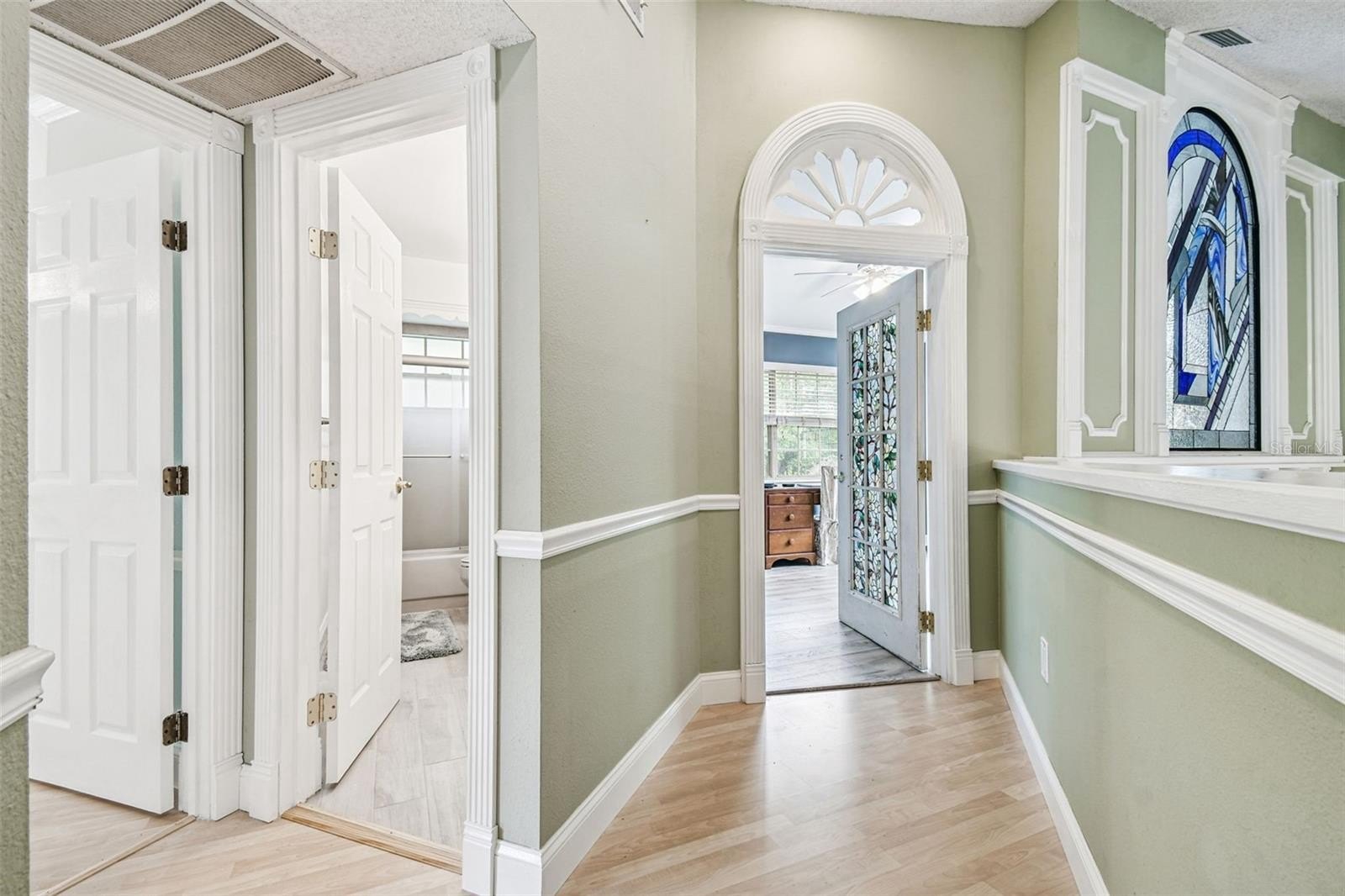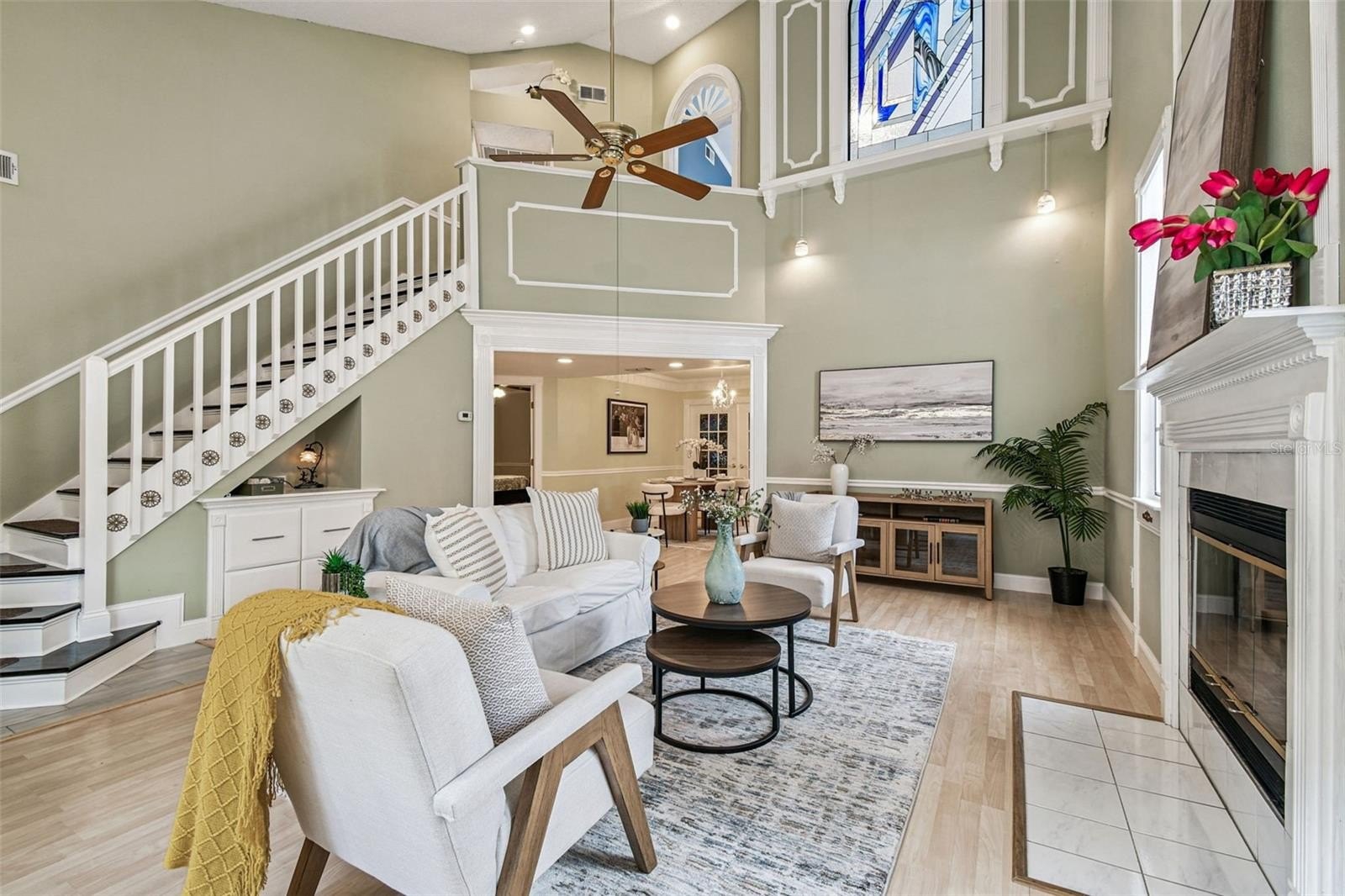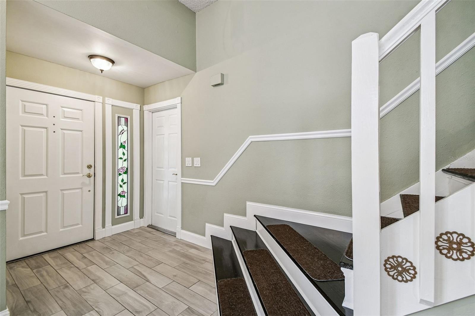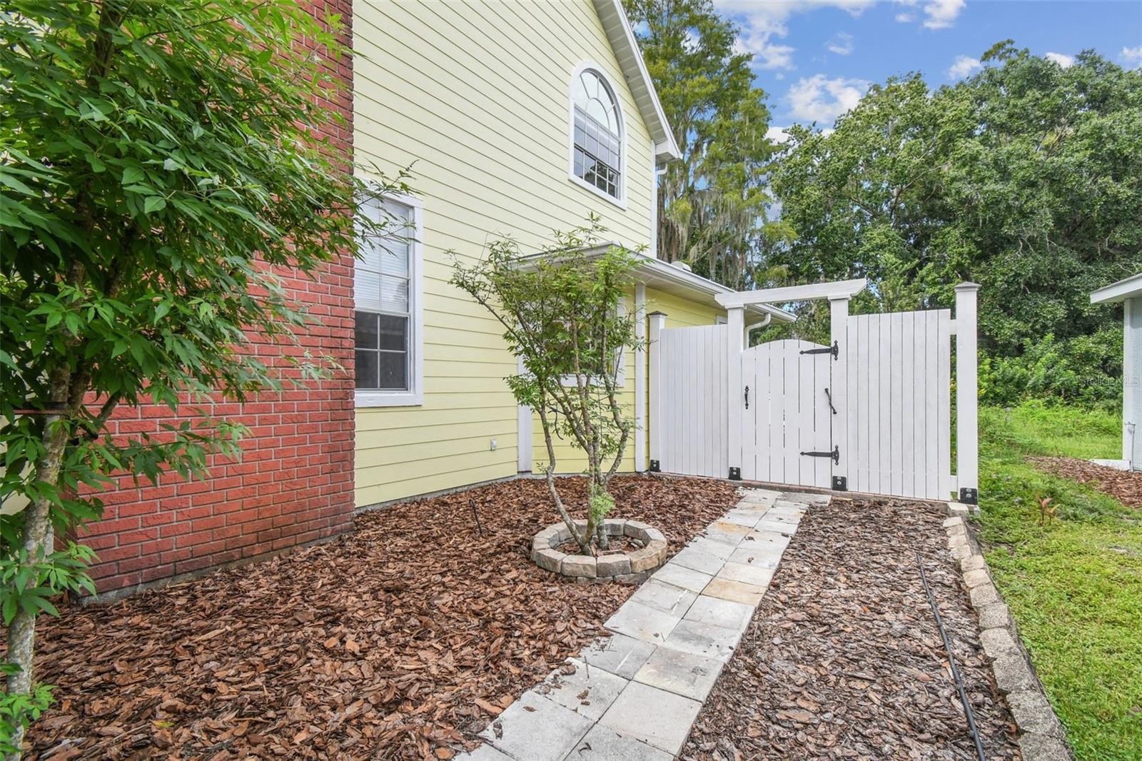 Tired of cookie-cutter homes? You MUST SEE this distinct and exquisite 3 bedroom plus office/bonus/ or 4th bedroom (no closet), 2.5 bathroom, 2 car garage, two-story home located in beautiful Nature's Hideaway, centrally located in New Port Richey/Trinity, FL. Old charm mixed with modern design is sure to please! Charming yellow exterior covered front porch and paver walkway is the ideal welcoming for your guests. Open the doors to the breath-taking 2-story high ceilings- 20 ft- open floor plan and amazing hardwood staircase. Focal point of the living room is the WOOD burning fireplace with mantle, brick chimney, and detailed trim. Stained glass insert will for sure be a conversation piece. The home provides an inclusive and cozy feel with tons of bright lights. All windows have custom trim and you can see the intricate trim details as you walk throughout this "old world charm" home. Dining room connects to the living room for easy entertaining. Surround sound in place. Tucked in the back for privacy is the primary retreat with ensuite. This very spacious room offers a french door entry and french doors to the covered back porch. Newly remodeled ensuite has dual sinks, walk-in tiled shower with durable corian base, a walk-in closet and garden tub. Tastefully done and with a modern touch. 1/2 bath on main floor for guests. The kitchen has been remodeled with can lighting, extensive trim work, custom backsplash, sparkling quartz counter tops, stainless steel appliances, and light and bright 42 inch cabinets/drawers. Beautiful views of the outdoors from the bumped out bay windows trimmed with custom woodwork. Pantry is a walk-in with a barn door. Upstairs you have 2 spacious bedrooms and a flex/bonus/office space. This could easily be a 4th bedroom. This unique area has the stained glass window that has been inserted into a built-in bookcase and has a vaulted ceiling. The 2nd FULL bathroom is shared and has been remodeled as well. The balcony overlooking the main floor is captivating. Outdoor provides a partially fenced-in yard with detached shed/workshop and can be whatever your lifestyle desires! Currently a beautiful garden takes over bringing color and solitude. This perfect home is located near medical, grocery, restaurants, entertainment, and shopping. A-rated schools. Newer roof 2024, gutters, all appliances stay. Garage does have a security side door. NO CARPET! NO CDD, LOW HOA, NO FLOOD ZONE. Please make sure to view the virtual walk through video.