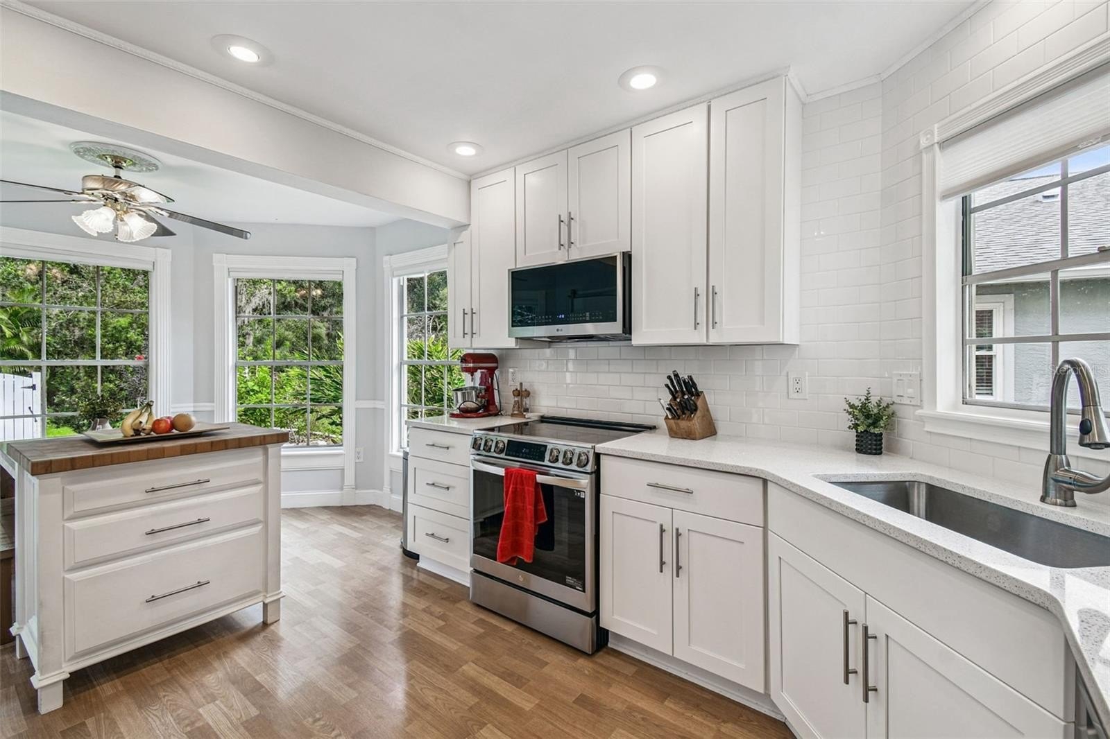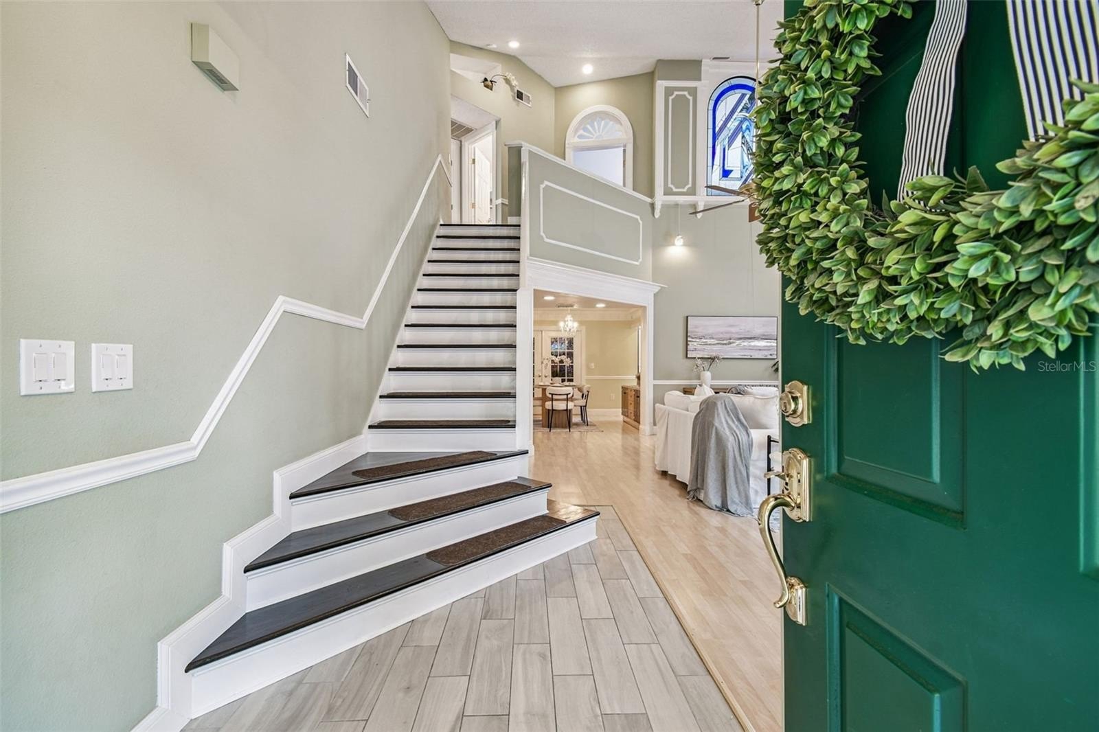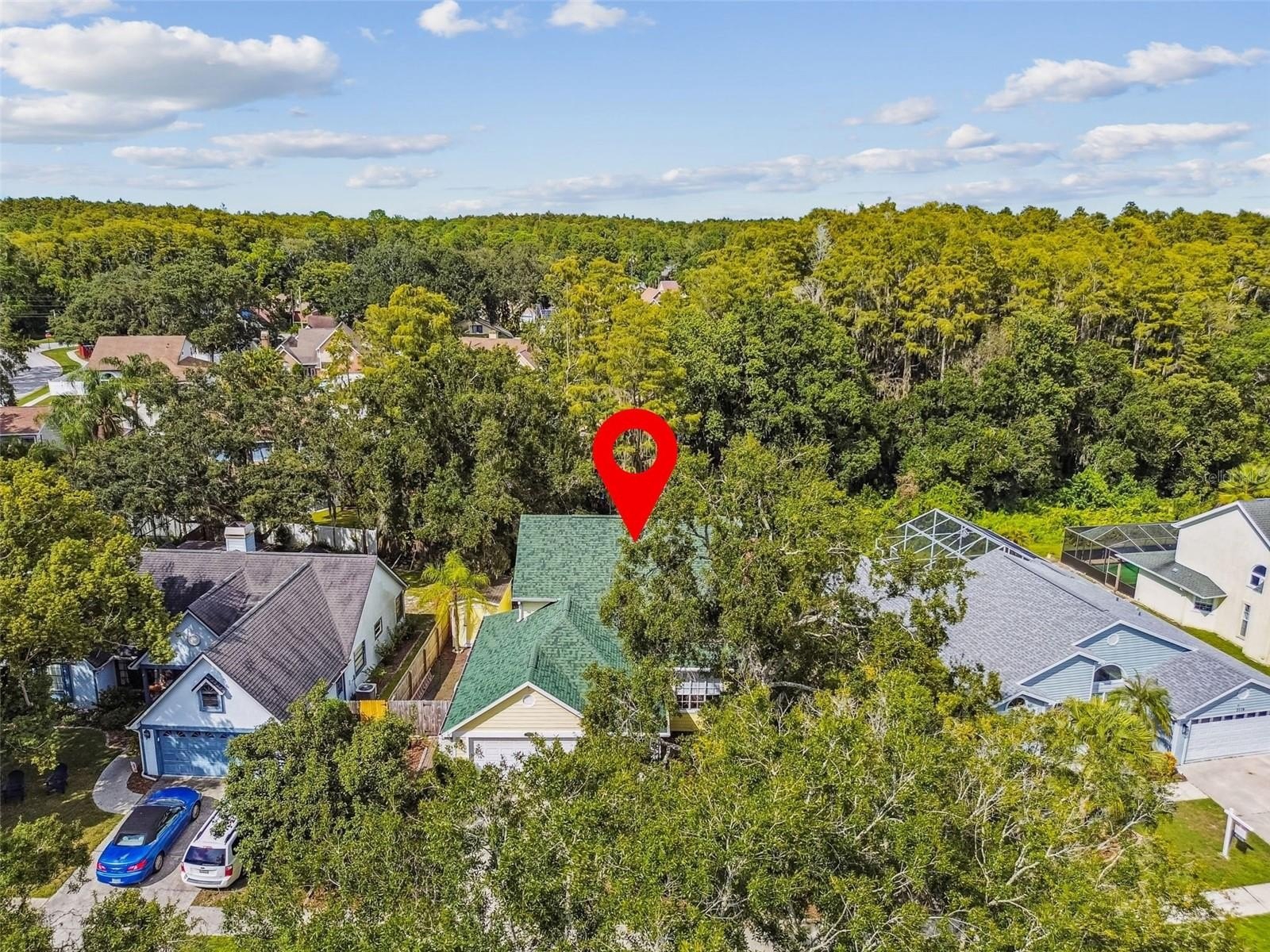 Tired of cookie-cutter homes? You MUST SEE this distinct and exquisite 3 bedroom plus office/bonus/ or 4th bedroom (no closet), 2.5 bathroom, 2 car garage, two-story home located in beautiful Nature's Hideaway, centrally located in New Port Richey/Trinity, FL. Old charm mixed with modern design is sure to please! Charming yellow exterior covered front porch and paver walkway is the ideal welcoming for your guests. Open the doors to the breath-taking 2-story high ceilings- 20 ft- open floor plan and amazing hardwood staircase. Focal point of the living room is the WOOD burning fireplace with mantle, brick chimney, and detailed trim. Stained glass insert will for sure be a conversation piece. The home provides an inclusive and cozy feel with tons of bright lights. All windows have custom trim and you can see the intricate trim details as you walk throughout this "old world charm" home. Dining room connects to the living room for easy entertaining. Surround sound in place. Tucked in the back for privacy is the primary retreat with ensuite. This very spacious room offers a french door entry and french doors to the covered back porch. Newly remodeled ensuite has dual sinks, walk-in tiled shower with durable corian base, a walk-in closet and garden tub. Tastefully done and with a modern touch. 1/2 bath on main floor for guests. The kitchen has been remodeled with can lighting, extensive trim work, custom backsplash, sparkling quartz counter tops, stainless steel appliances, and light and bright 42 inch cabinets/drawers. Beautiful views of the outdoors from the bumped out bay windows trimmed with custom woodwork. Pantry is a walk-in with a barn door. Upstairs you have 2 spacious bedrooms and a flex/bonus/office space. This could easily be a 4th bedroom. This unique area has the stained glass window that has been inserted into a built-in bookcase and has a vaulted ceiling. The 2nd FULL bathroom is shared and has been remodeled as well. The balcony overlooking the main floor is captivating. Outdoor provides a partially fenced-in yard with detached shed/workshop and can be whatever your lifestyle desires! Currently a beautiful garden takes over bringing color and solitude. This perfect home is located near medical, grocery, restaurants, entertainment, and shopping. A-rated schools. Newer roof 2024, gutters, all appliances stay. Garage does have a security side door. NO CARPET! NO CDD, LOW HOA, NO FLOOD ZONE. Please make sure to view the virtual walk through video.