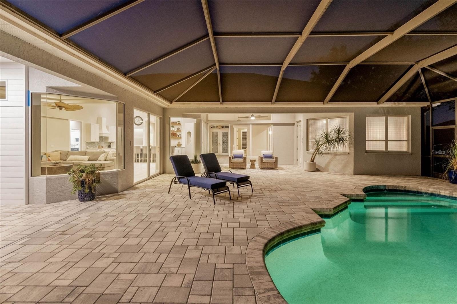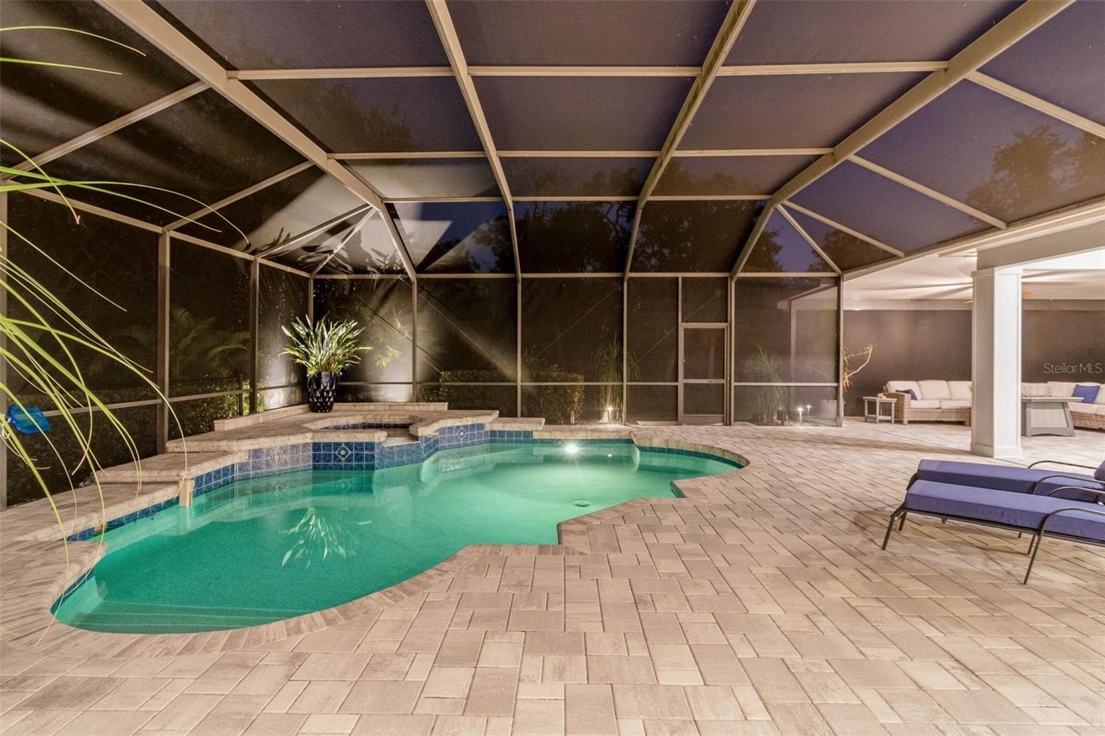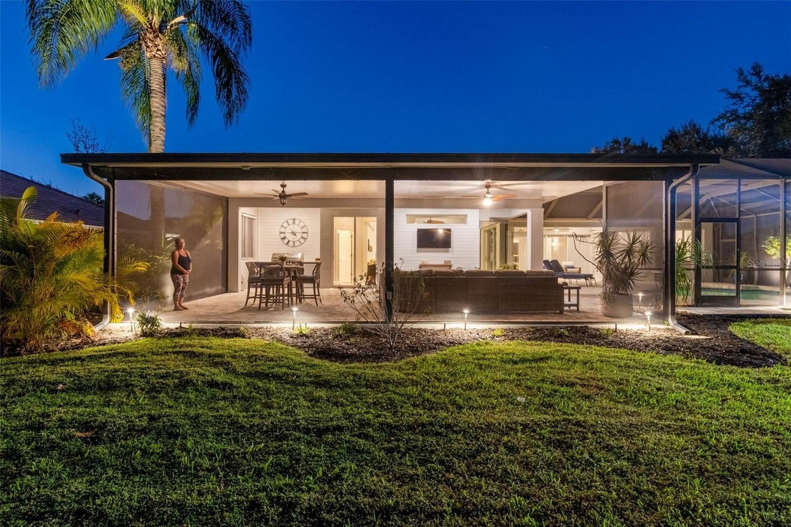 The living room opens completely to the lanai — perfect for enjoying Florida’s indoor/outdoor lifestyle. Step outside to your private saltwater pool and spa, surrounded by new pavers and lush professional landscaping (2025). The covered lanai was expanded by 500 sq. ft. and enhanced with an outdoor kitchen, updated irrigation system, and new professional lighting, ideal for hosting gatherings or relaxing in total privacy with no rear neighbors.