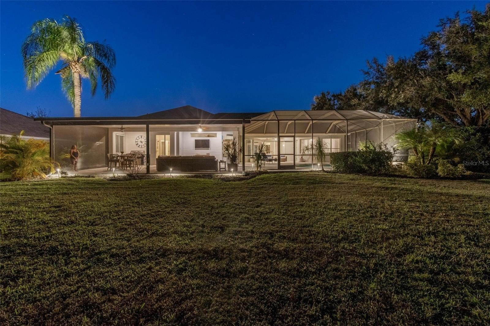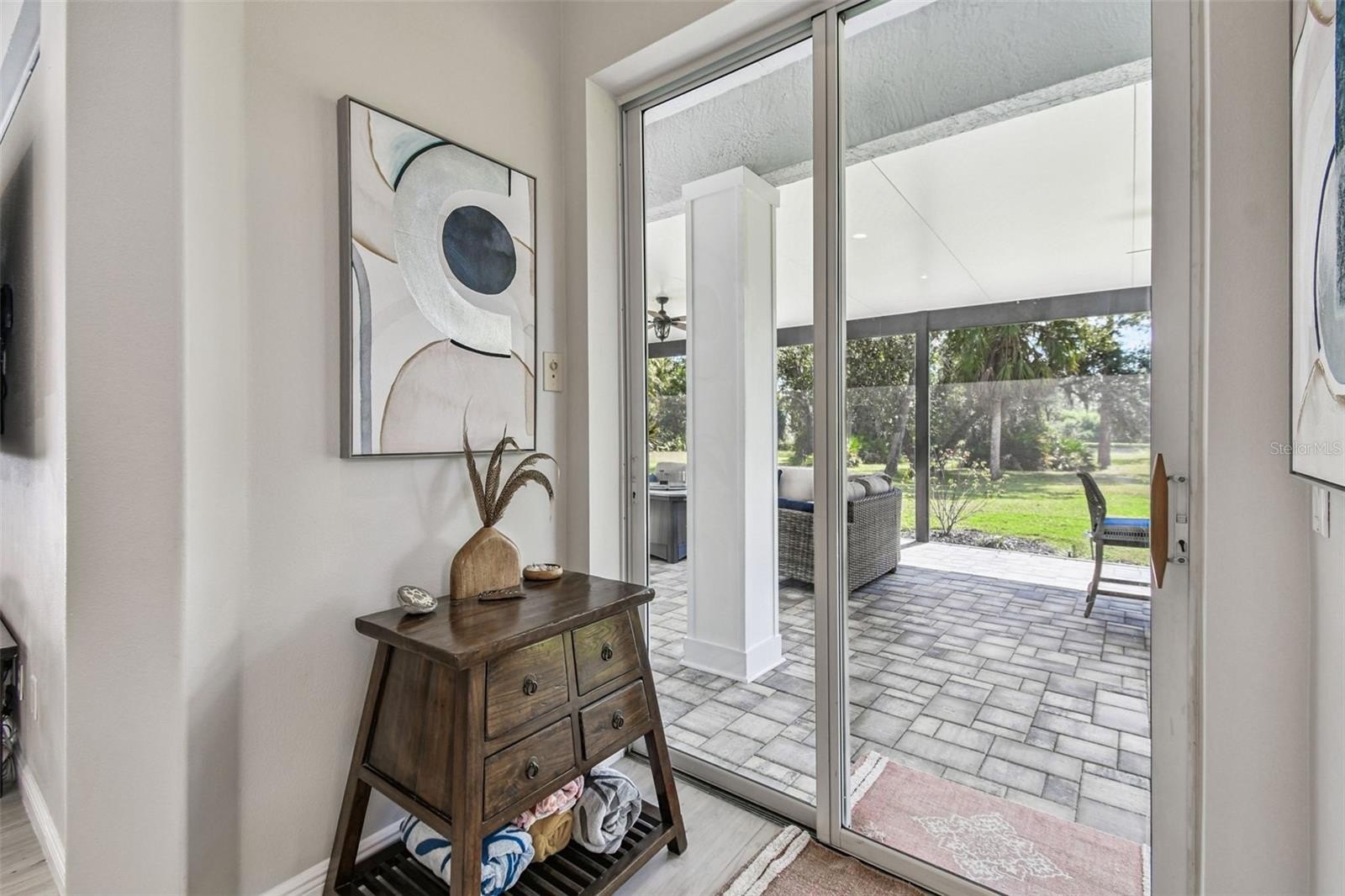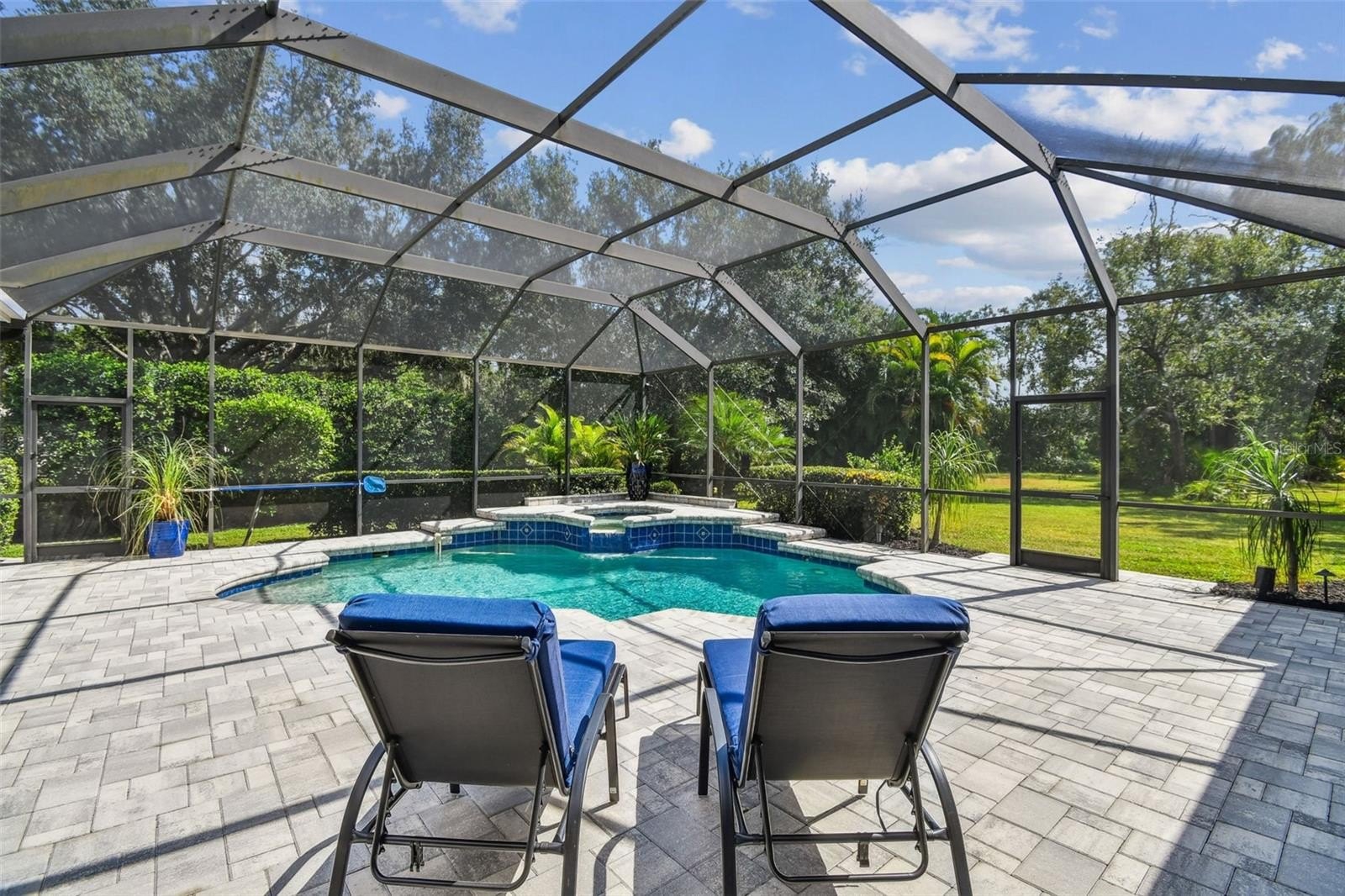 The living room opens completely to the lanai — perfect for enjoying Florida’s indoor/outdoor lifestyle. Step outside to your private saltwater pool and spa, surrounded by new pavers and lush professional landscaping (2025). The covered lanai was expanded by 500 sq. ft. and enhanced with an outdoor kitchen, updated irrigation system, and new professional lighting, ideal for hosting gatherings or relaxing in total privacy with no rear neighbors.