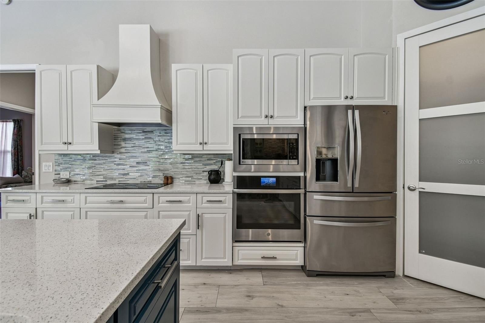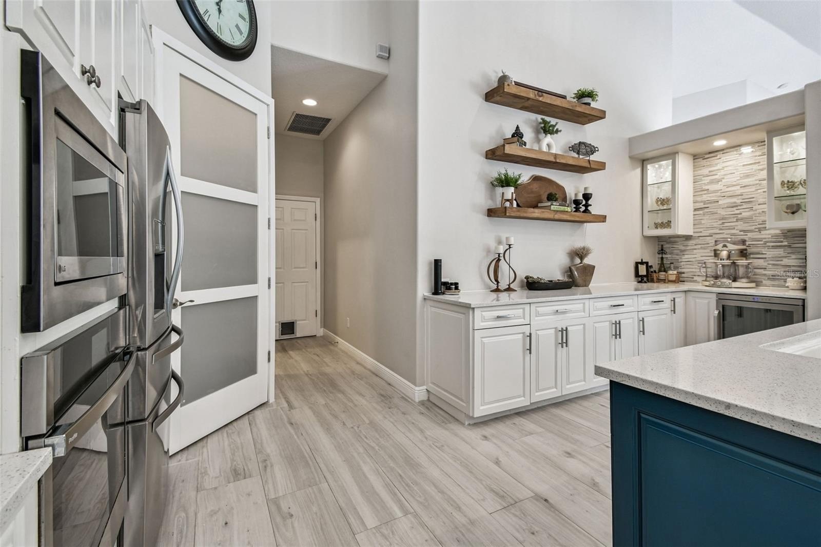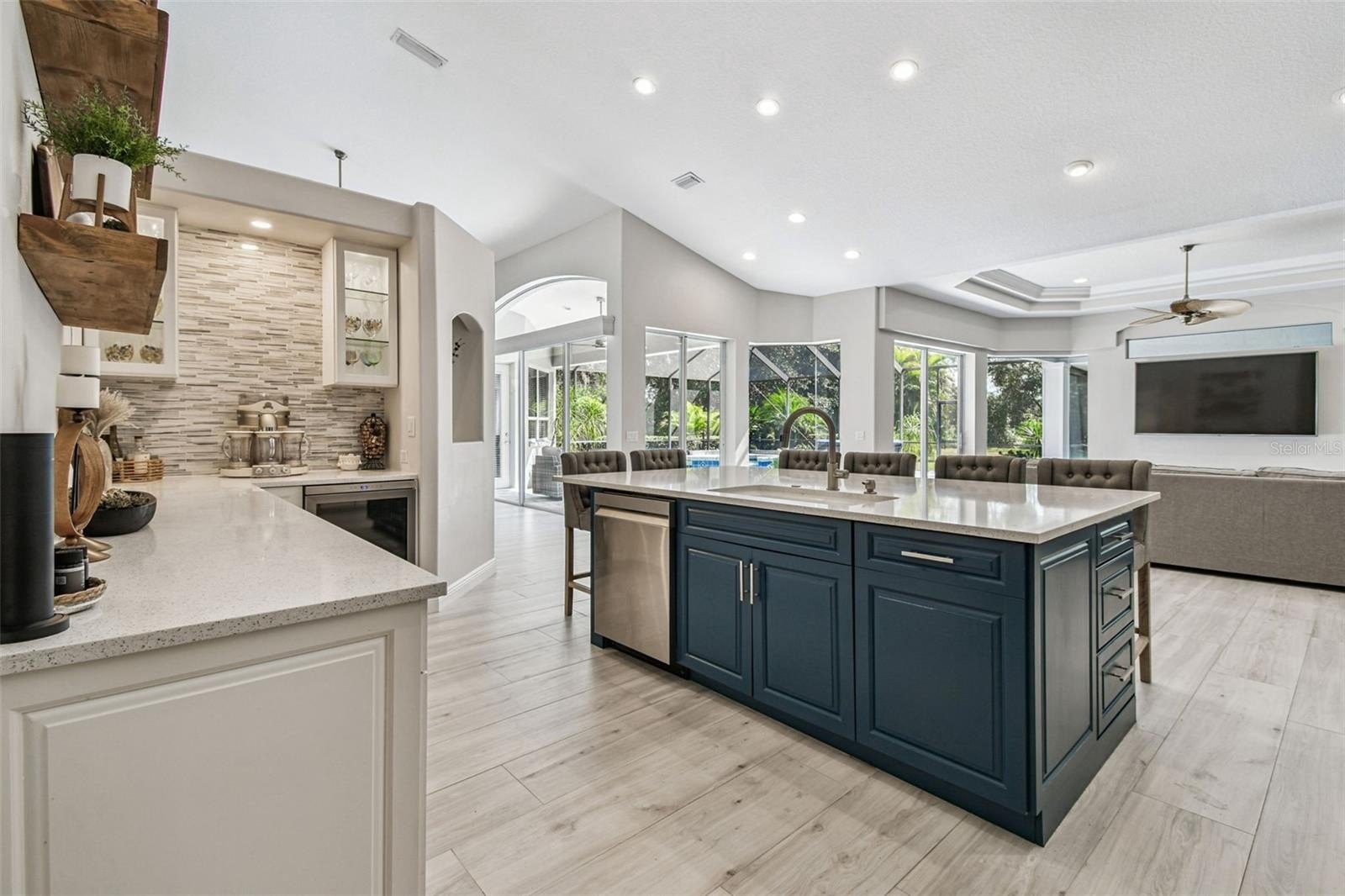 Inside, you’ll immediately sense the light and openness — 16-foot ceilings, double tray details, and fully retractable glass doors that create a seamless indoor-outdoor flow. The expansive kitchen was completely updated with a grand quartz island seating six, sleek “smart” appliances, including a new cooktop, microwave, remote-start oven, dishwasher, and wine cooler. A large dining area — currently used as a flex space or office — can efficiently serve as a formal dining room, craft room, or 4th bedroom.