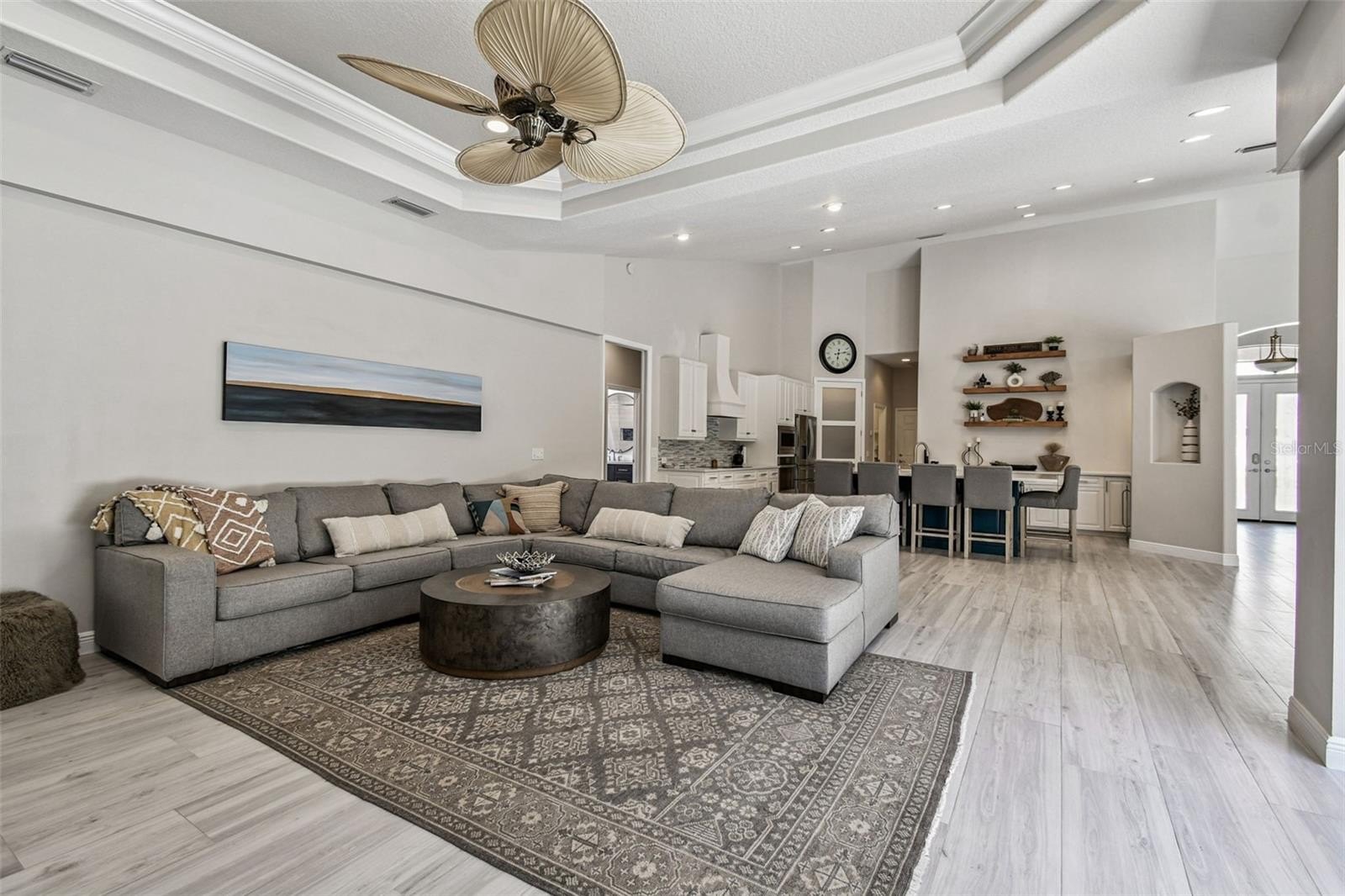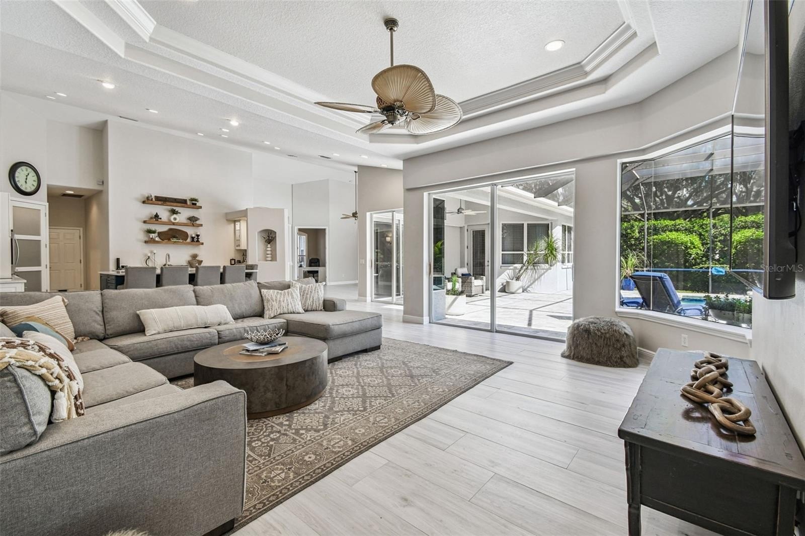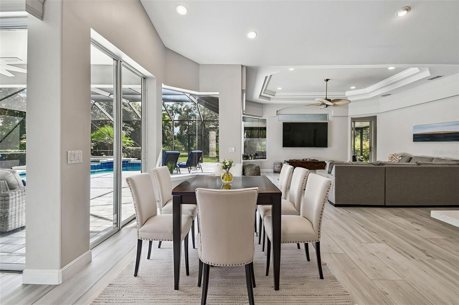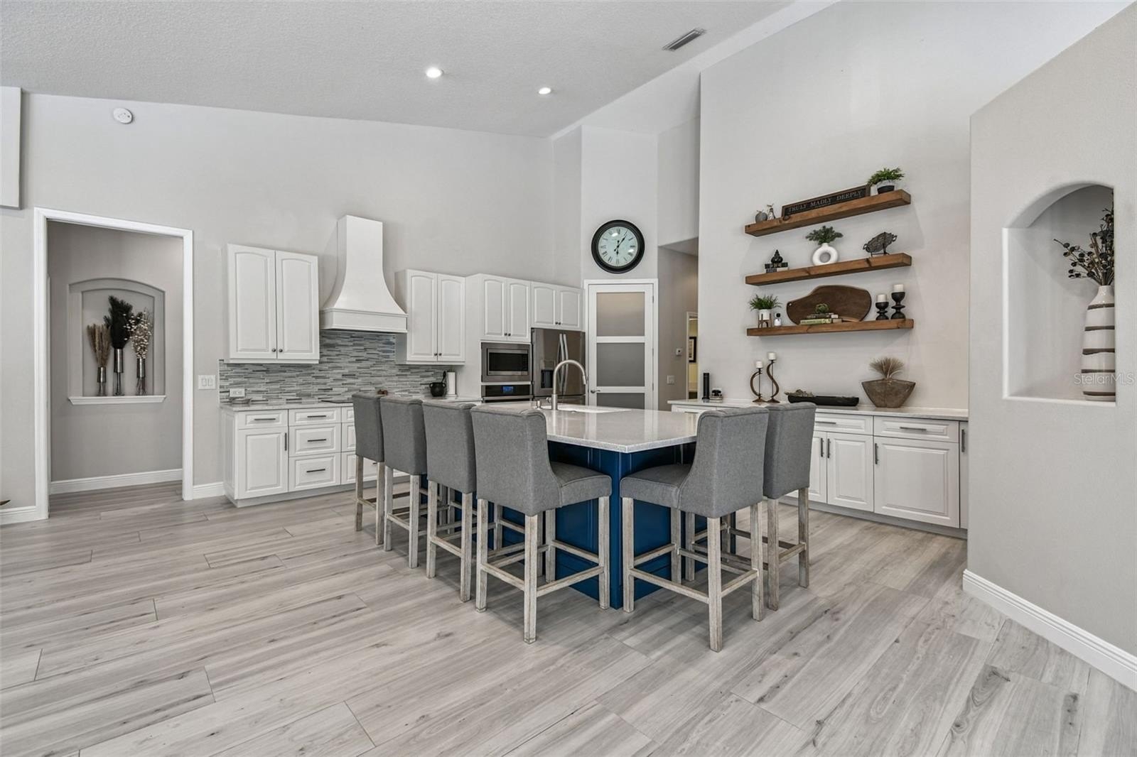 Inside, you’ll immediately sense the light and openness — 16-foot ceilings, double tray details, and fully retractable glass doors that create a seamless indoor-outdoor flow. The expansive kitchen was completely updated with a grand quartz island seating six, sleek “smart” appliances, including a new cooktop, microwave, remote-start oven, dishwasher, and wine cooler. A large dining area — currently used as a flex space or office — can efficiently serve as a formal dining room, craft room, or 4th bedroom.