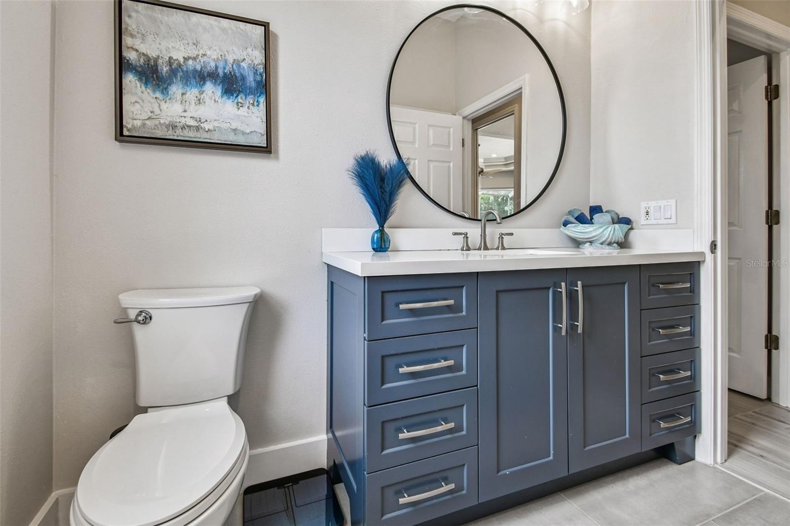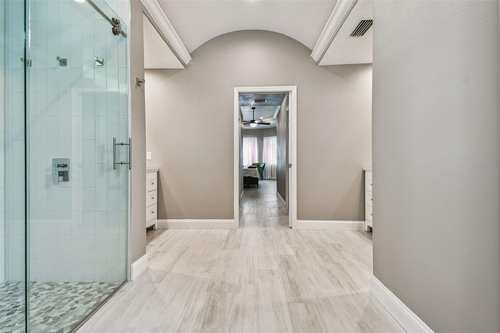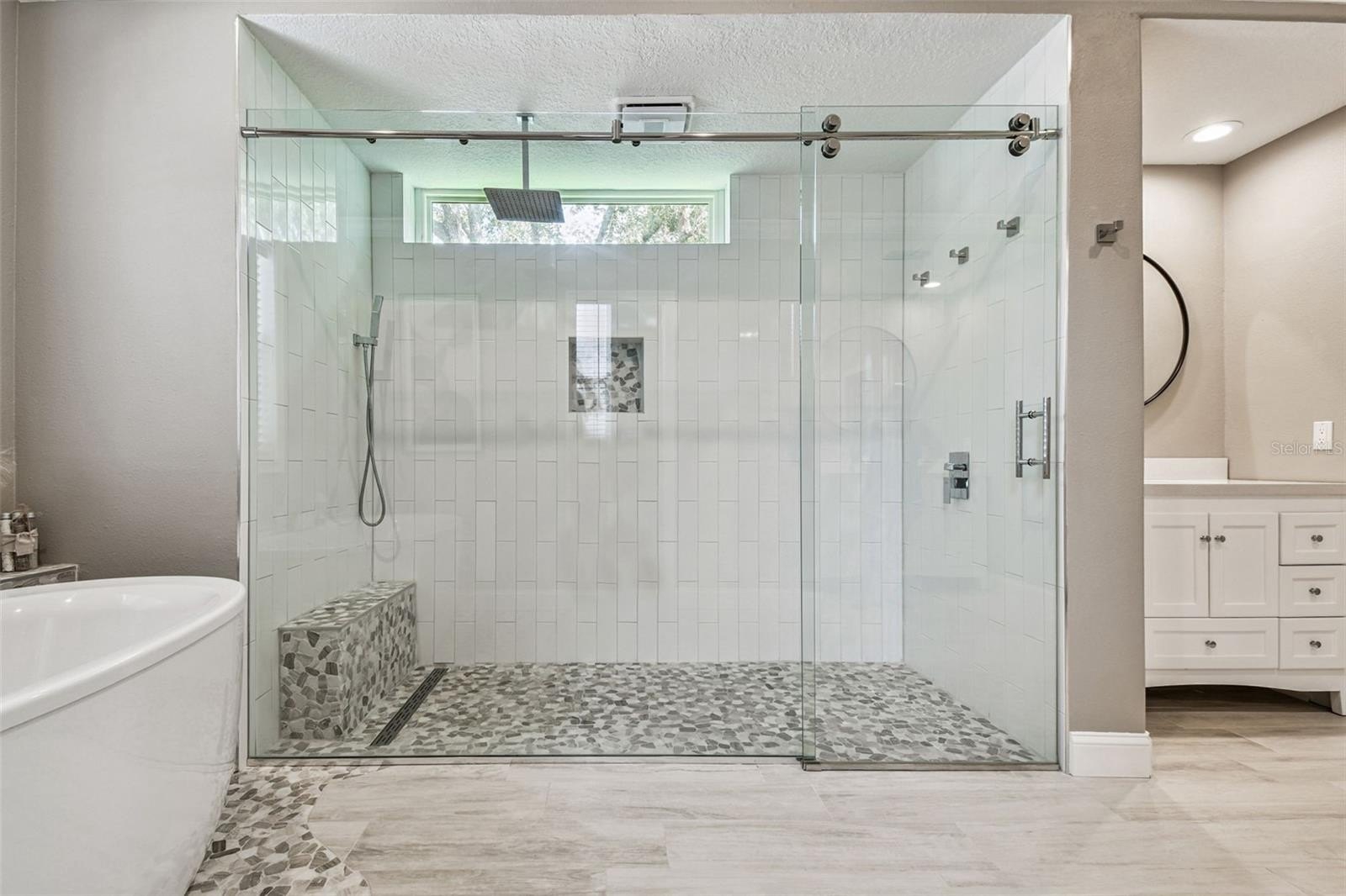 Throughout the home, large-format neutral tile flooring adds warmth and sophistication. The primary suite, remodeled in (2021), is a true retreat featuring a spa-inspired bathroom with new vanities, a frameless glass shower with Bluetooth sound, a deep free-standing soaking tub with waterfall filler, and luxury finishes. The second bedroom also features an ensuite bath updated in (2022) with new tiles and a frameless shower door, while the third bath, updated in (2023), includes large-format glass tile, modern lighting, and a deep-soaking tub.