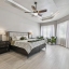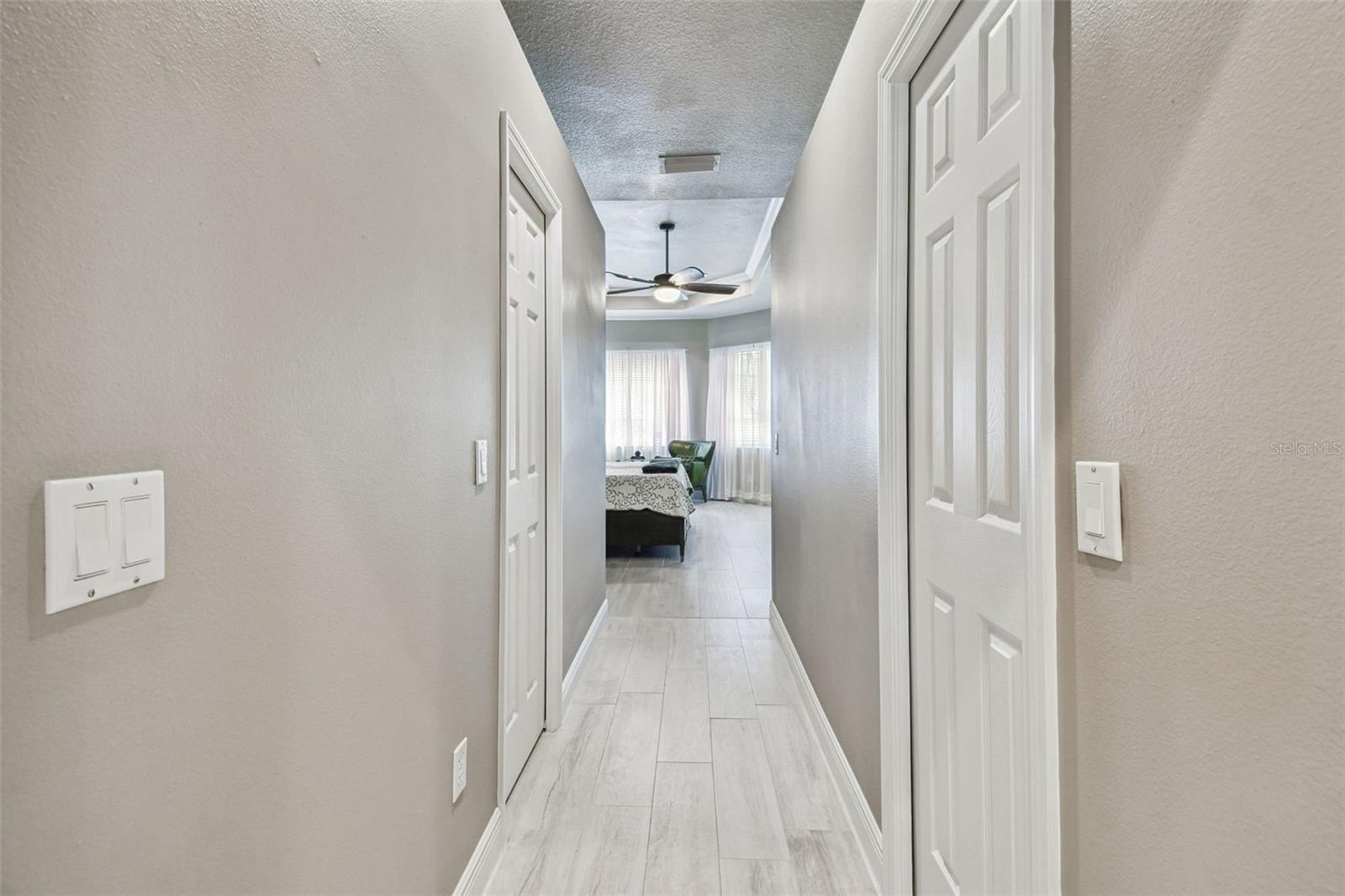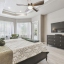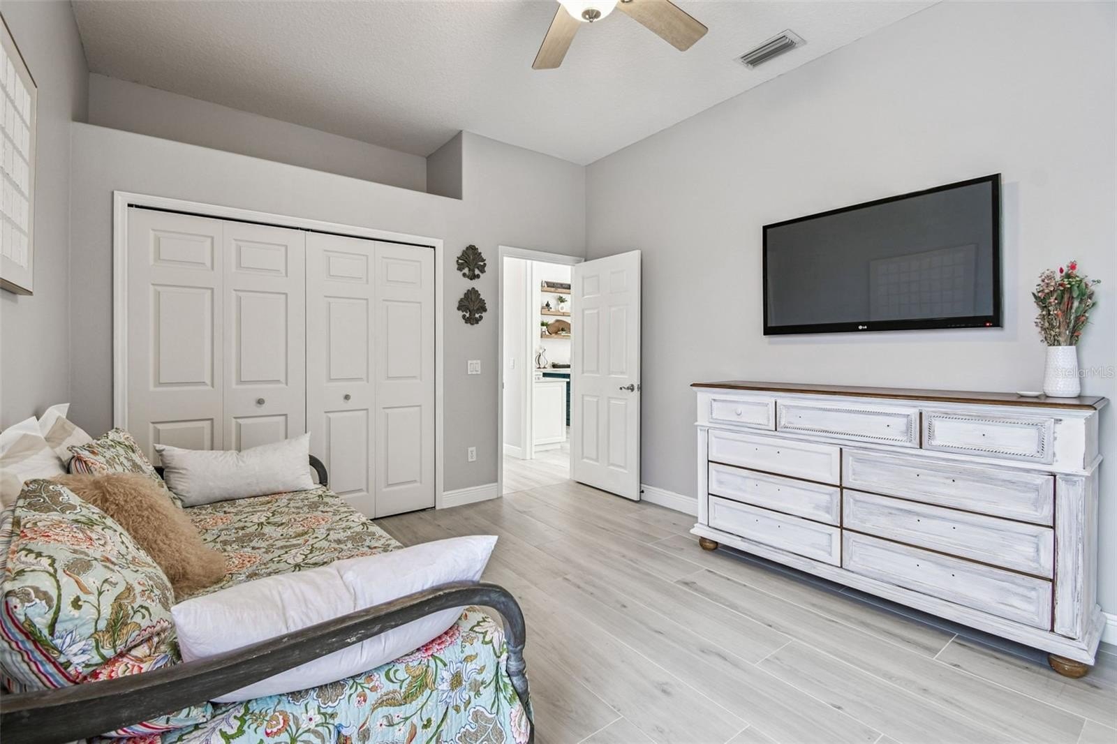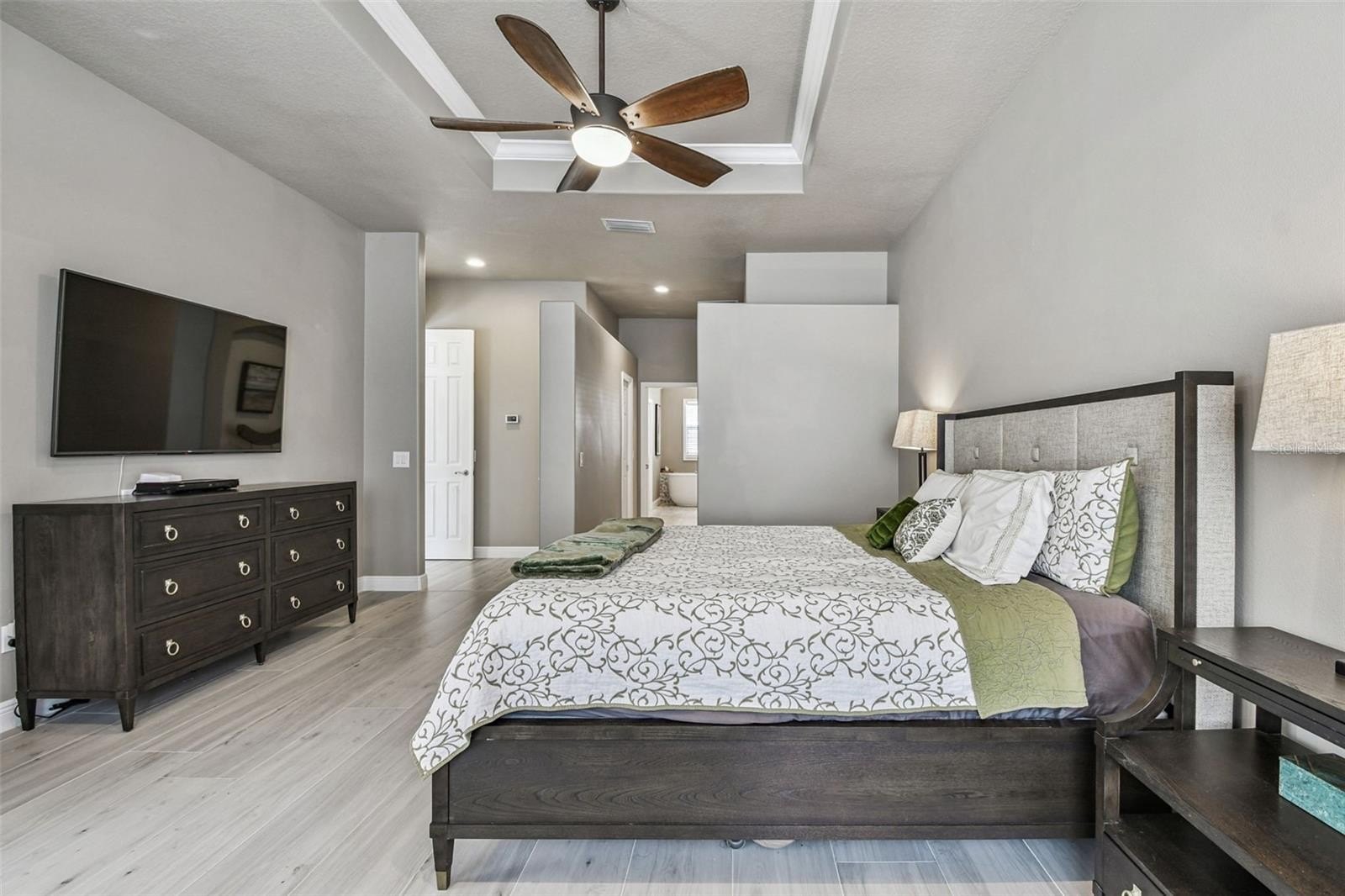 Throughout the home, large-format neutral tile flooring adds warmth and sophistication. The primary suite, remodeled in (2021), is a true retreat featuring a spa-inspired bathroom with new vanities, a frameless glass shower with Bluetooth sound, a deep free-standing soaking tub with waterfall filler, and luxury finishes. The second bedroom also features an ensuite bath updated in (2022) with new tiles and a frameless shower door, while the third bath, updated in (2023), includes large-format glass tile, modern lighting, and a deep-soaking tub.