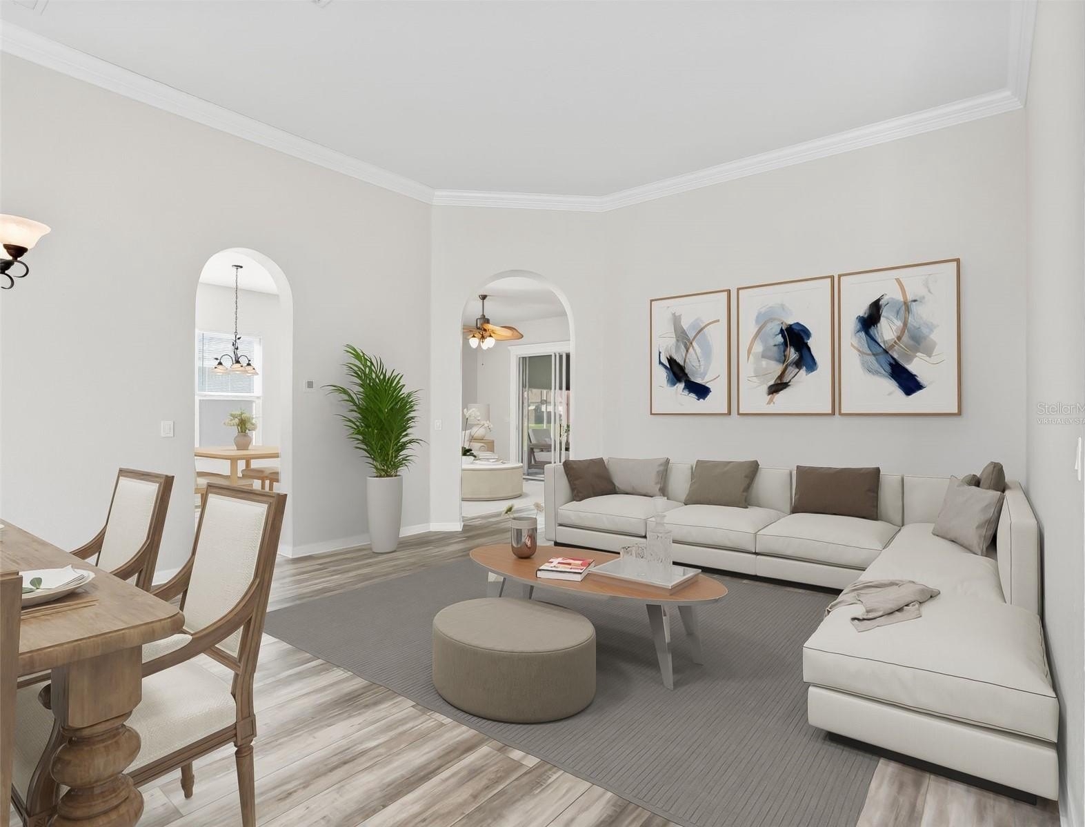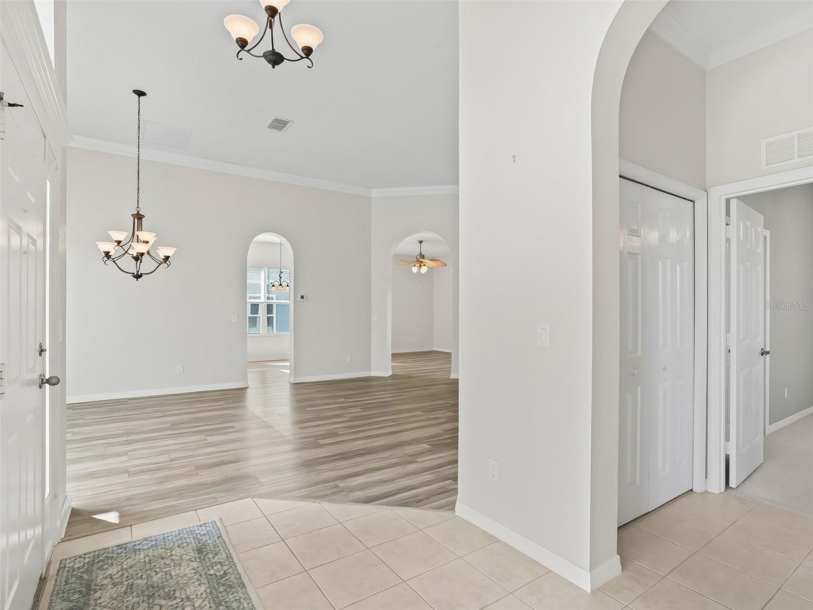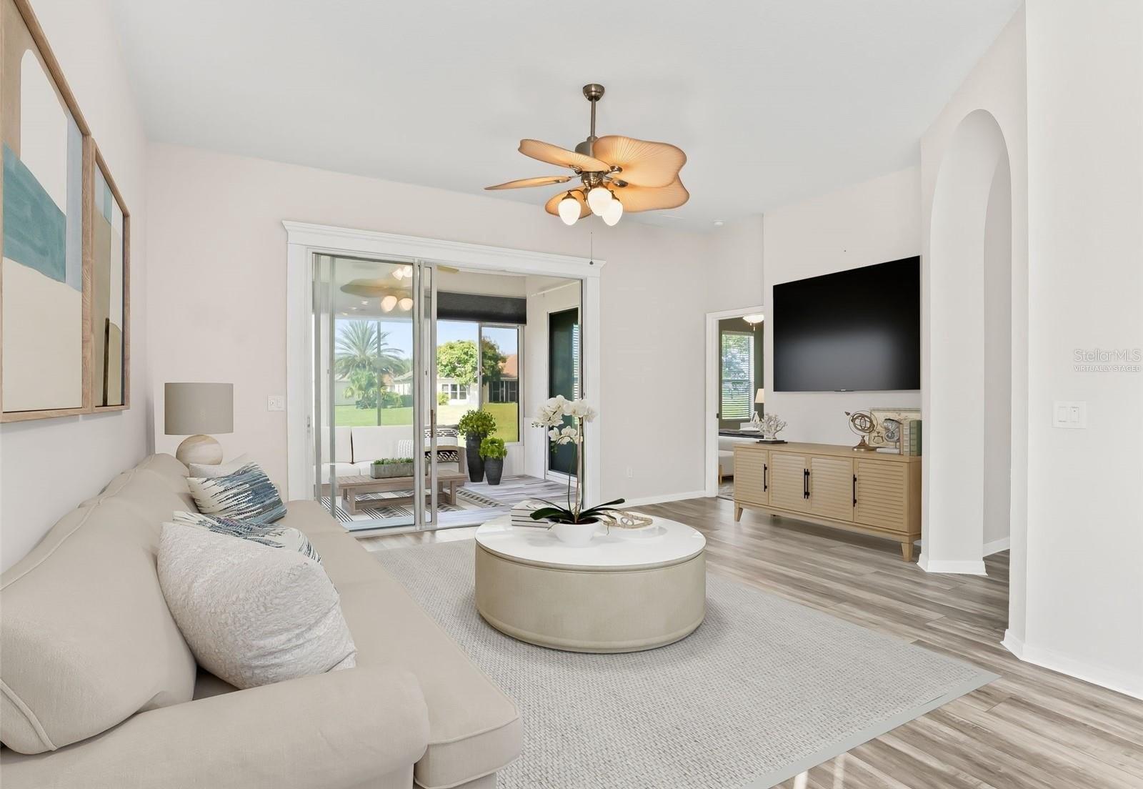 One or more photo(s) has been virtually staged. Entertaining home! Quick close possible! Ideal QUIET location in STONECRESTS' COVETED NEIGHBORHOOD OF OVERLOOK III! LOCATED ON A CUL DE SAC, WITH A larger than usual PARK IN THE CENTER CIRCLE IN THE FRONT OF THE HOME AND THE BACK HAS VIEWS OF THE GOLF COURSE BETWEEN THE 5TH AND THE 17TH GREENS. This home is surrounded by the Championship golf course, offers an open floor plan WHICH INCLUDES A DEN/OFFICE/swing room(sleeping area without a closet) filled with thoughtful upgrades and modern finishes. The kitchen is a chef’s delight, w/ quartz countertops, tall cabinets with over/under and inside remote contolled led colored lighting, a S/S single bowl sink, backsplash, LED recessedlighting, and a newer refrigerator with internal water dispenser* The common living areas offer luxury vinyl plank flooring, while 10’ and 12’ ceilings, crown molding, and arched entryways add elegance. The enclosed FLORIDA ROOM is enhanced with HEAT AND AIR, WHICH ADDS AN ADDITIONAL 192 SF MAKING THIS HOME APPROX. 2,096 SF OF ENJOYABLE SPACE to live and entertain in. The Florida rm. also offers new LVP flooring, 2 sets of sliding glass doors offering 5 panes a glass, energy-efficient remote-controlled sunscreen, wainsott trim and pleated shades, provides the perfect year-round retreat. The oversized garage is a dream come true for the car enthusiast, with golf cart storage space, a mini split A/C (2024), insulated ceiling, pull-down attic stairs, additional electrical outlets, a utility sink, and an electric remote-controlled garage screen AND KEYPAD.**