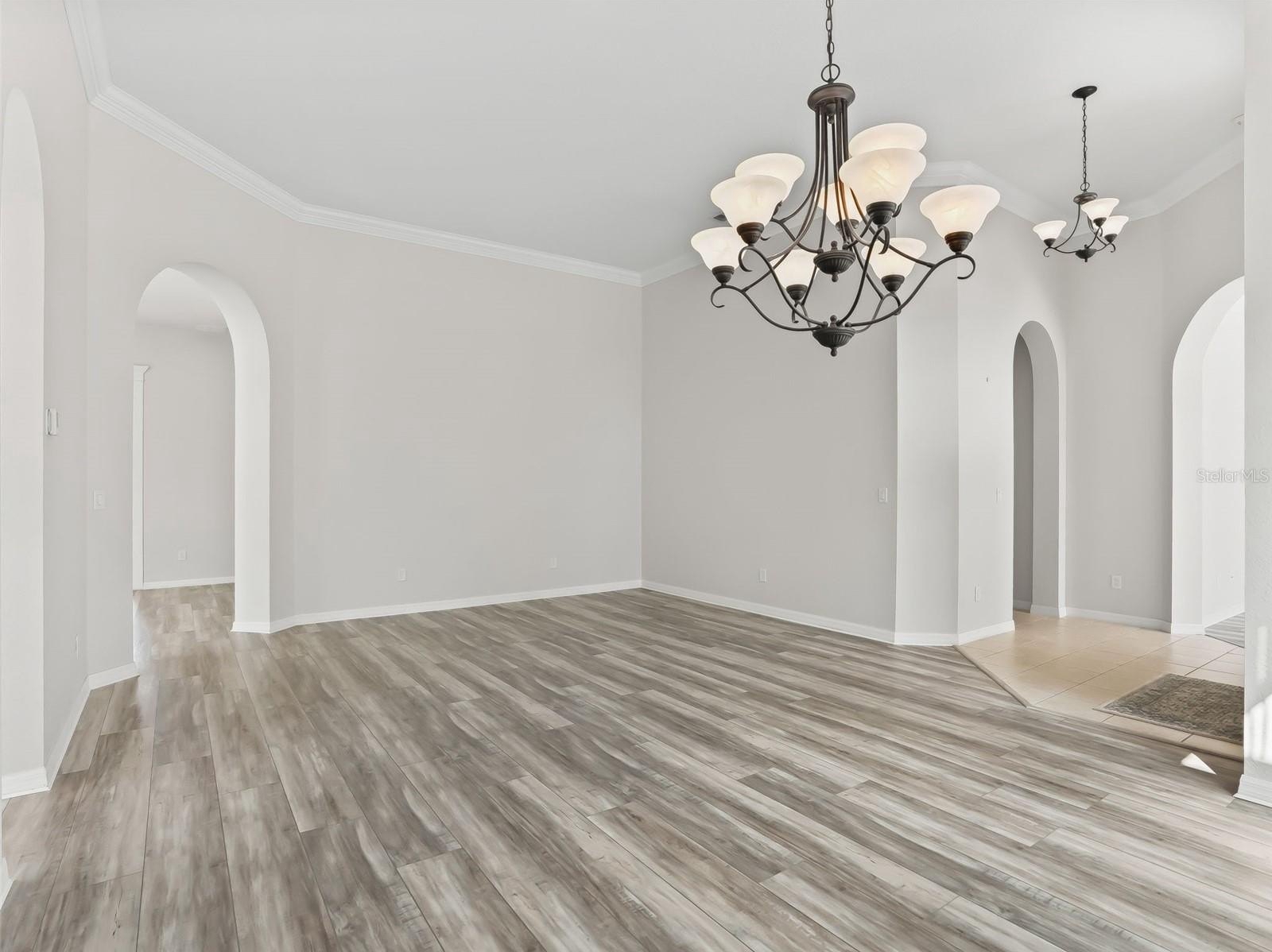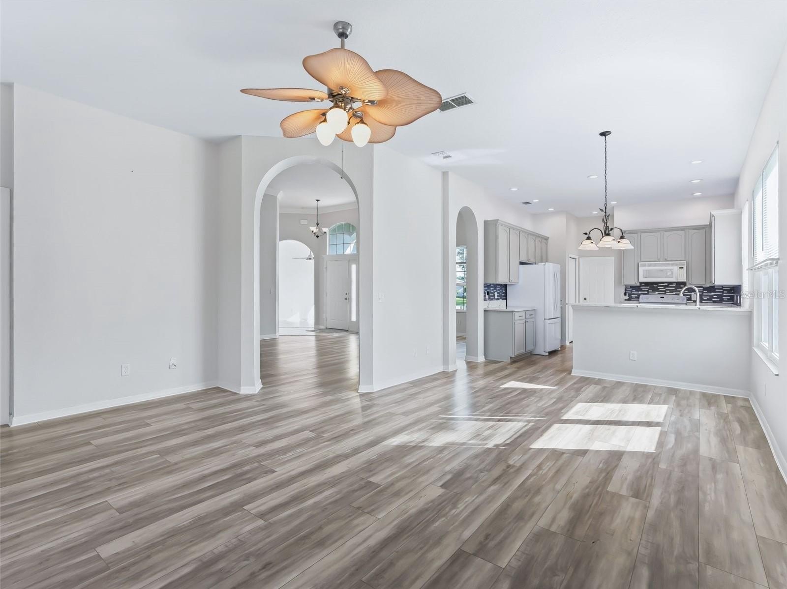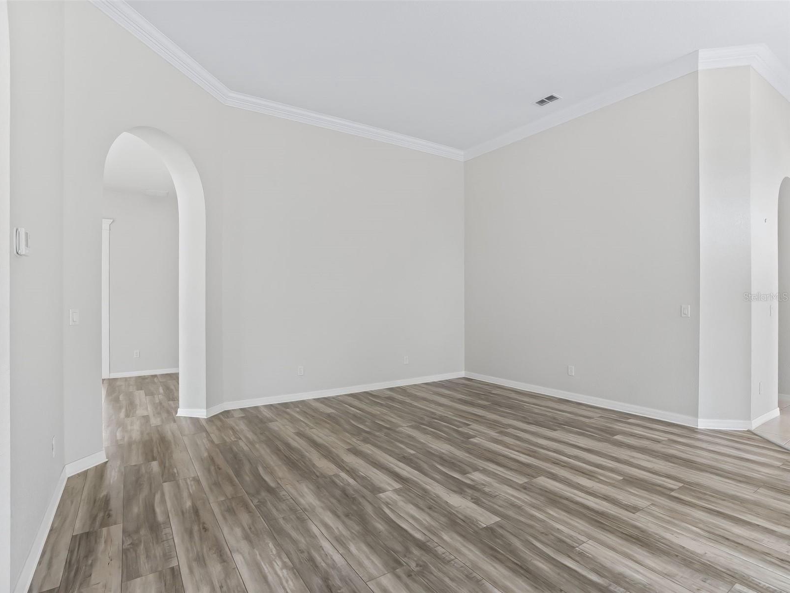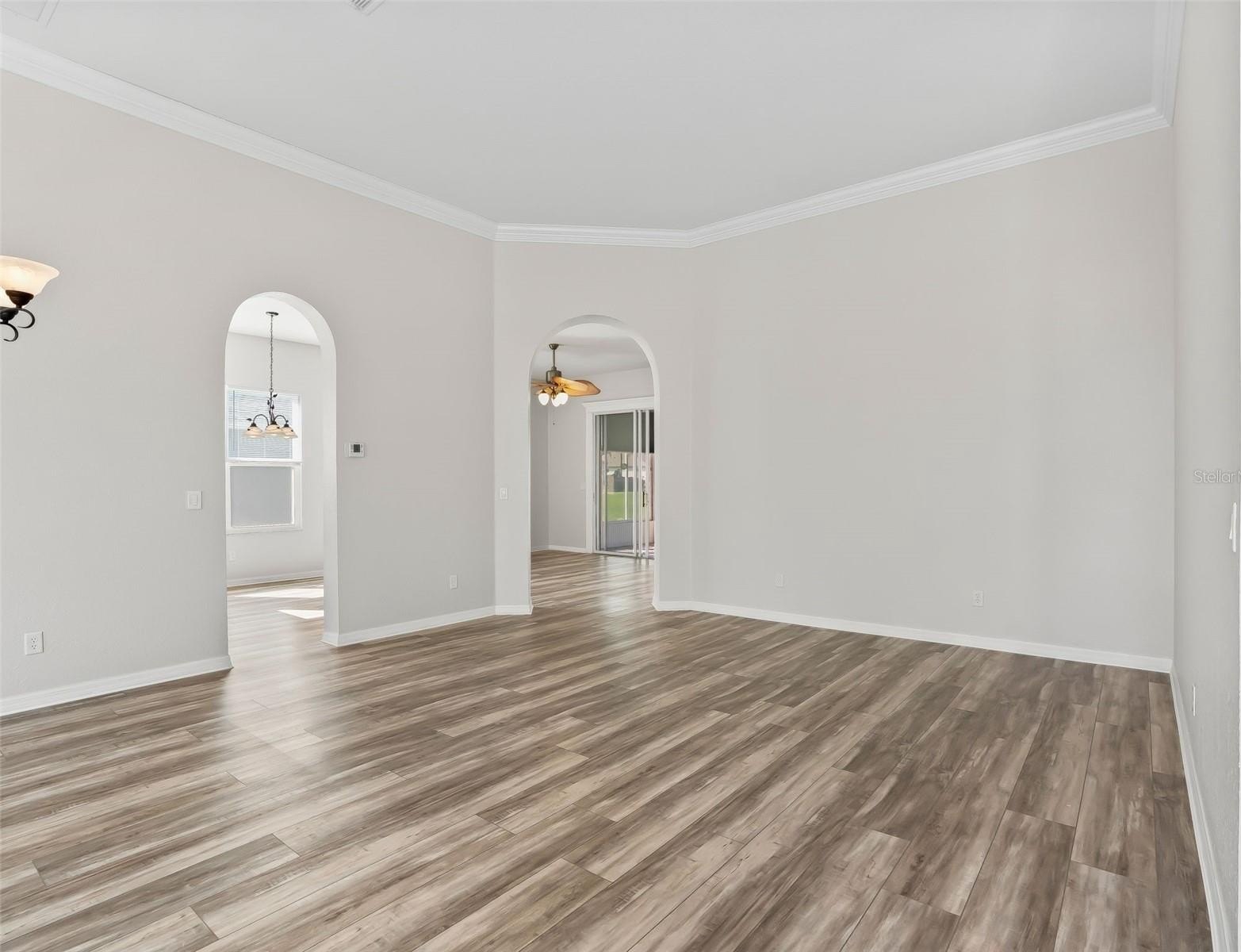 One or more photo(s) has been virtually staged. Entertaining home! Quick close possible! Ideal QUIET location in STONECRESTS' COVETED NEIGHBORHOOD OF OVERLOOK III! LOCATED ON A CUL DE SAC, WITH A larger than usual PARK IN THE CENTER CIRCLE IN THE FRONT OF THE HOME AND THE BACK HAS VIEWS OF THE GOLF COURSE BETWEEN THE 5TH AND THE 17TH GREENS. This home is surrounded by the Championship golf course, offers an open floor plan WHICH INCLUDES A DEN/OFFICE/swing room(sleeping area without a closet) filled with thoughtful upgrades and modern finishes. The kitchen is a chef’s delight, w/ quartz countertops, tall cabinets with over/under and inside remote contolled led colored lighting, a S/S single bowl sink, backsplash, LED recessedlighting, and a newer refrigerator with internal water dispenser* The common living areas offer luxury vinyl plank flooring, while 10’ and 12’ ceilings, crown molding, and arched entryways add elegance. The enclosed FLORIDA ROOM is enhanced with HEAT AND AIR, WHICH ADDS AN ADDITIONAL 192 SF MAKING THIS HOME APPROX. 2,096 SF OF ENJOYABLE SPACE to live and entertain in. The Florida rm. also offers new LVP flooring, 2 sets of sliding glass doors offering 5 panes a glass, energy-efficient remote-controlled sunscreen, wainsott trim and pleated shades, provides the perfect year-round retreat. The oversized garage is a dream come true for the car enthusiast, with golf cart storage space, a mini split A/C (2024), insulated ceiling, pull-down attic stairs, additional electrical outlets, a utility sink, and an electric remote-controlled garage screen AND KEYPAD.**
