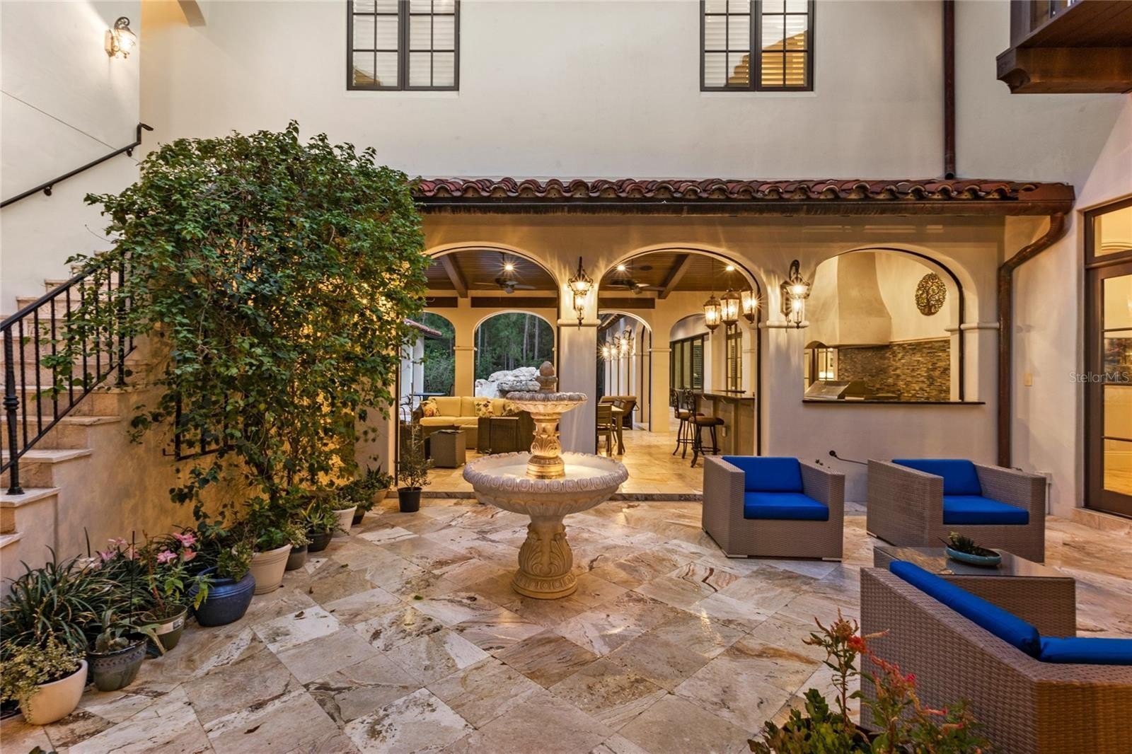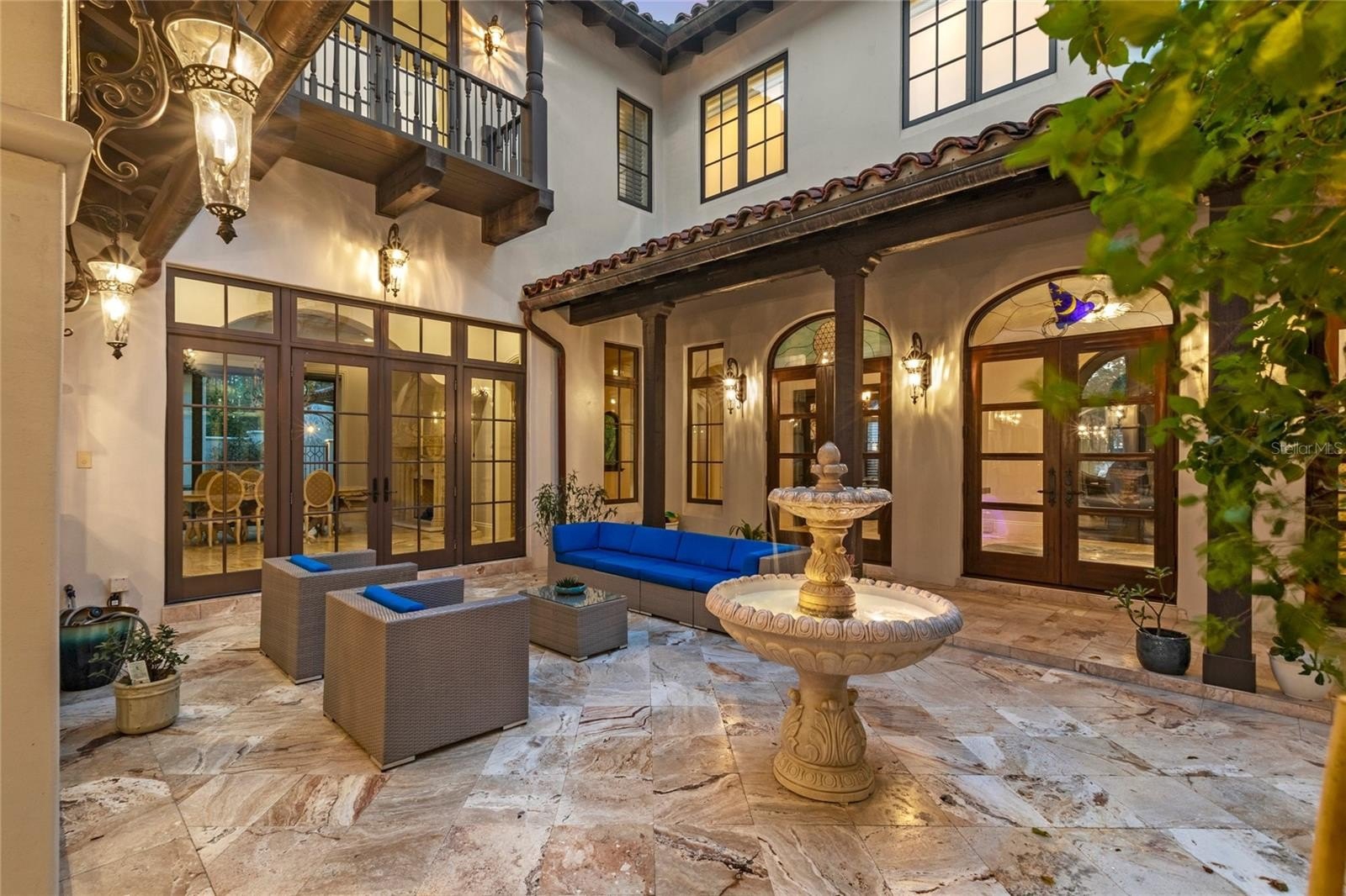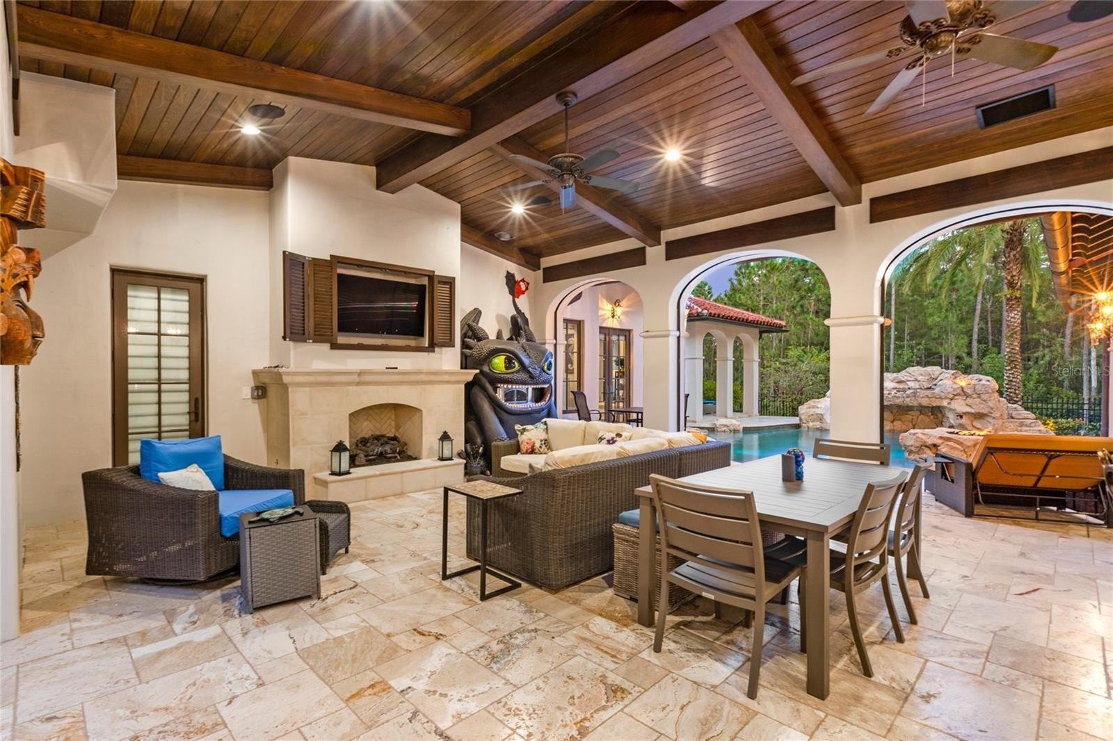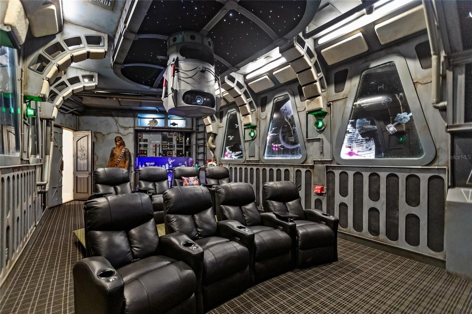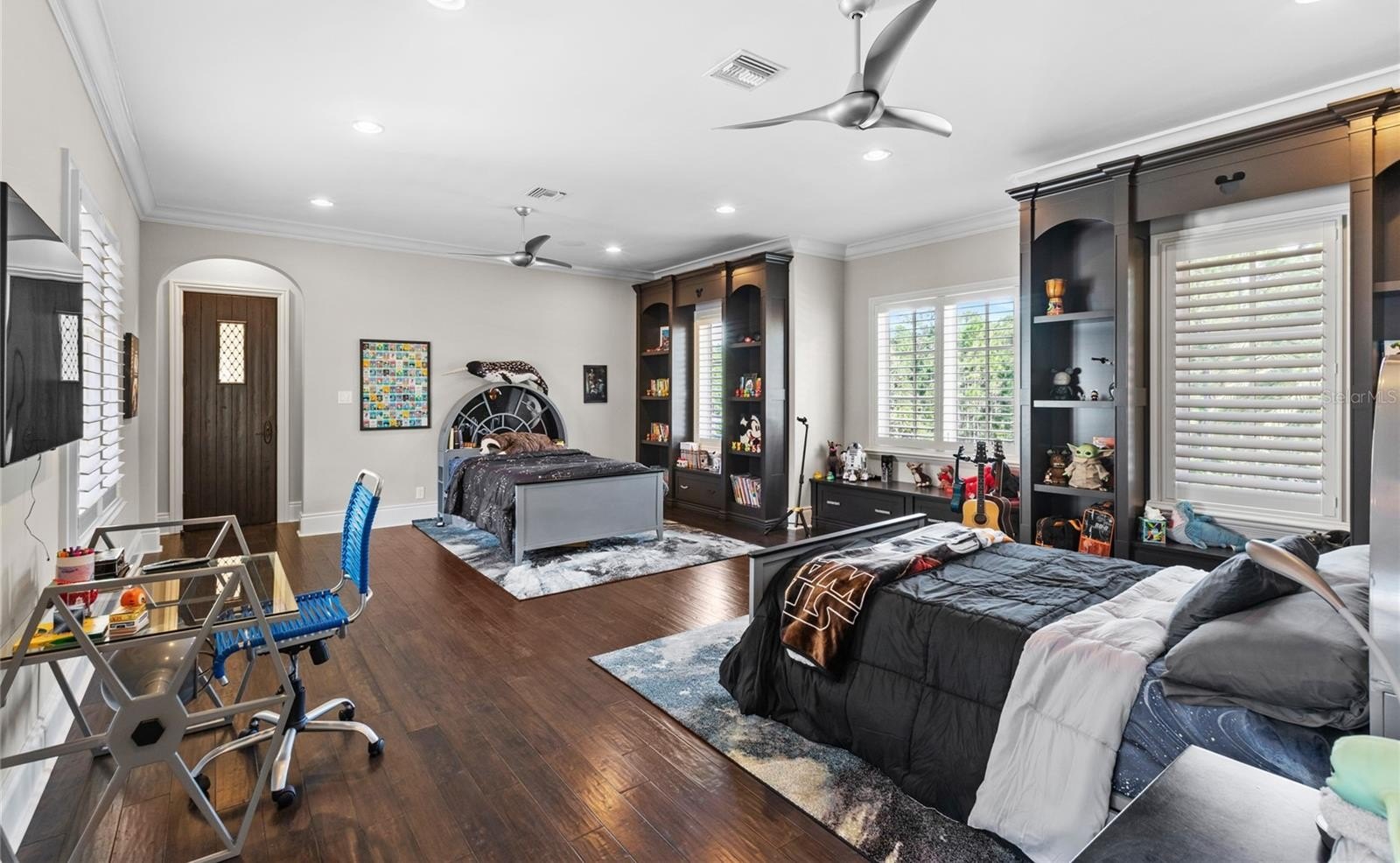 Nestled deep inside the coveted Carolwood neighborhood of Golden Oak at Walt Disney World® Resort, this nearly 11,000 sqft Mediterranean estate offers a rare combination of scale and one-of-a-kind details. Situated on a .79-acre lot, siding and backing to conservation, the home also enjoys serene pond views and ultimate privacy. Inside, soaring ceilings and a sweeping staircase set the tone, anchored by a custom crystal chandelier. A row of Disney-themed stained-glass windows adds a whimsical touch, overlooking the courtyard and sparkling resort-style pool. The chef’s kitchen overlooks a two-story great room and is designed for both function and beauty, featuring top-of-the-line appliances and extensive storage inside custom cabinetry. With 7 bedrooms and 7.2 baths, including a fully detached apartment over the garage, the layout is ideal for family or guests alike. The first-floor master suite is a private retreat, complete with two gas fireplaces, a sitting area overlooking the pool, and a spa bath with soaking tub and walk-in shower. Additional highlights include a Millennium Falcon–inspired theater, temperature-controlled wine room, Toothless pizza oven, an exact replica of the marble fireplace from Cinderella’s Castle apartment, and a massive game room perfect for entertaining, gaming, and/or homeschooling. Outside, the true resort-style setting is unmatched. A pool with grotto, spa, slide, and rock waterfall is complemented by multiple fire pits, expansive covered courtyards, and a summer kitchen for indoor/outdoor living. Car enthusiasts will appreciate the four separate garages, three outfitted with lifts to accommodate up to seven cars. Located just a short drive from Summerhouse and the Four Seasons Resort, this estate offers a rare opportunity to own one of Golden Oak’s most remarkable residences.