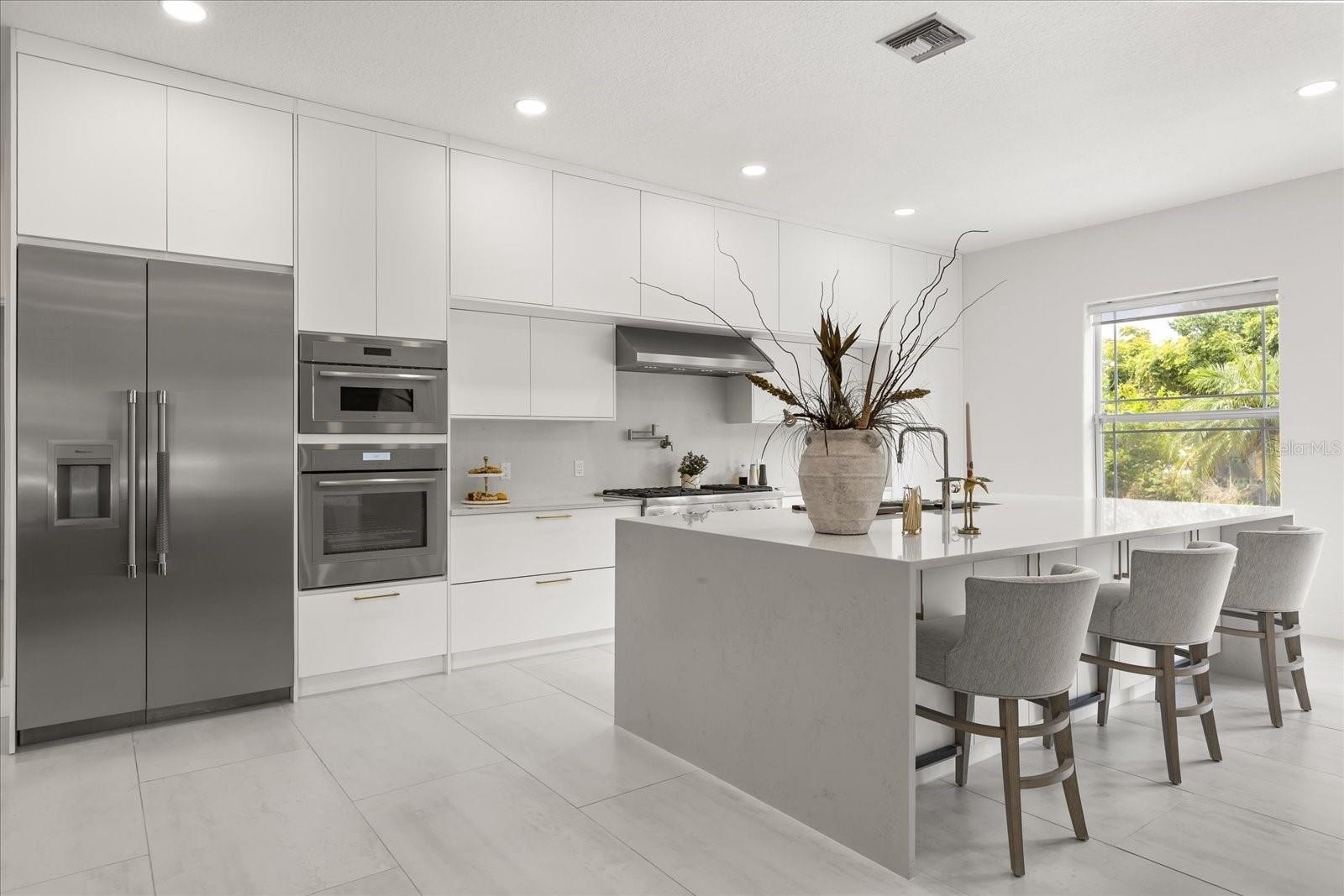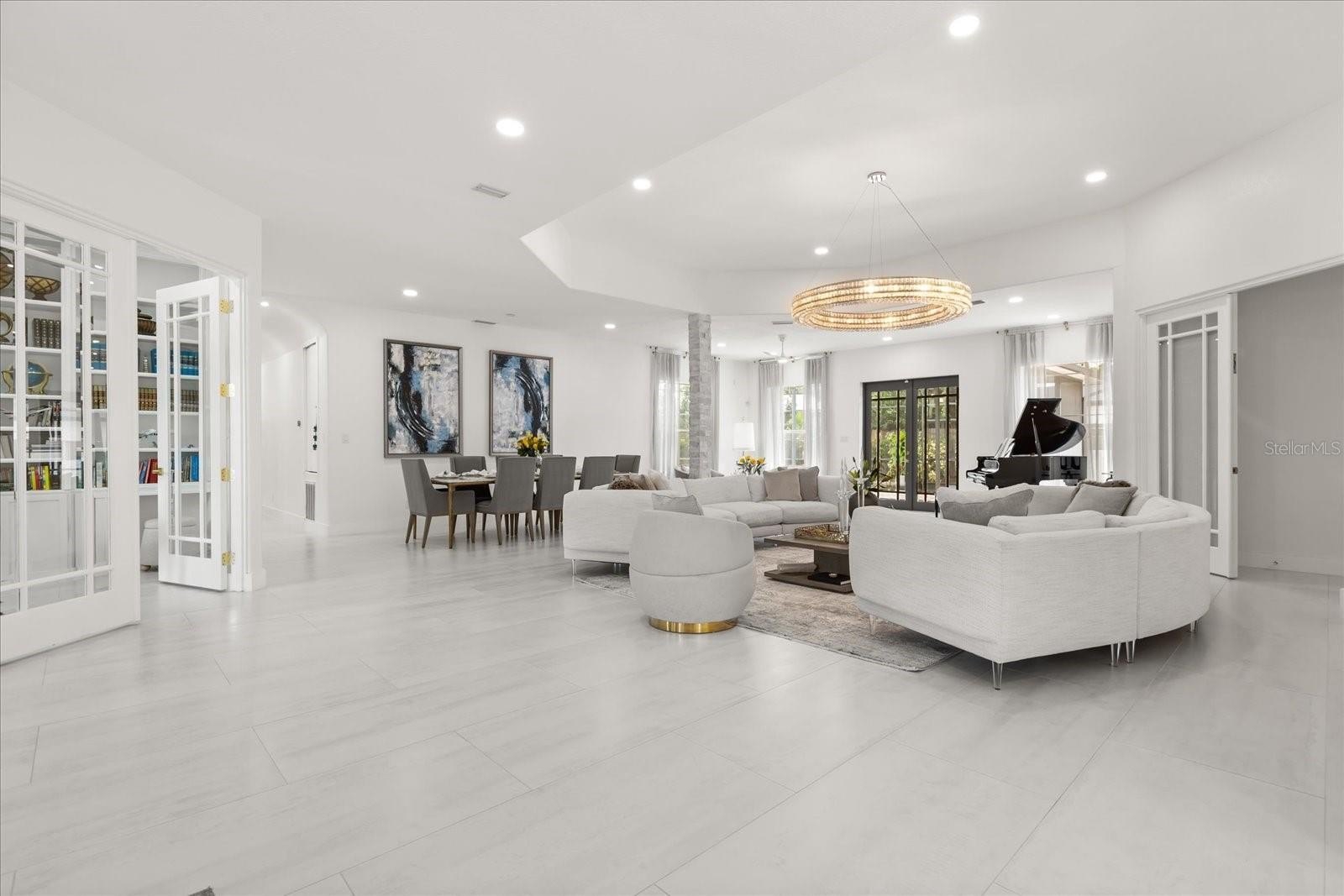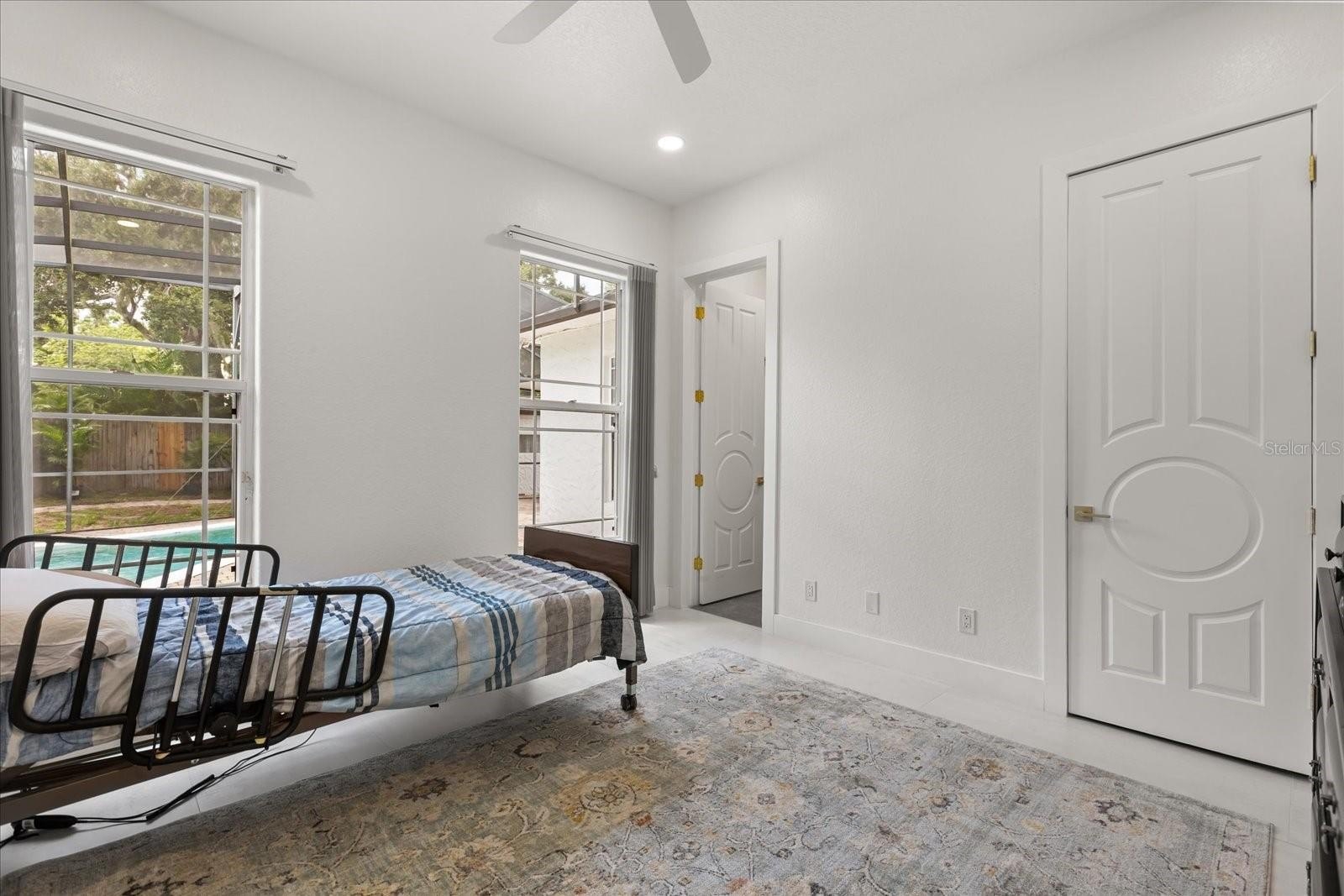 The oversized primary suite feels like a retreat with its spa-inspired bath, oversized walk-in closet, and serene views of the pool and canal. Four additional bedrooms provide comfort for family or guests.