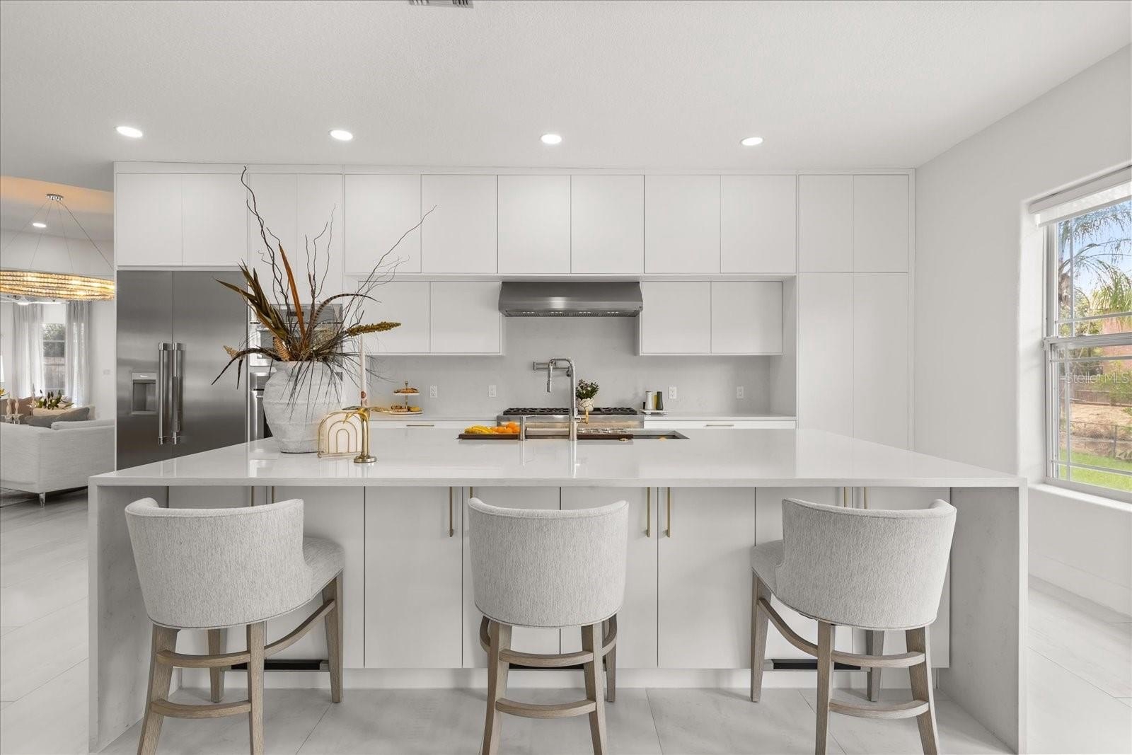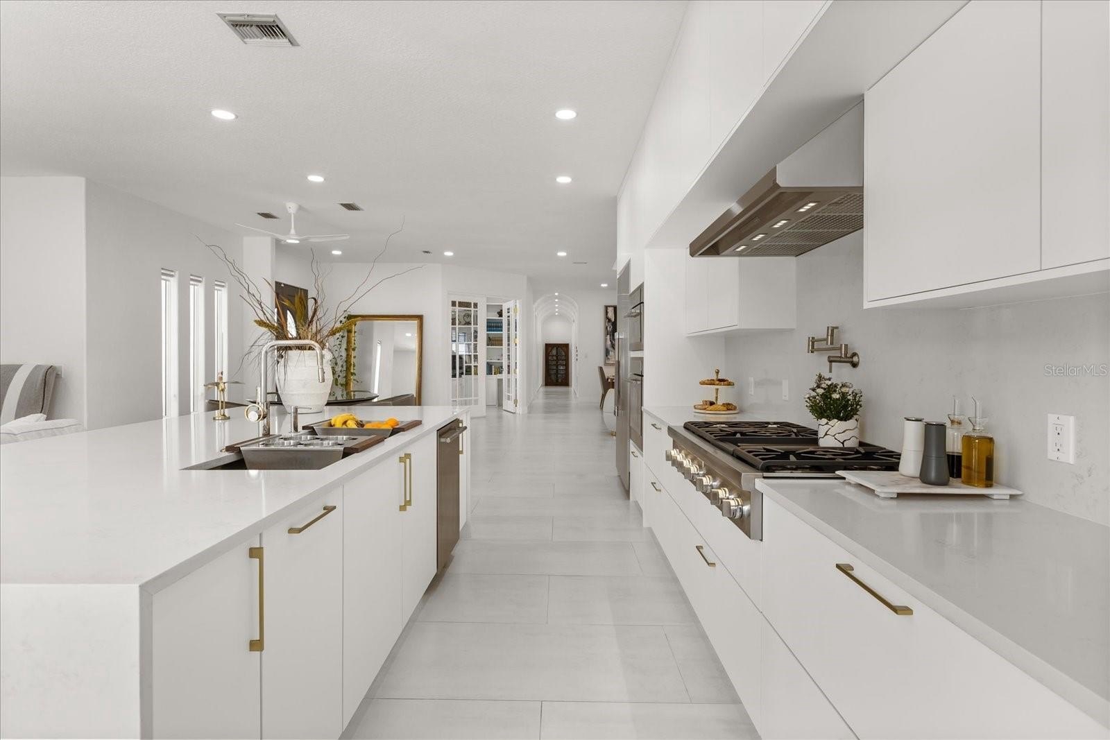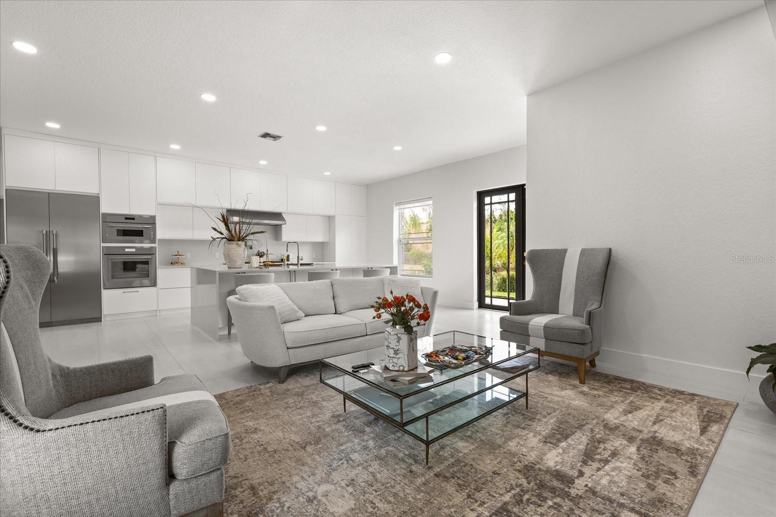 Inside the main home, the living space unfolds across a single story with soaring ceilings, custom built-ins, and expansive gathering areas. The gourmet kitchen is a chef’s delight, featuring a gas cooktop, built-in oven, 42” cabinetry, and generous counter space for entertaining. A gas fireplace anchors the family room, while French doors open to the screened pool, patio, and expansive backyard.