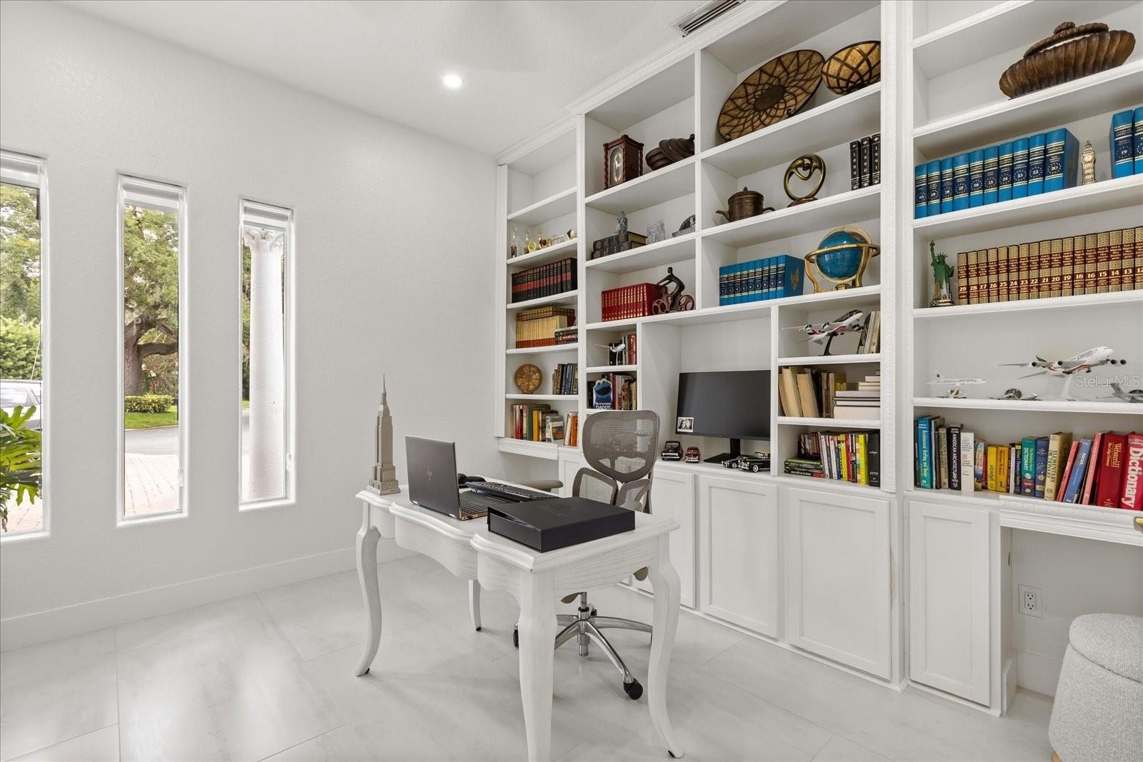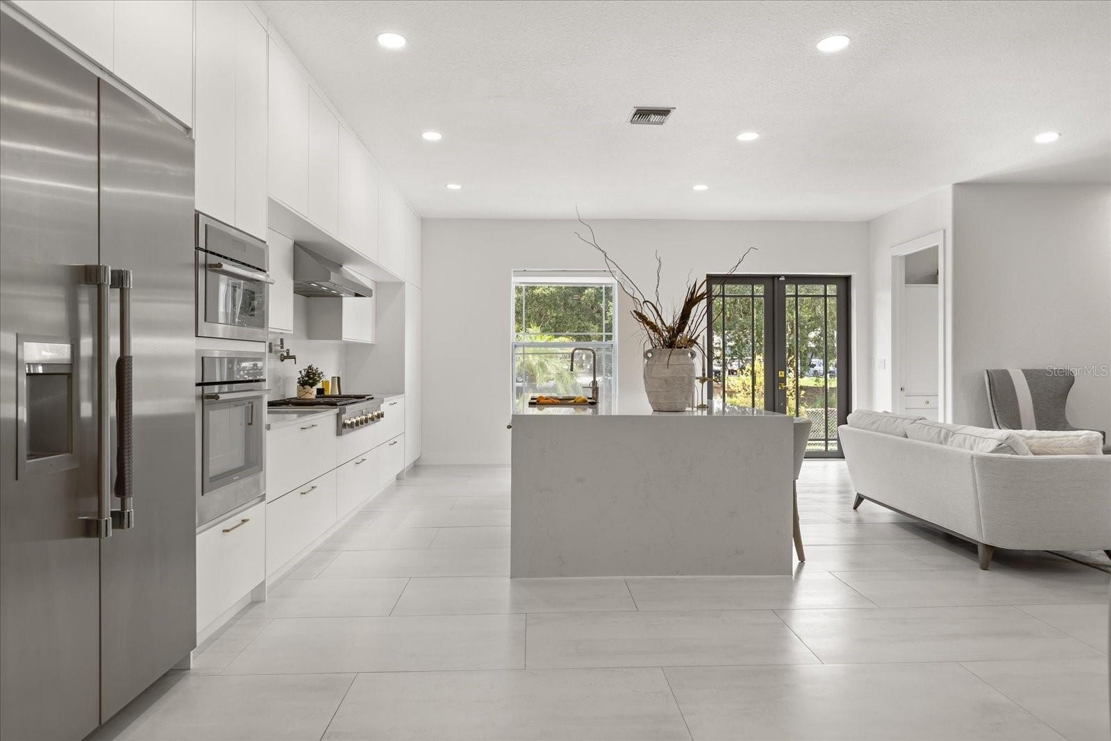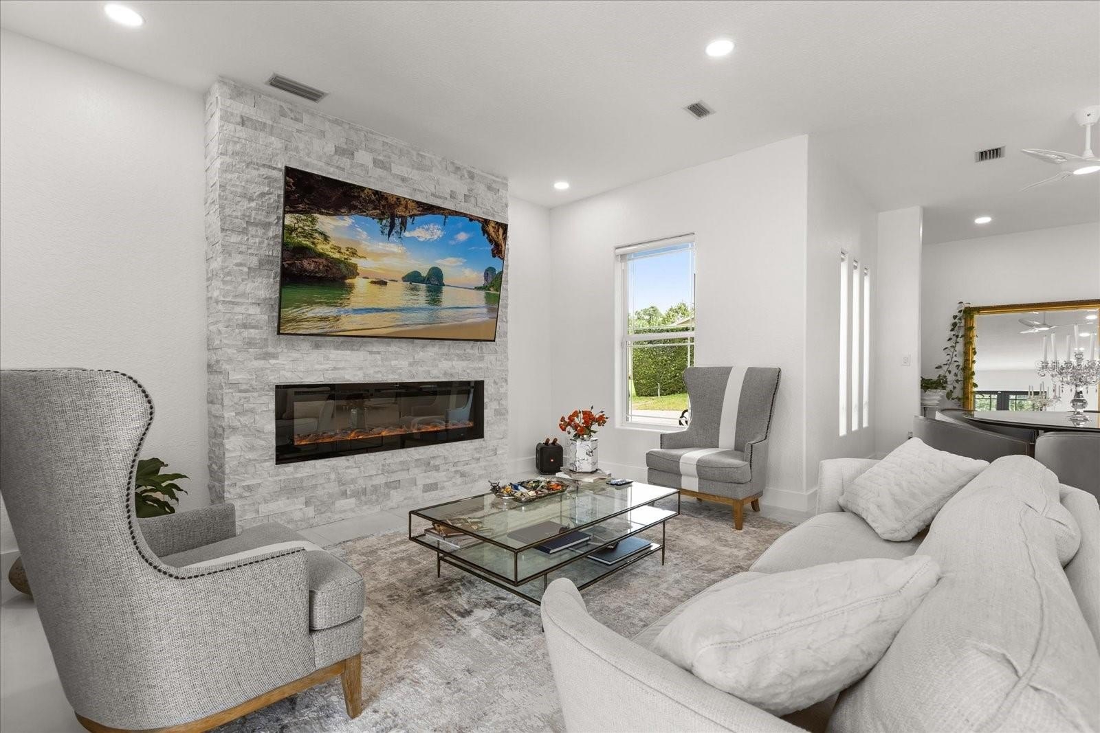 Inside the main home, the living space unfolds across a single story with soaring ceilings, custom built-ins, and expansive gathering areas. The gourmet kitchen is a chef’s delight, featuring a gas cooktop, built-in oven, 42” cabinetry, and generous counter space for entertaining. A gas fireplace anchors the family room, while French doors open to the screened pool, patio, and expansive backyard.
