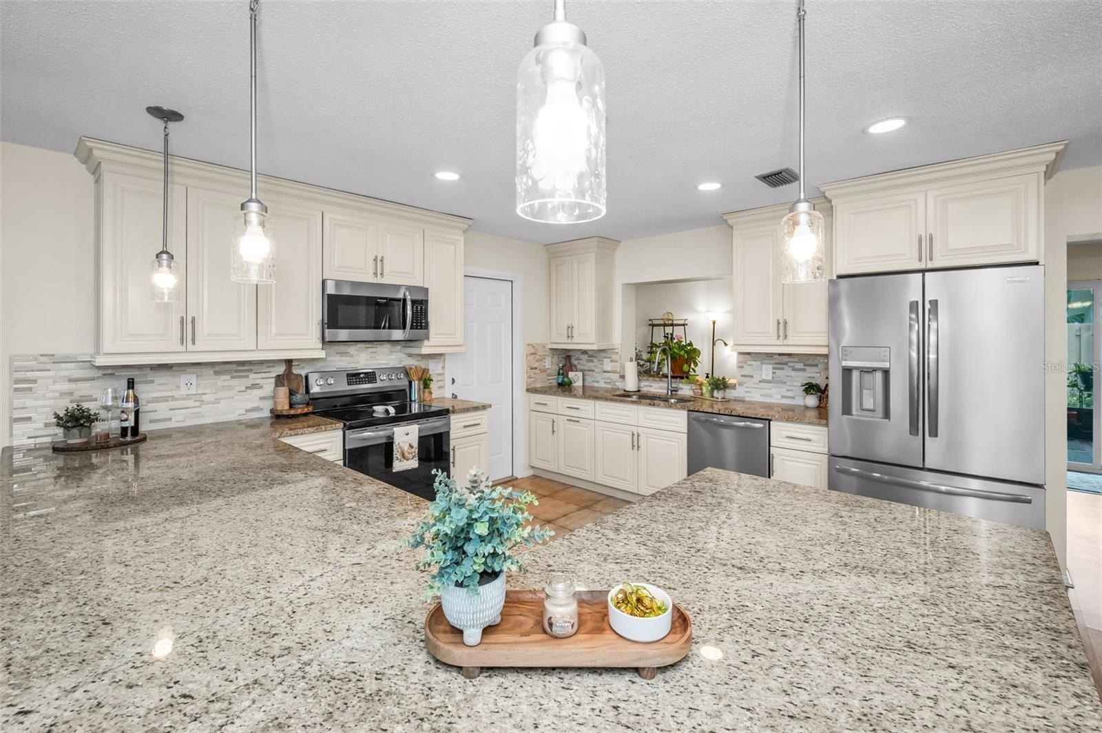 Fall in love with this Palm Harbor treasure!!! 921 Anchorage Lane is a beautifully updated 1,204 sq ft 2 bedroom, 1 bath, 1-car garage home in the vibrant 55+ community of Anchorage of Tarpon Lake. Inside, the airy open-concept design is highlighted by a fully remodeled kitchen including new cabinets, granite counters, tile backsplash, new stainless steel appliances, and new lighting. A newly renovated bathroom features a walk-in shower with safety bars and a new vanity. Thoughtful upgrades include a water softener, updated interior doors, hurricane windows, new leaf-guard gutters, and freshly screened porches, along with a clean 4-point inspection that makes this home truly move-in ready. Open the sliding glass doors on a breezy day and enjoy true indoor-outdoor living, with natural light streaming throughout.