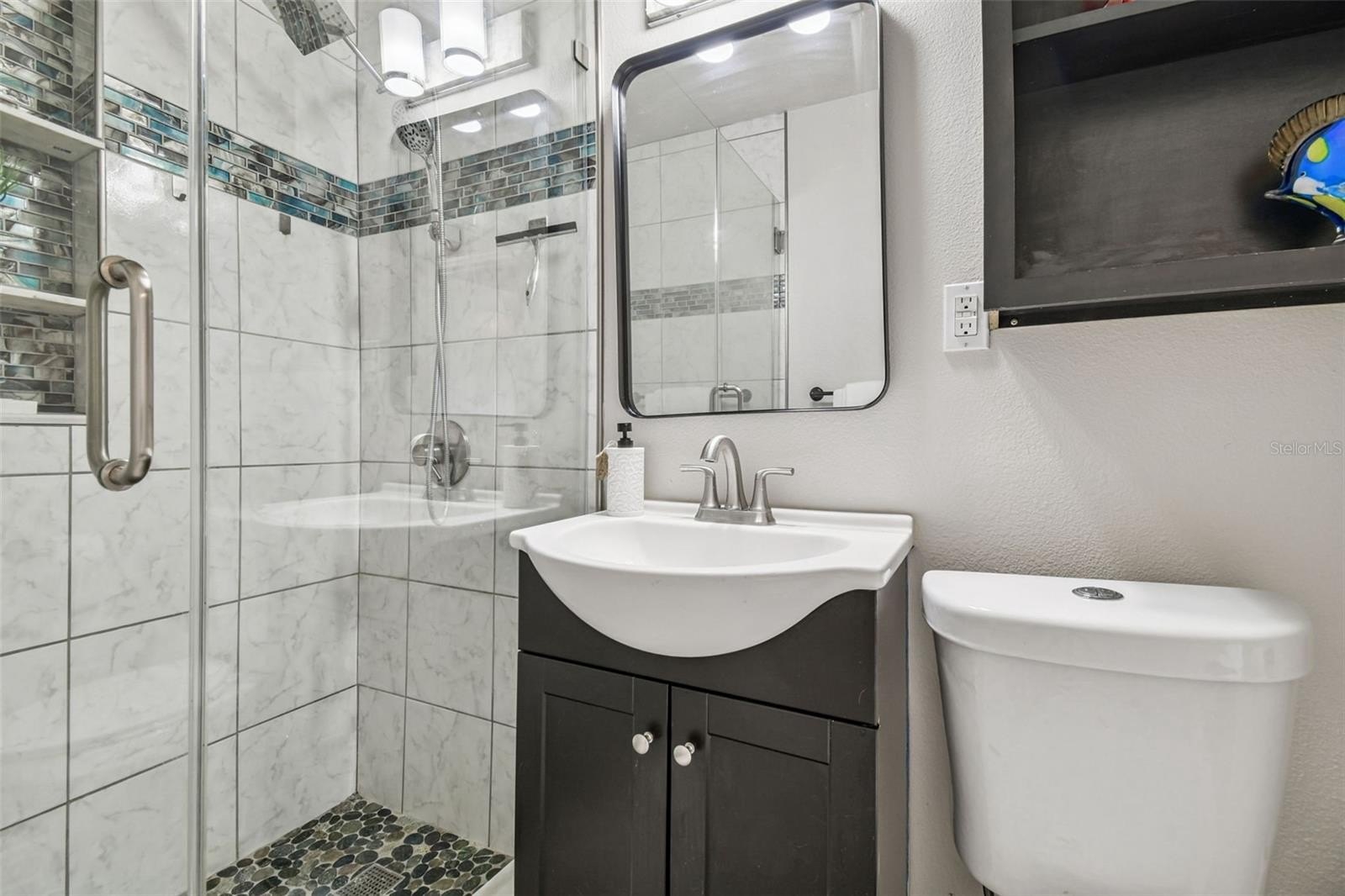 Both bedrooms are spacious and filled with natural light. The modern style bathroom features glass mosaic accents, frameless glass doors, marble shower shelving in the a luxurious walk in shower. The adjacent bonus room can be used as a convenient home office, den, sitting room, or can even be converted into a 3rd bedroom. Step outside onto your relaxing patio and enjoy a large shed in the oversized fenced in backyard for additional storage. The home has also been freshly painted inside and out!