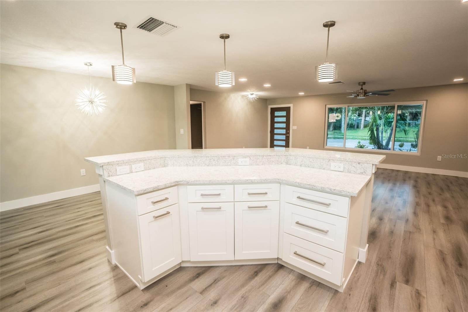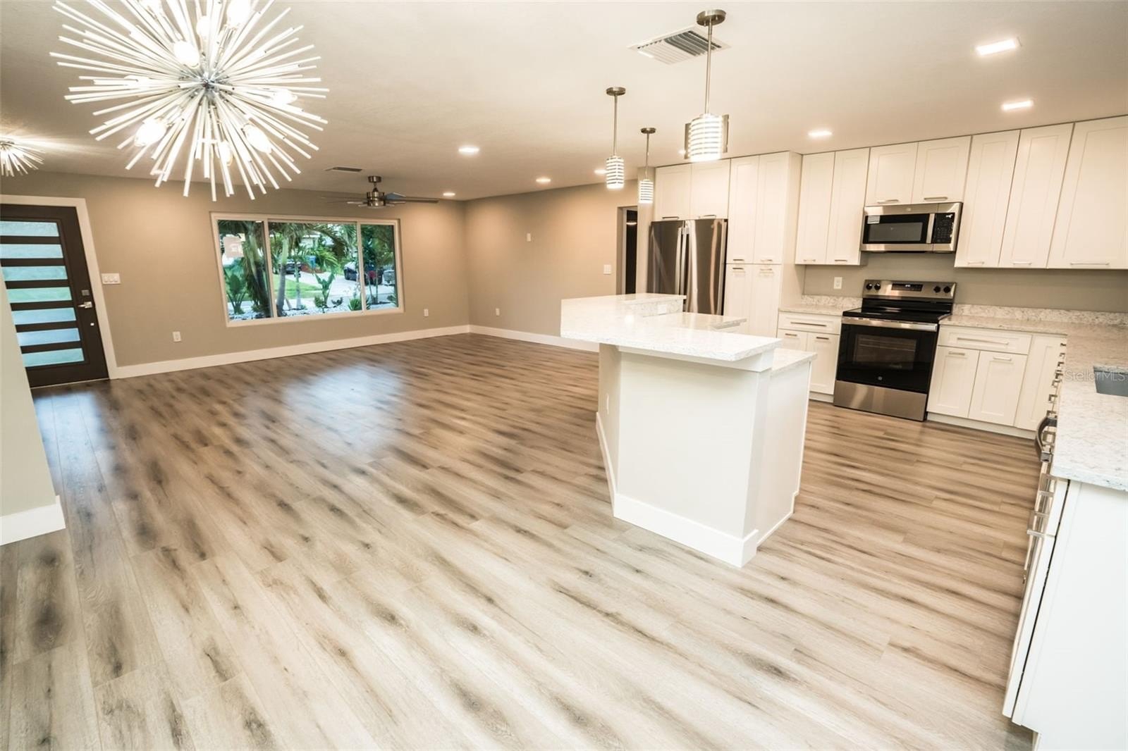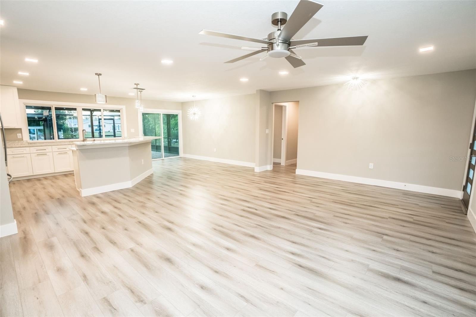 The open-concept layout connects kitchen, dining, and living areas — perfect for movie nights or family gatherings