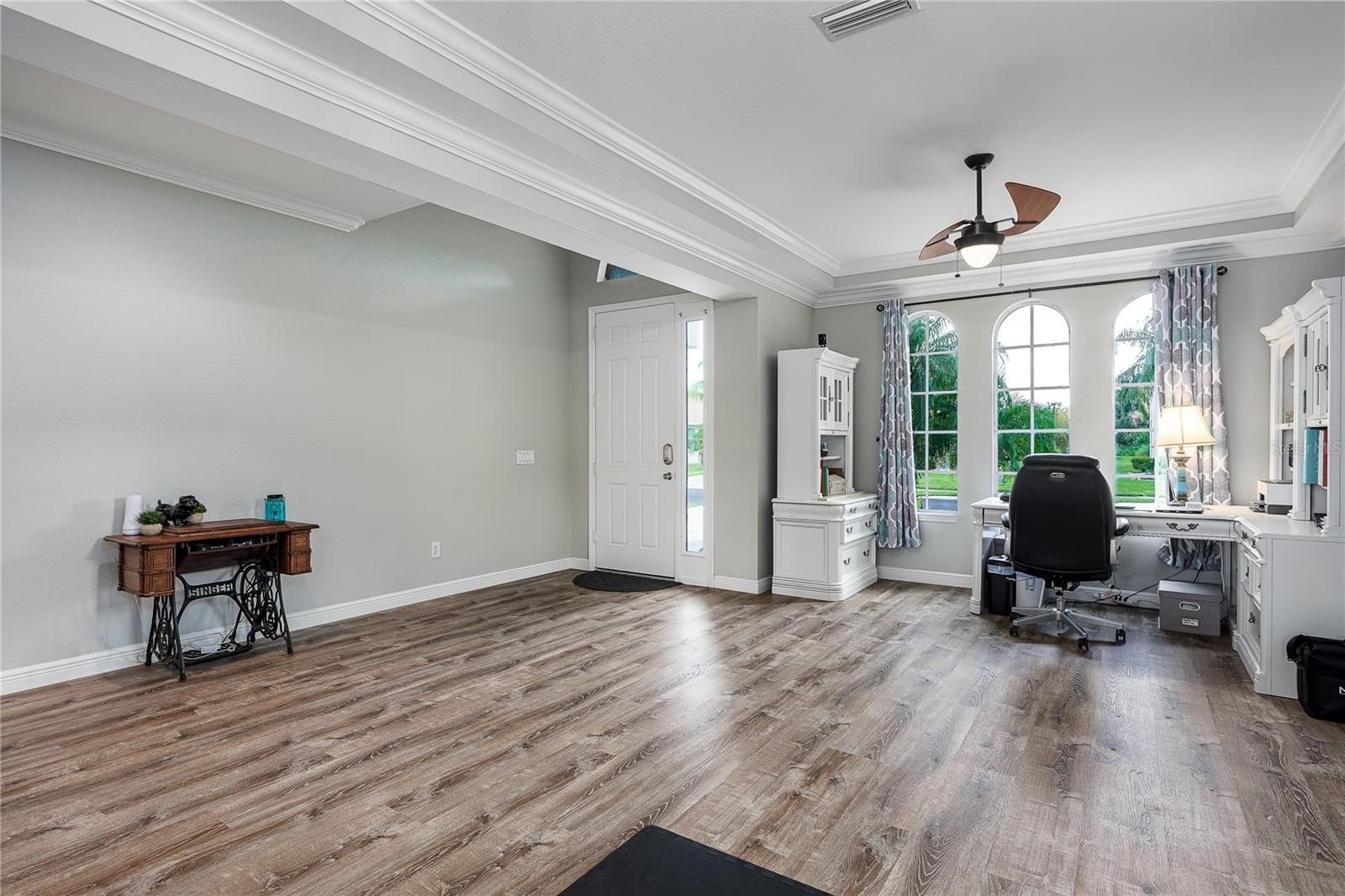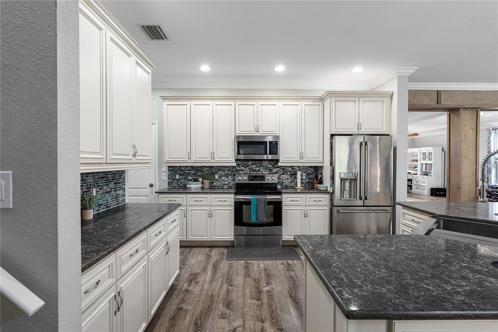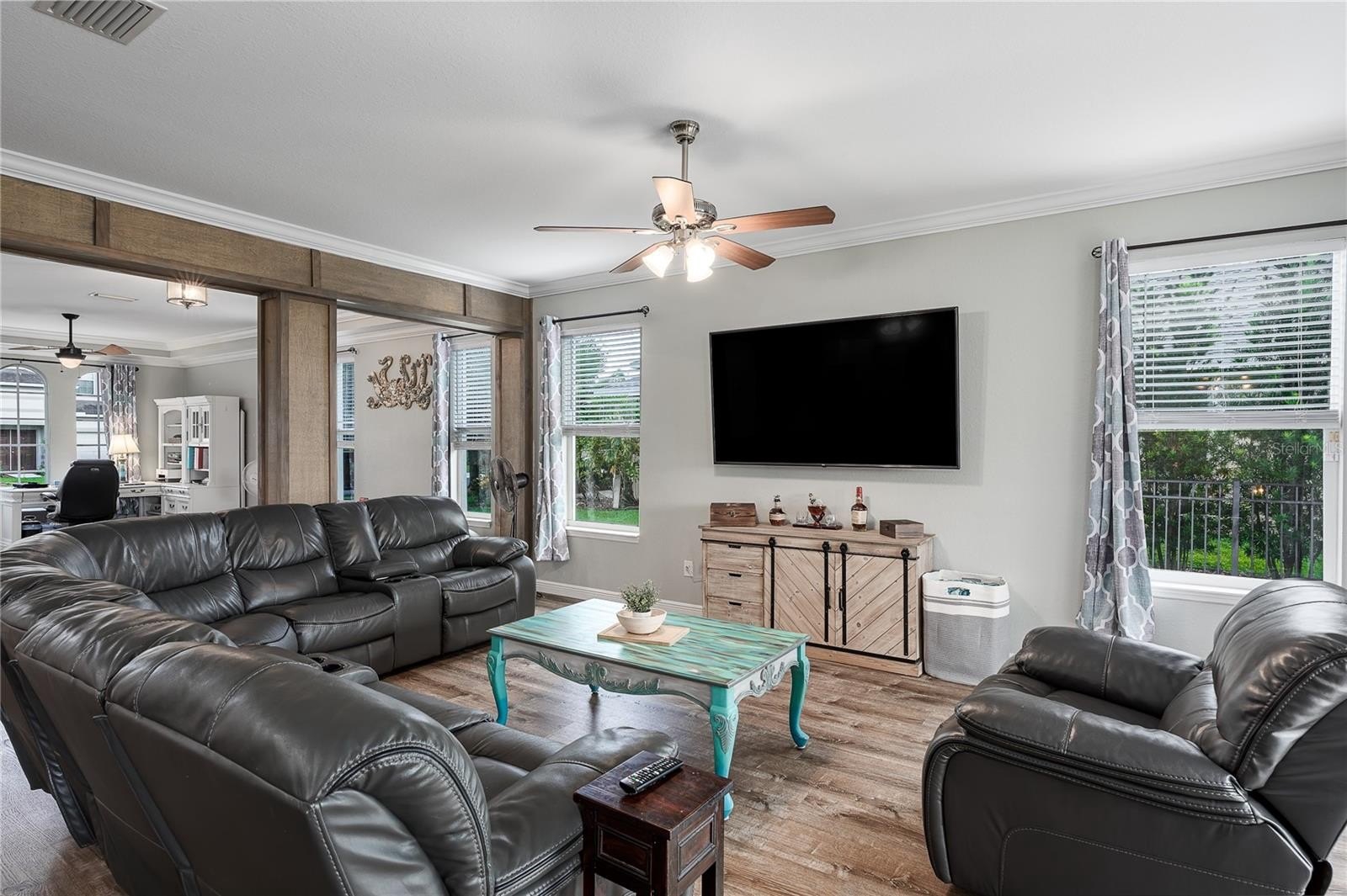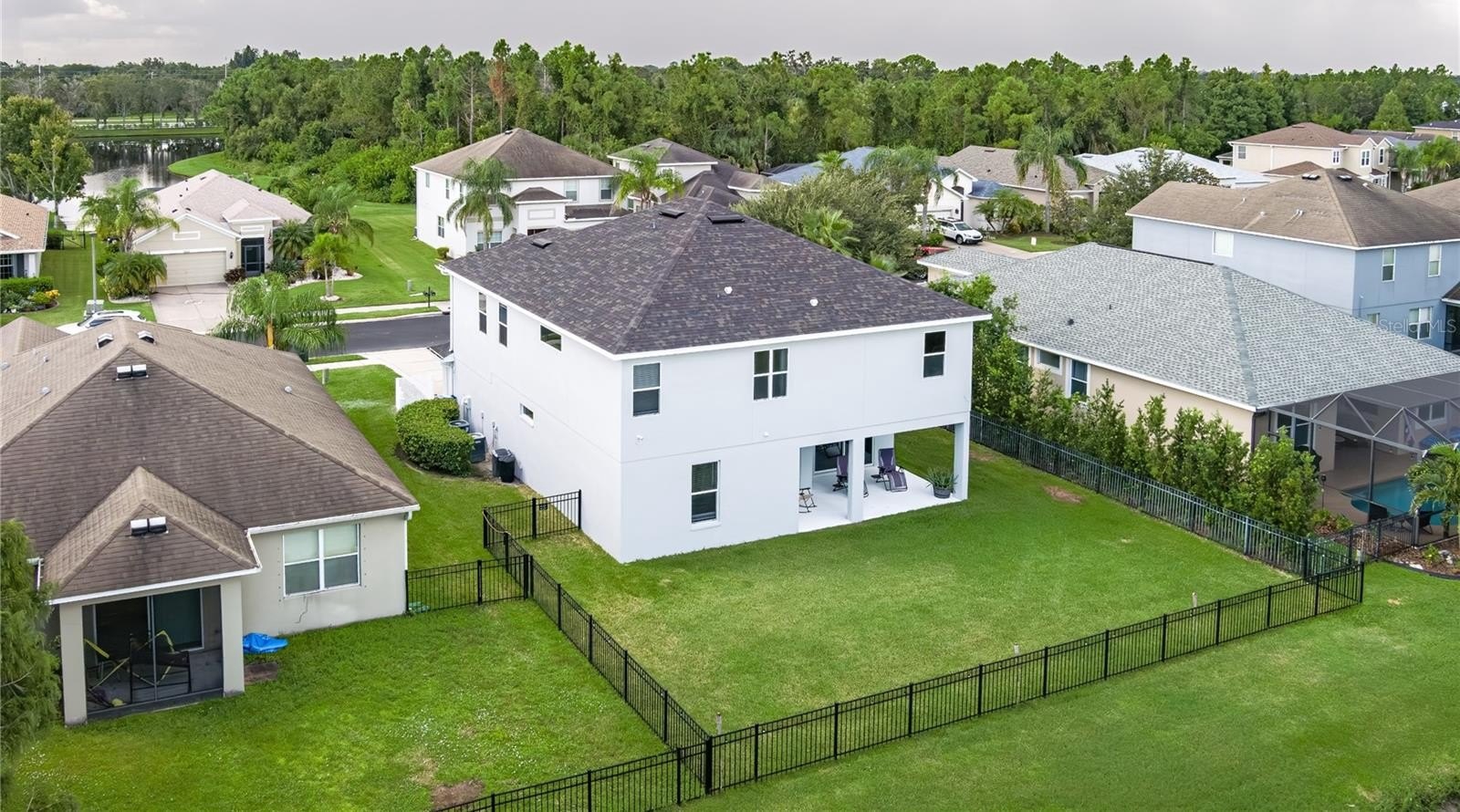 Inside, you’ll find a bright open layout with multiple living and dining areas, ideal for both everyday living and entertaining. The kitchen is a showstopper with premium finishes. The great room flows seamlessly to the outdoor living spaces, where a covered lanai and fenced backyard create the perfect setting for gatherings.