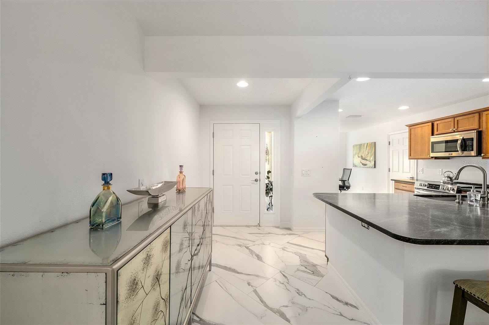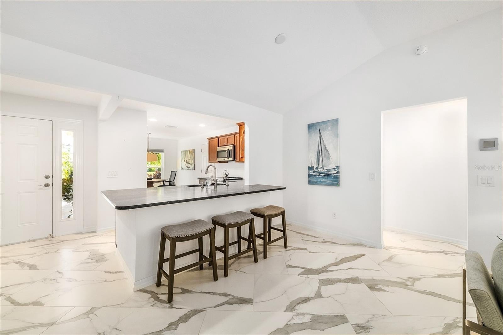 Inside, you’ll find custom tile flooring, a bright, open layout, and a 200 sq ft Florida Room that’s enclosed and under air—adding extra living space not reflected in the MLS square footage. The kitchen features quality cabinetry, a cozy dinette area, and a custom bar-height countertop perfect for entertaining.