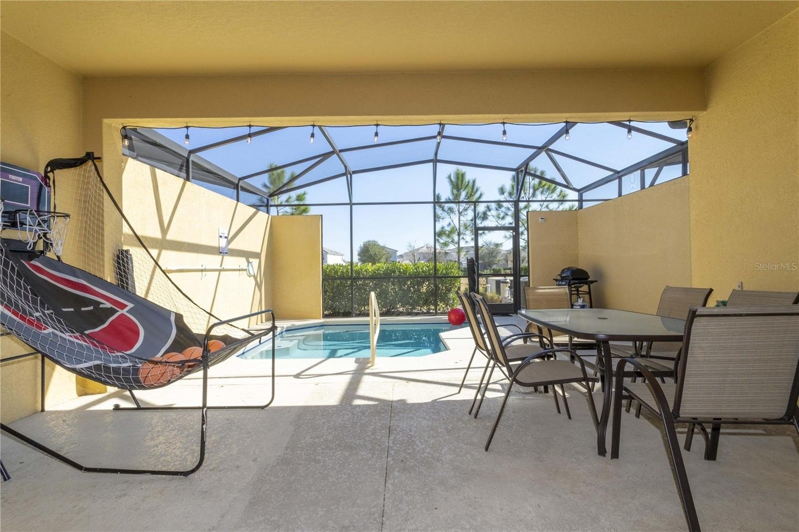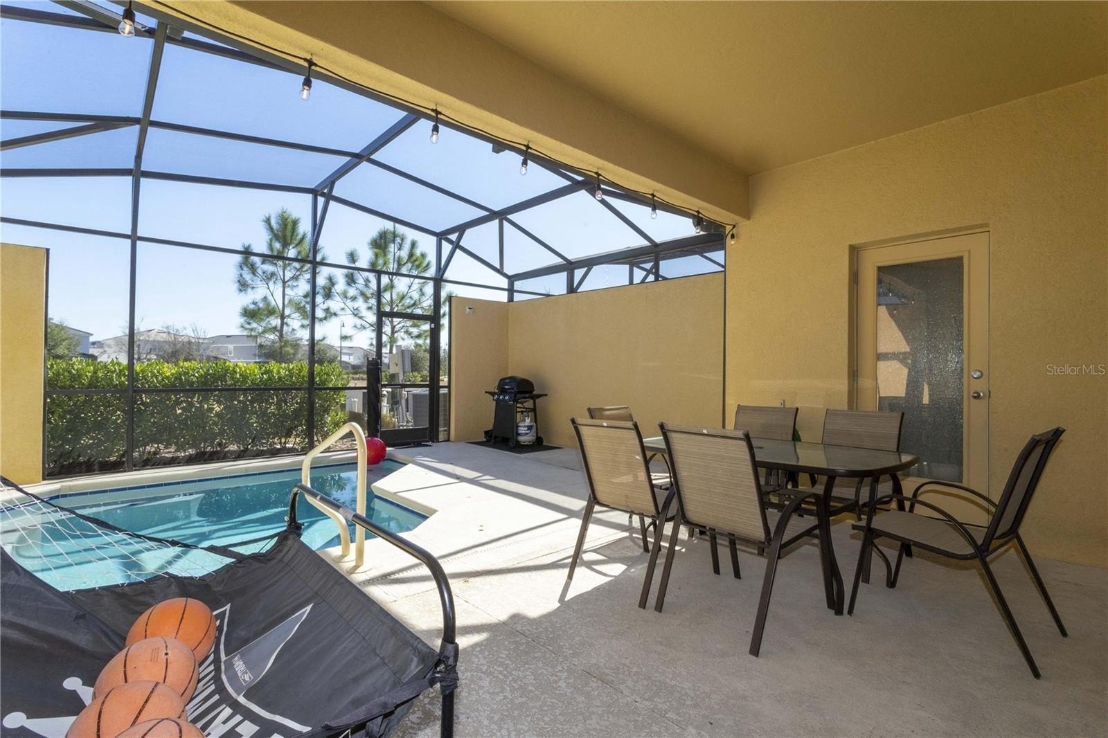 The home features tile flooring throughout the main living areas and luxury vinyl plank on the stairs and in all bedrooms—offering both style and durability with no carpet. The private screened-in pool is perfect for enjoying Florida’s year-round sunshine, and the pool heater was replaced in 2022 for added efficiency, tile roof and AC original 2017.