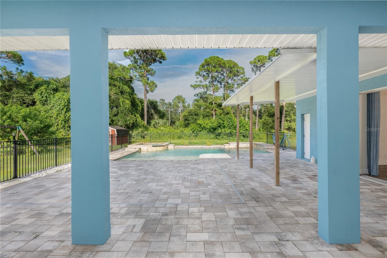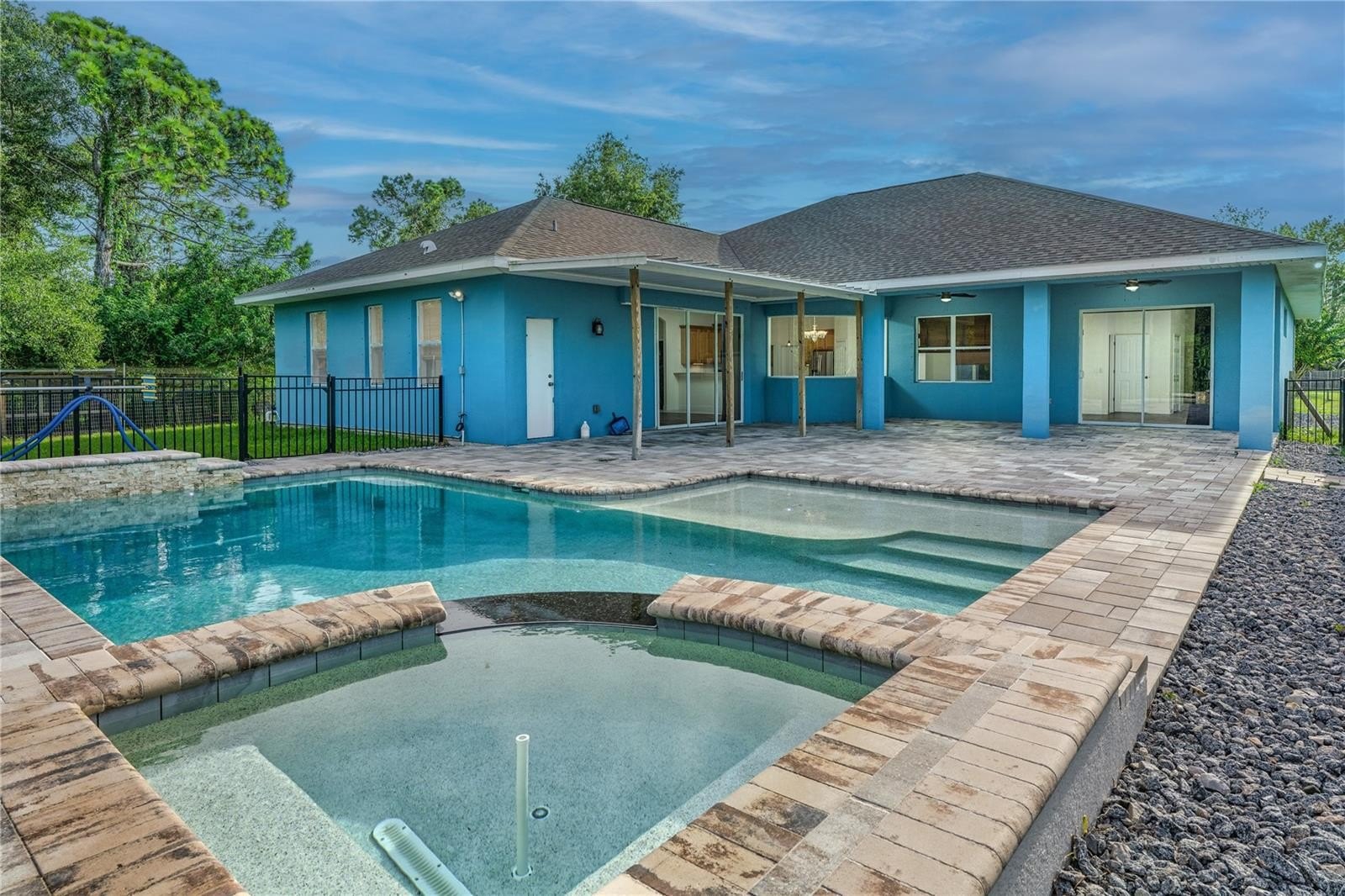 Just minutes from I-95, this stunning custom-built home sits on 1.3 private acres and offers the perfect blend of country charm, comfort, and functionality. Step inside to an open floor plan with 10-foot ceilings, formal living and dining rooms, and a spacious family room with a triple slider that seamlessly opens to the sparkling saltwater pool and spa. The large kitchen is a chef’s delight, featuring Corian countertops, stainless LG appliances, a center island, breakfast bar, cozy breakfast nook, and 42” maple cabinets with slide our shelves adorned with crown molding. A generous laundry room and 3-car garage provide plenty of storage and convenience. The luxurious master suite includes private access to the covered patio and pool area. The spa-like master bath boasts a walk-in shower, jetted tub, dual vanities and closets. Additional bedrooms are oversized with walk-in closets, perfect for family or guests. Outdoor living is a dream with a big covered paver patio that opens to the pool and spa, fenced backyard, swing set, and storage shed. Energy efficiency is built in with spray foam attic insulation to help keep the home cool and electric bills low. Hurricane shutters make the season stressless! This home truly has it all—space, style, and privacy!
