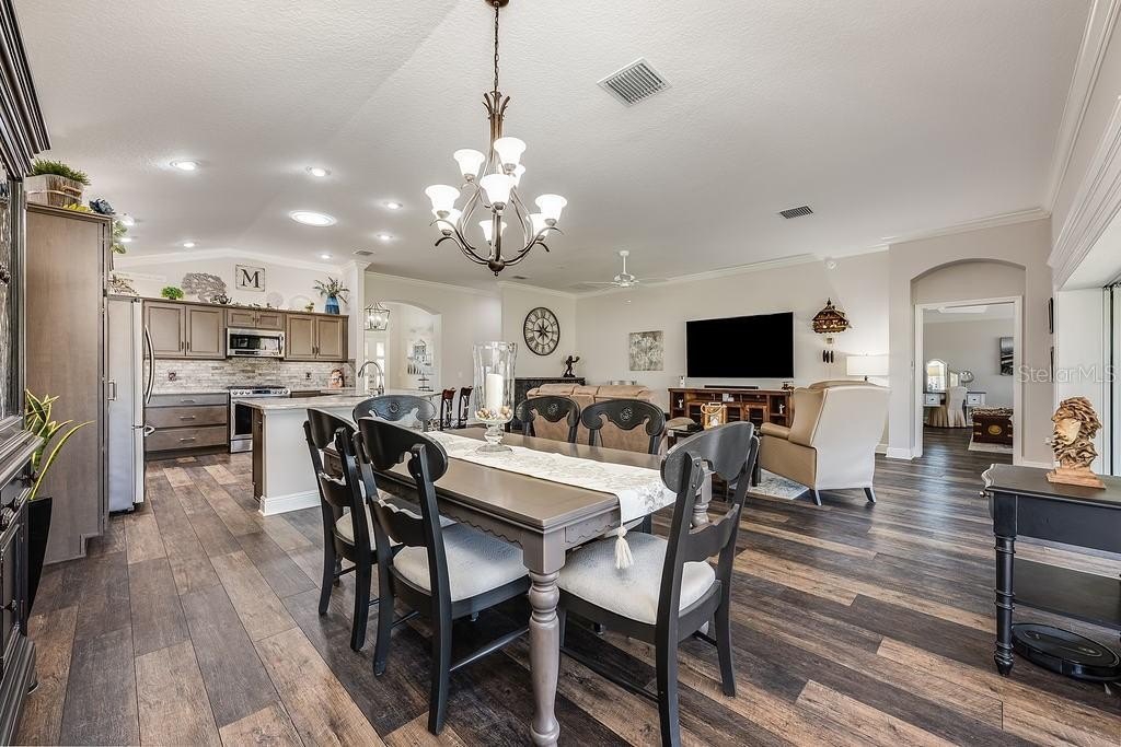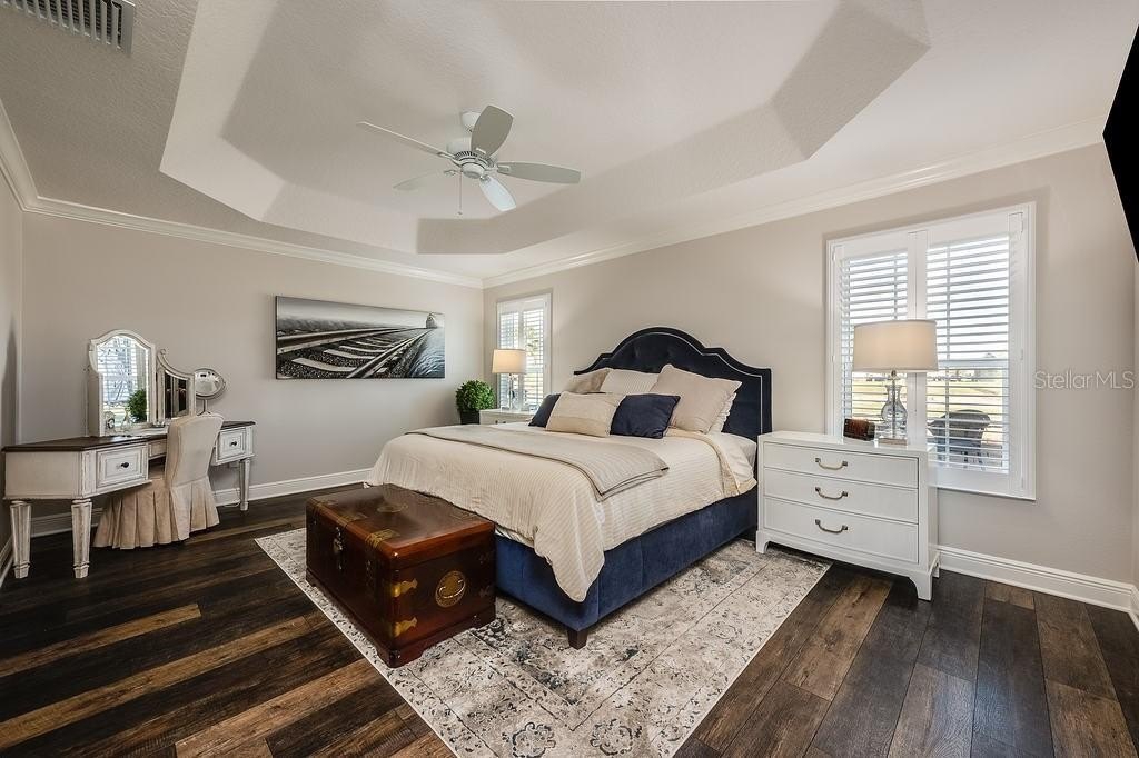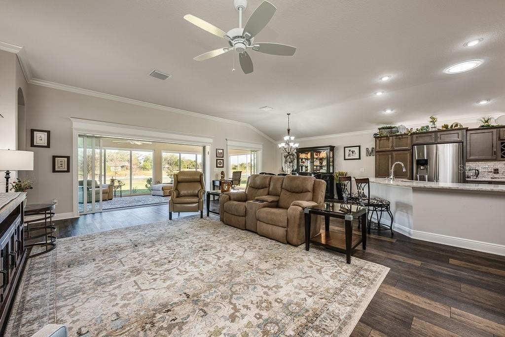 Seller may consider buyer concessions if made in an offer ~ Stunning Upgraded Home in The Village of Monarch – A Must-See! Welcome to your dream home in the highly desirable Village of Monarch! This beautifully updated and meticulously maintained residence offers the perfect blend of elegance, comfort, and functionality – truly a one-of-a-kind find in The Villages. Step inside and immediately notice the attention to detail: custom door and window casings, stunning crown moldings, and tile floors throughout that provide both beauty and durability. The open-concept living area flows seamlessly into the chef’s kitchen, complete with high-end finishes and designed for entertaining and everyday comfort. One of the true highlights of this home is the expansive 28x12 fully enclosed Florida room, featuring tranquil views of the pond and Riverbend Recreation Facility. Outfitted with new power roller shades, this space offers the perfect balance of privacy and natural light, making it ideal for year-round relaxation. Designed with a three-way split floorplan, the home offers optimal privacy and versatility. The spacious primary suite boasts a tray ceiling, water views, and a luxurious en suite bathroom with double sink vanity, a large tiled walk-in shower, walk-in closet, and its own dedicated tankless water heater. The second bedroom is bright and welcoming with bay windows that fill the room with natural light and also includes its own private en suite bath—perfect for guests or extended family. The third bedroom, located on the opposite side of the home, serves as an ideal guest suite, office, or flex space to suit your needs. And there’s more—this home features one of the largest garages in the area at 37x24 ft, offering plenty of space for vehicles, storage, and of course, your golf cart! Step outside and enjoy the oversized patio overlooking the serene pond and recreation facilities—perfect for evening sunsets or entertaining friends. There's even room to add a private pool if desired. This modified version of the popular Dove Model is loaded with upgrades and custom touches throughout. Don't miss your opportunity to own this unique, move-in ready home—schedule your private tour today!