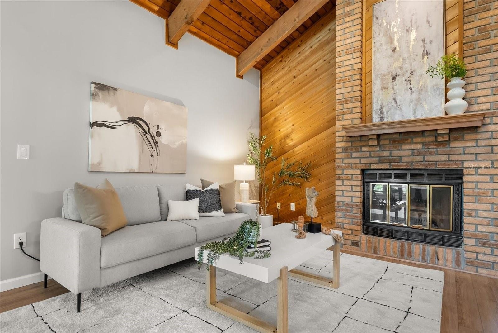 Step inside to find soaring cathedral vaulted ceilings with rich cedar planks and wood beams, creating a truly inviting atmosphere. The kitchen has been thoughtfully opened and modernized with beautiful maple cabinetry, granite countertops, stainless steel appliances, a breakfast bar, and a full built-in pantry. A spacious walk-in laundry room and secondary pantry add both style and functionality.