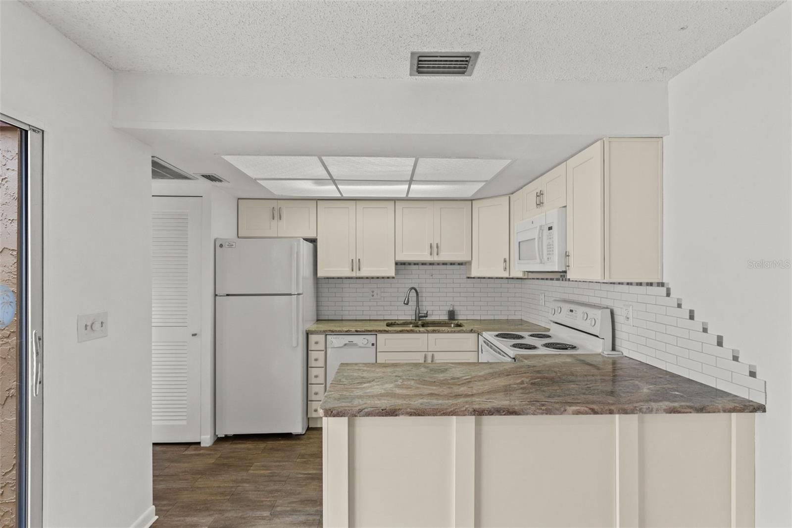 Come live in the heart of Palm Harbor in a lush 58 unit, age qualified community with a beautiful pool and clubhouse. Enjoy this renovated villa with new kittchen cabinets, granite counter tops, dishwasher and microwave as well as new vinyl floors from the kitchen into the dinning room. The primary en-suite bath has had a new shower installed July 2025. The house bath has had a new vanity, toilet and vinyl floors intstalled. The washer and dryer are newer and convey with the property. Water heater January 2018, AC installed June 2025.