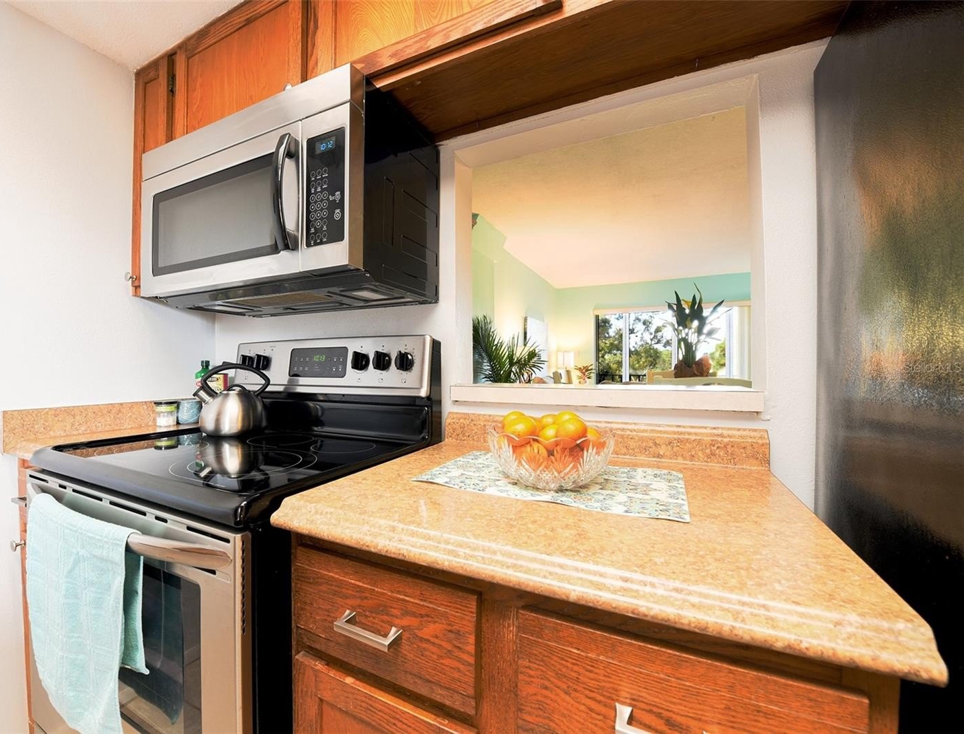 Step inside to an open-concept living and dining area with sliding glass doors that lead to an enclosed lanai, creating the perfect space for relaxing or entertaining. The kitchen features solid wood cabinetry and includes all appliances, making this home truly move-in ready. Quality flooring and large windows allow plenty of natural light throughout.