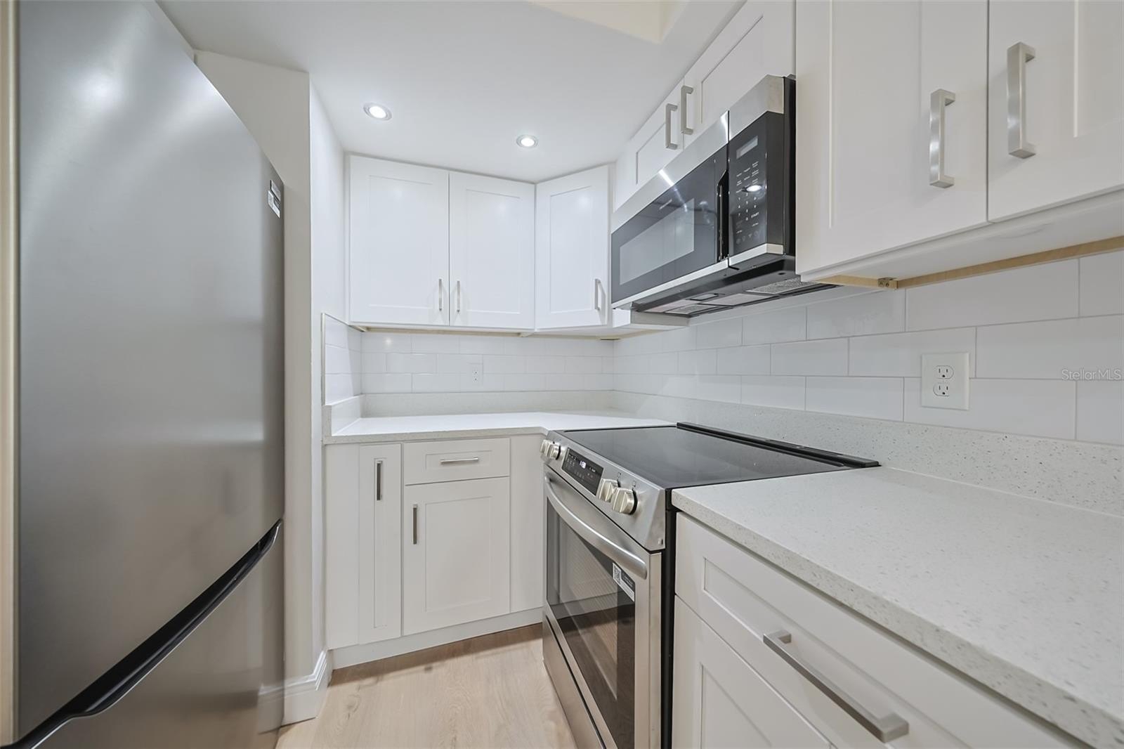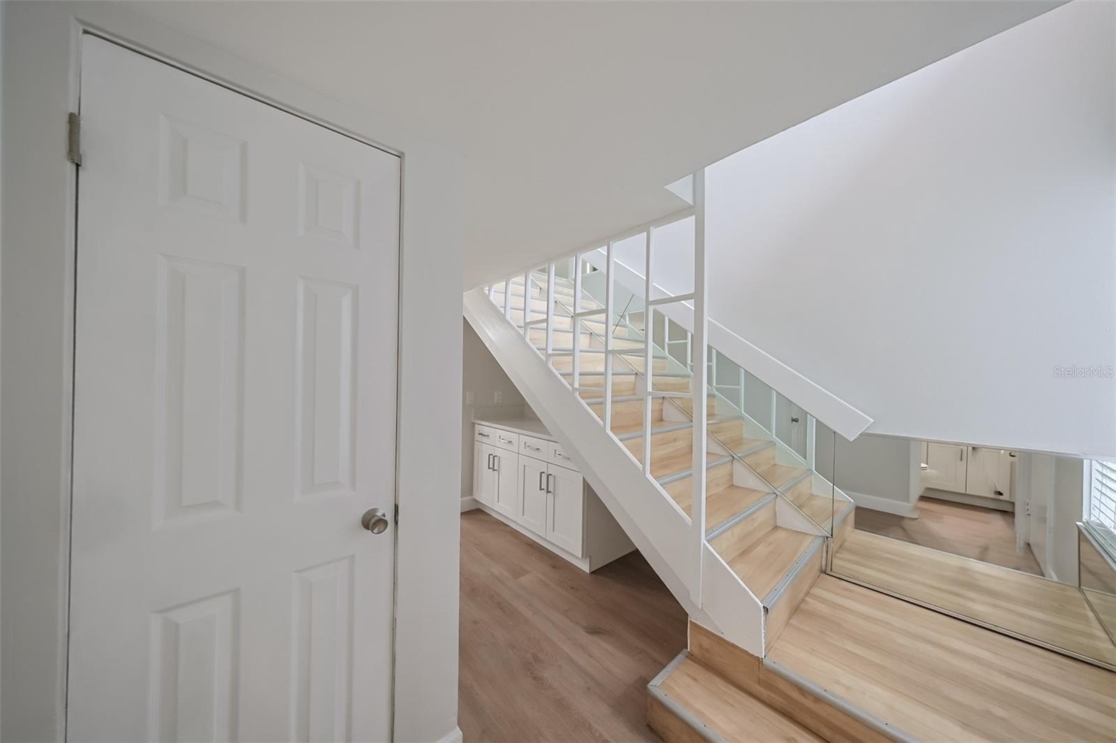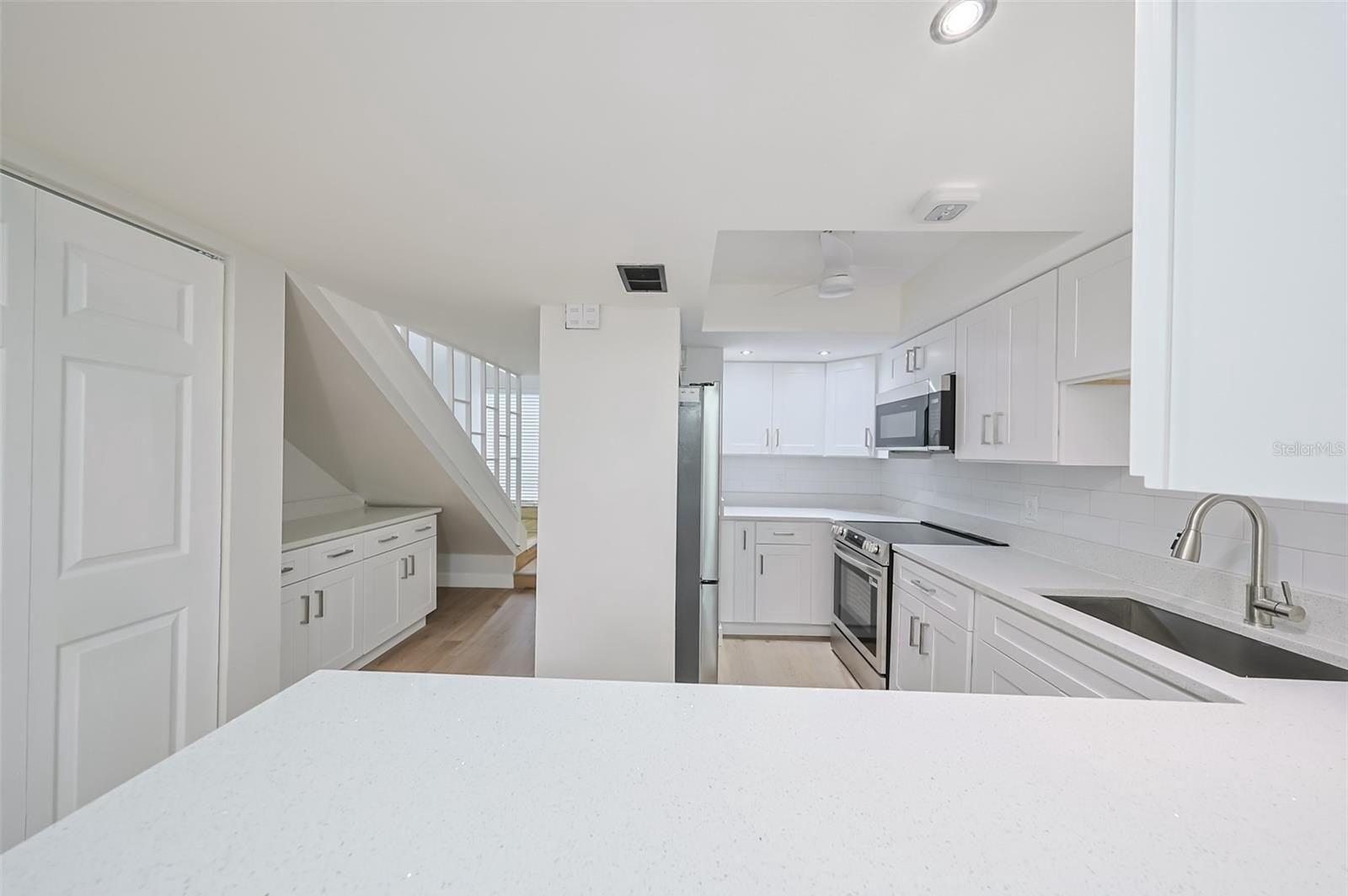 One or more photo(s) has been virtually staged. One or more photo(s) has been virtually staged. Step into this light-filled urban retreat “corner condo” and discover true Florida living: • Open-concept floor plan, with complementing wood laminate flooring throughout the condo, Designer shade of light dove gray, light enhancing fresh paint for entire condo, recessed daylight lighting looks so bright, airy and inviting. • The gourmet kitchen is a chef's delight, complete with new sleek quartz countertops, a spacious island, farm type new deep kitchen sink, with new bright under cabinet lighting throughout the kitchen, and ALL new top-of-the-line kitchen appliances, never used, and still under warranty. • Spacious double pantry, adjacent to the kitchen, and along the entry foyer, an extra quartz topped hallway cabinet with drawers for a perfect built in bar with tons of storage. No wasted space in this condo! • Private screened in patio on ground floor with large storage closet, to enjoy outdoor dining, and within 100 yards of the outdoor heated year round pool • Newly renovated downstairs half bath with new shaker type vanity and quartz countertop, and new wall mounted mirror. • Upstairs the primary bedroom includes full bathroom with shower/tub combo, recessed lighting in bathroom and bedroom, new updated ceiling fans with remote controlled dimmer switches and fan speed setting. Primary bedroom closet has upgrades built in for shoes & accessories storage, and also includes a cedar chest for safely stowing away seasonal items. • Guest room/ office is full of spacious closets and has a full size Murphy Bed with bookshelves making this a perfect office by day, and guest room by night. • 2nd floor full sized bathroom recently regrouted, additional 2nd floor storage closets, and a full sizes washer and dryer included in laundry room closet with added shelf storage behind louvered doors. • Corner condo is very close proximity to community parking lot, and only steps away from your private parking spot, community clubhouse and year round heated pool. • New Carrier HVAC unit replaced in 2025