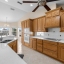 The kitchen features solid wood cabinetry, brand new quartz counters (2025), crown molding, new lighting, cooktop with hood vent, built-in oven & microwave, pantry, and bar seating—perfect for entertaining.
