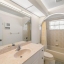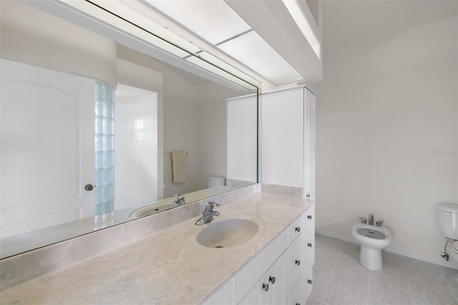 The primary suite is accessed through double doors and includes a large walk-in closet and ensuite bath with an oversized vanity, bidet, and walk-in shower. Two additional bedrooms and a full bath are located on the opposite side of the home, ensuring privacy for guests.