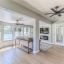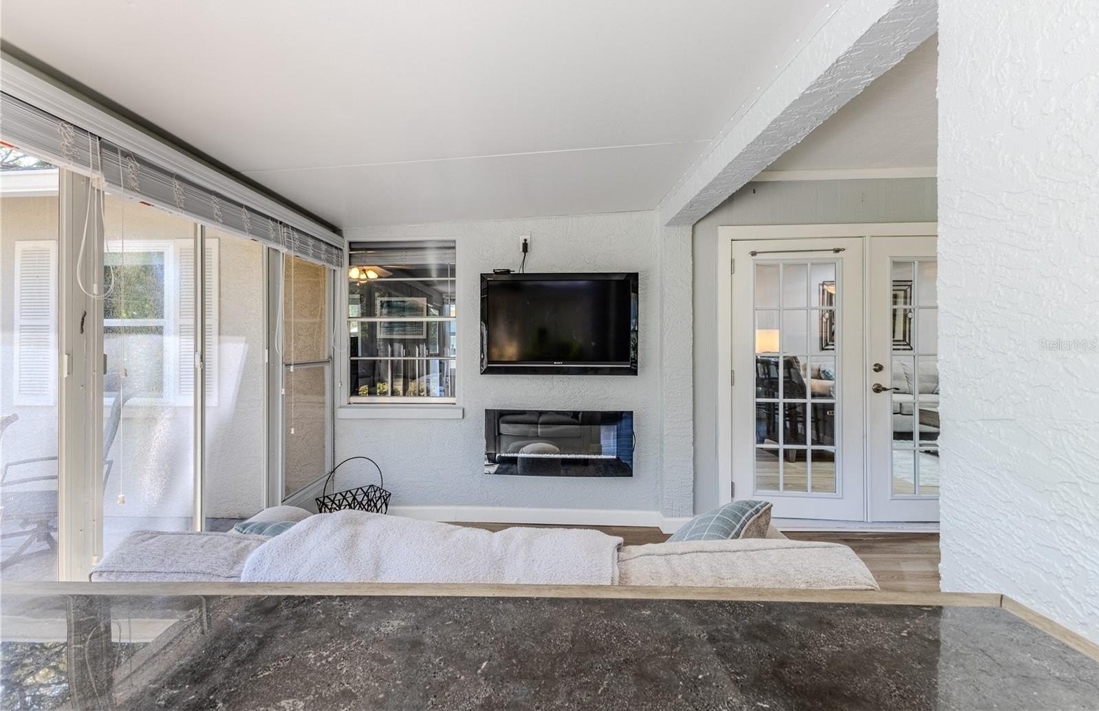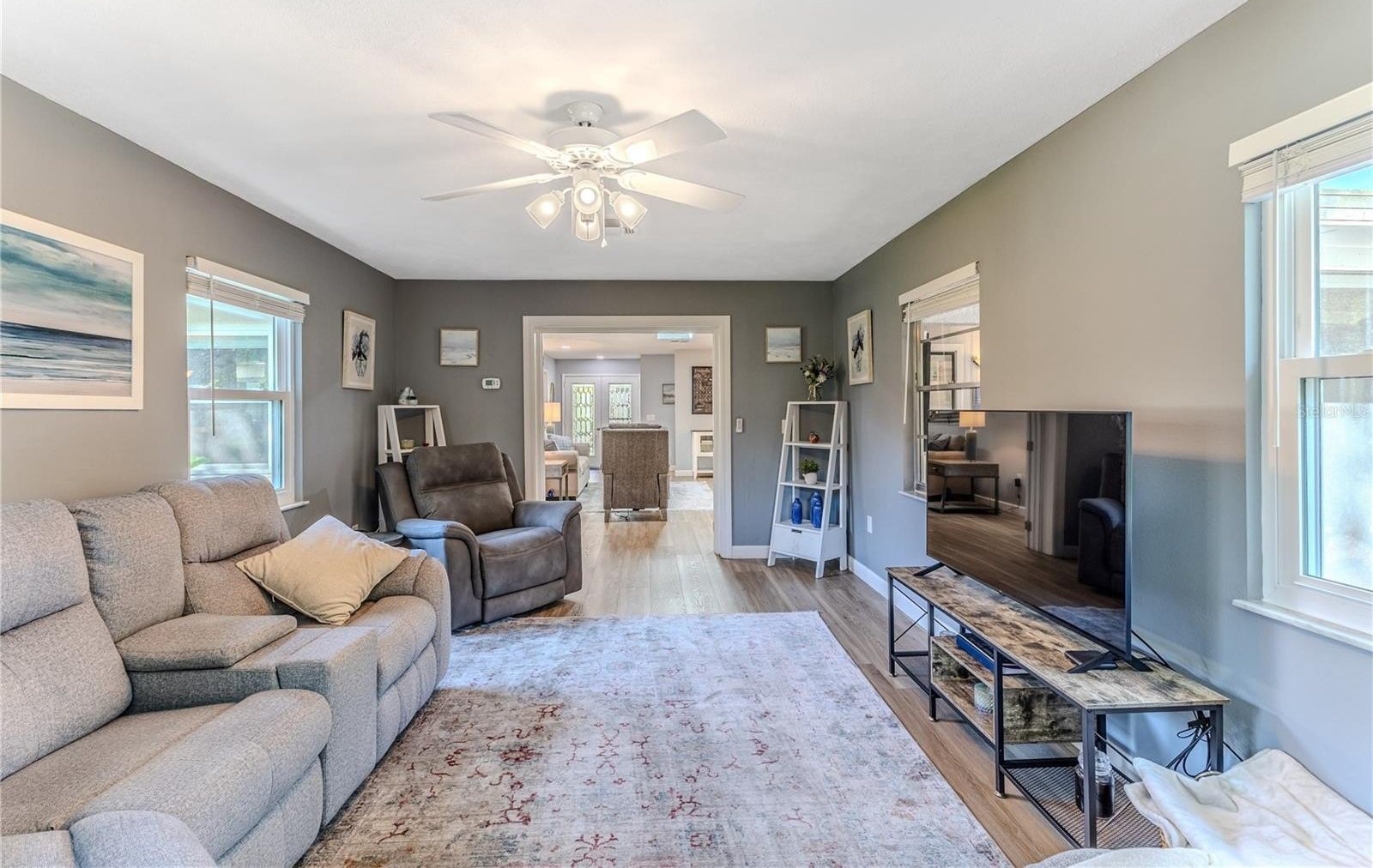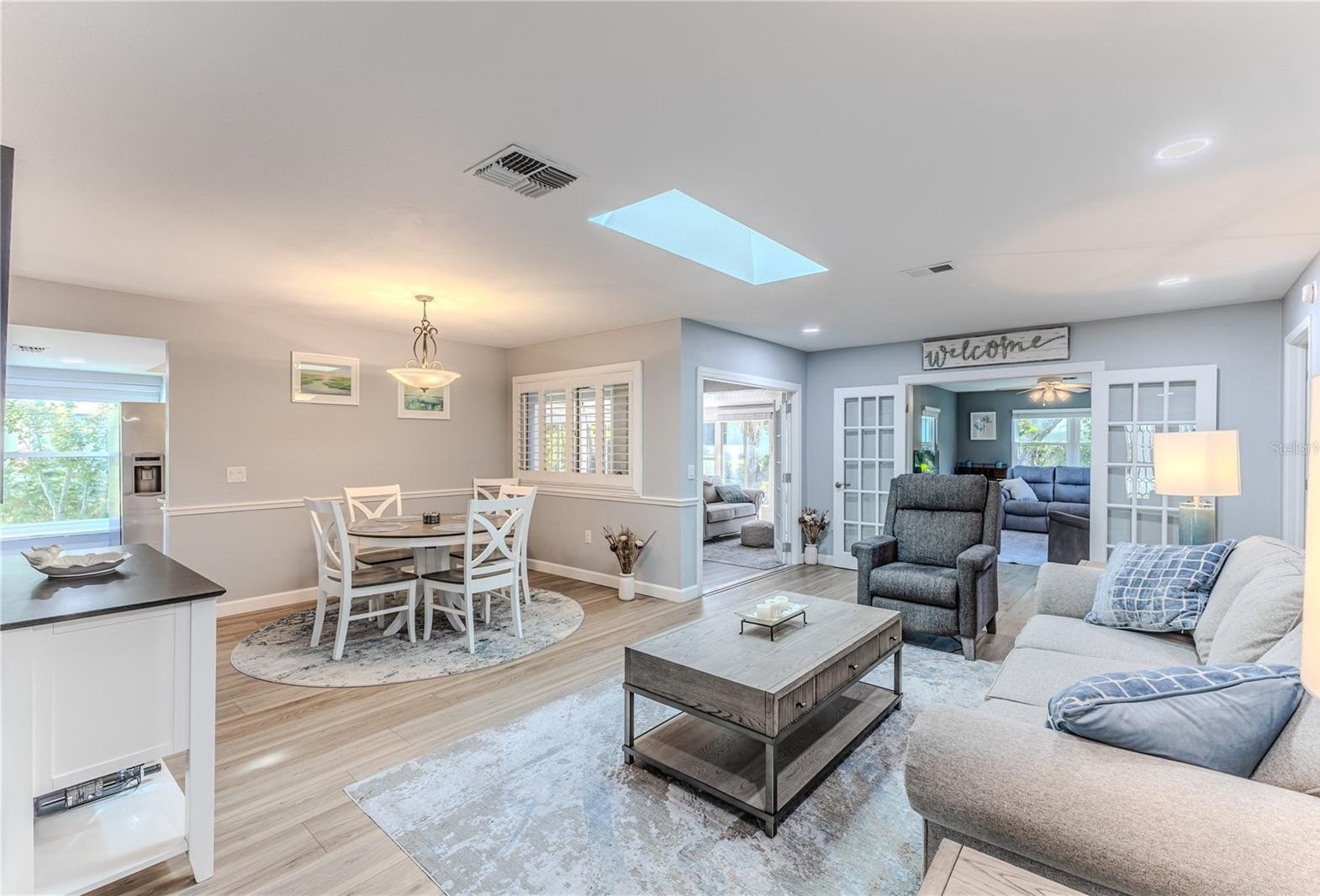 A paver walkway leads to the charming front porch. Inside, wide luxury vinyl plank flooring flows through the main living areas, while plantation shutters, a skylight, and elegant lighting add warmth and character. The open living and dining areas are perfect for entertaining, with French doors leading to both the family room and the enclosed lanai.