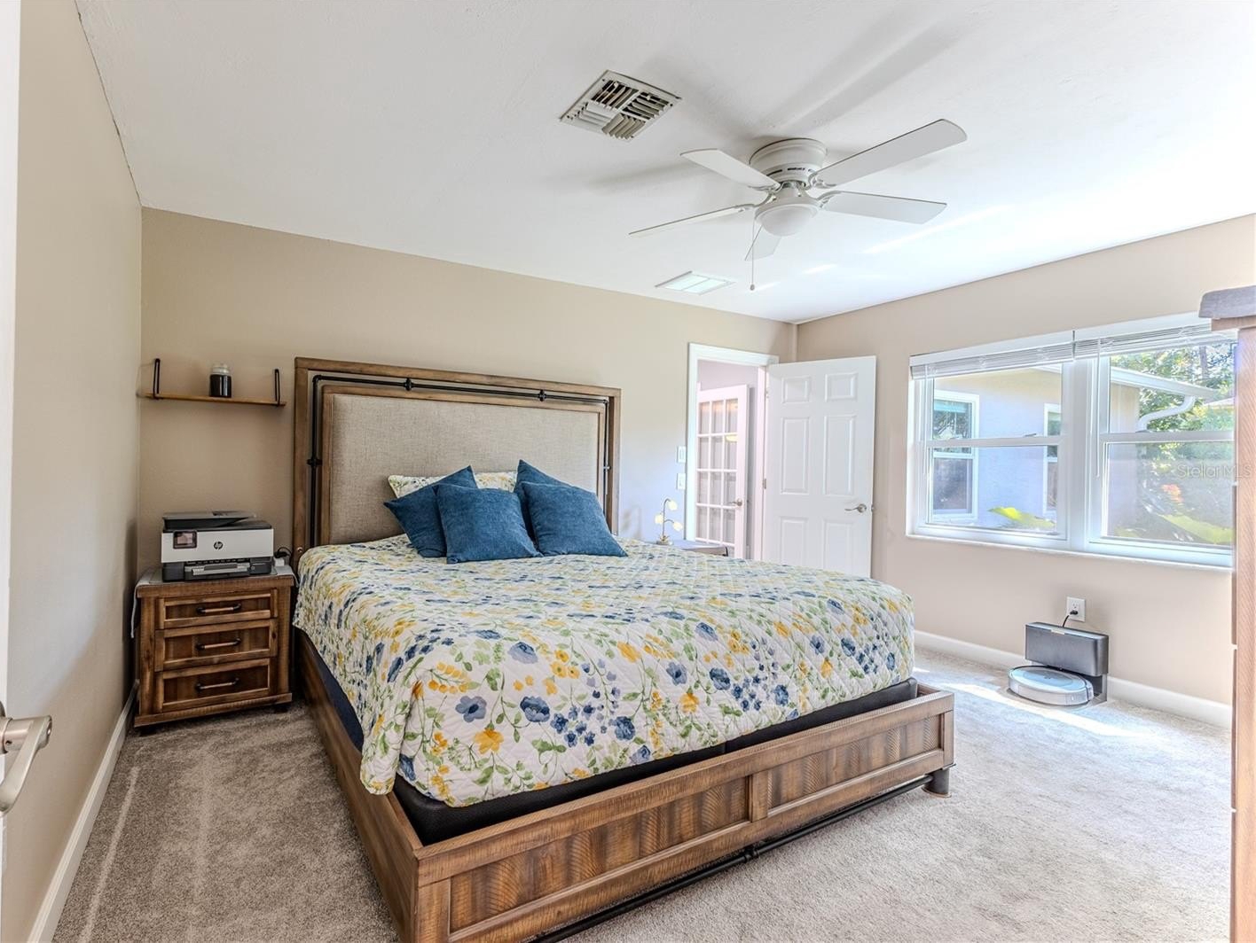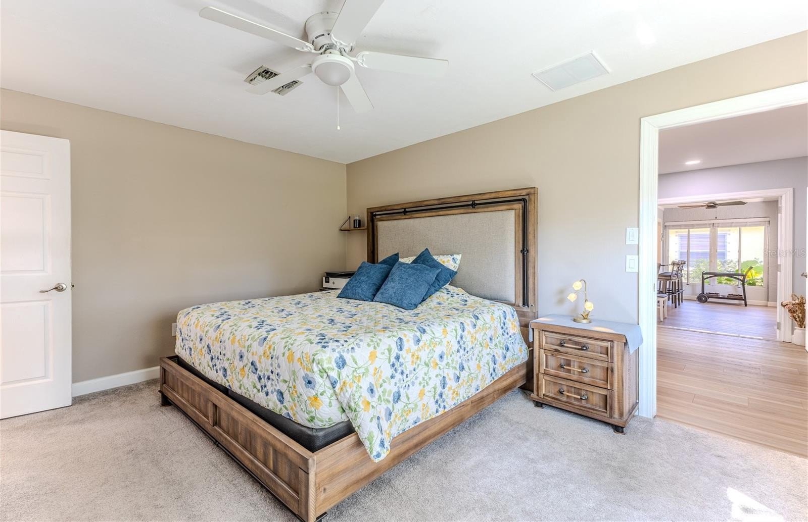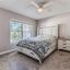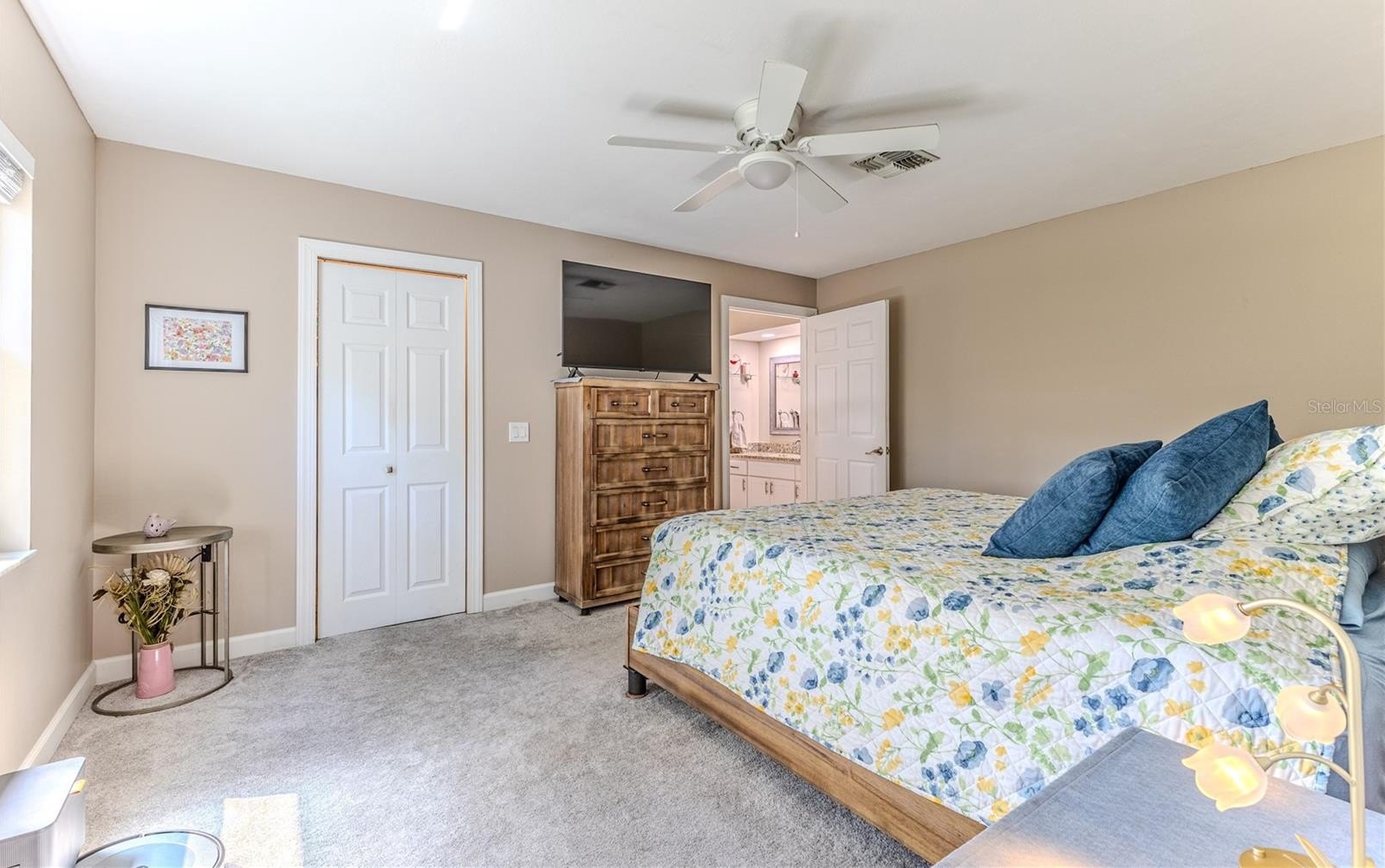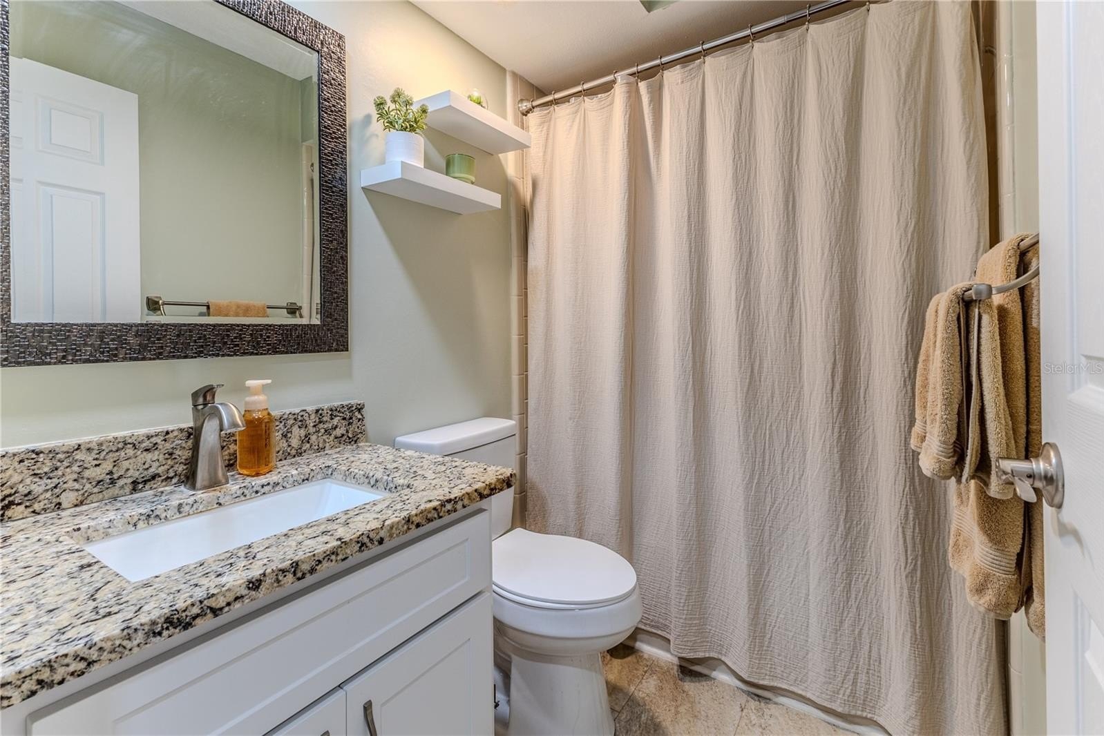 The split-bedroom floor plan provides privacy for guests. The front bedroom features a large closet and access to a full bath with granite countertops and a tub/shower combination. The spacious primary suite includes a ceiling fan, oversized walk-in closet, and an updated bath with granite counters, tile flooring, and a walk-in shower.