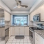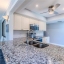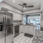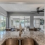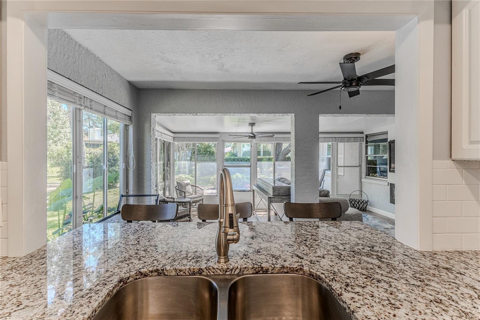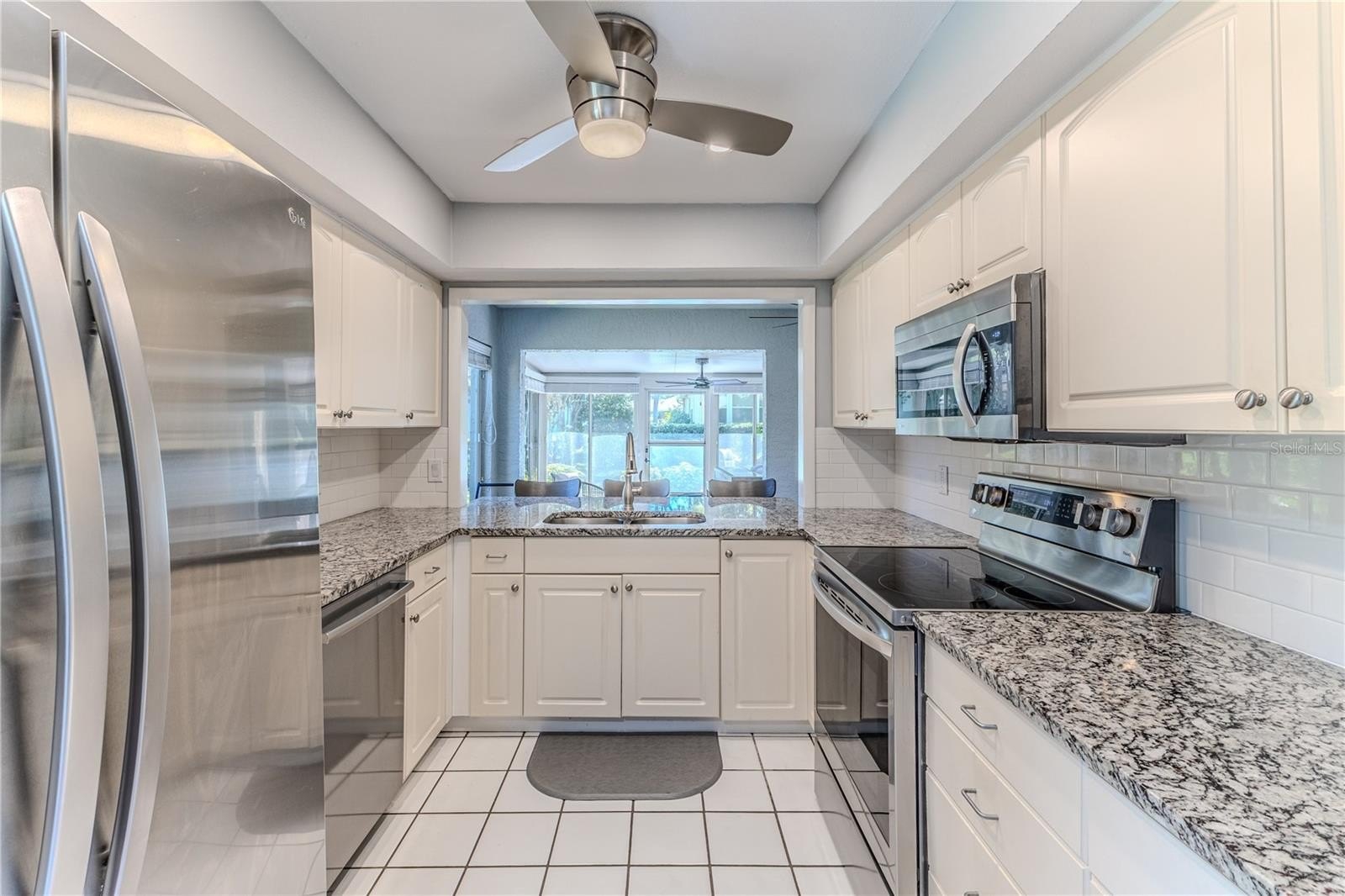 The kitchen shines with granite countertops, stainless steel appliances, pull-out cabinetry, tile flooring, ceiling fan, and a pass-through window to the lanai — great for serving guests or casual dining.