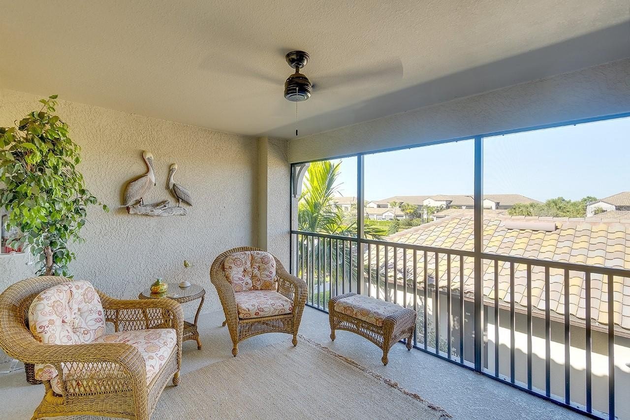 This may be the one you’ve been waiting for! TASTEFULLY DECORATED and meticulously maintained, this TURNKEY FURNISHED and "GOLF INCLUDED" top floor Veranda is MOVE-IN ready. Overlooking the 9th hole of the Piper course you’ll enjoy tranquil golf course and water views from this popular Bromelia II floor plan with 2 bedrooms 2 bathrooms, DEN and GARAGE. The OPEN FLOOR PLAN features HURRICANE RATED high impact windows and doors for your protection and peace of mind, upgraded light fixtures & ceiling fans, Ring doorbell, 2 generous screened lanais (one with new sunshade), new storage cabinets in laundry, vaulted ceilings, crown moldings and porcelain tile floors that extend to the screened lanai. The well-equipped MODERN KITCHEN is open to the living area and features quartz countertops, solid wood cabinets, S/S appliances, breakfast bar and central island perfect for entertaining. The DEN provides valuable bonus space that is flexible and adaptable to a variety of uses and is currently configured as a comfortable TV/Media room. It’s worth noting the current owners are the original owners occupying it only seasonally, non-smokers and do not own pets. LIVE WHERE YOU PLAY!! Located securely within the gates of LAKEWOOD NATIONAL GOLF & COUNTRY CLUB you’ll enjoy AMAZING AMENITIES that include DEEDED MEMBERSHIP in 2–18 hole Arnold Palmer championship golf courses, a grand clubhouse, a culinary center for fine dining, resort style swimming pool area with poolside café and Tiki Bar, heated satellite pools, eight lighted Har-Tru tennis courts, PICKLEBALL courts, two Har-Tru bocce courts, state-of-the-art fitness center with 24/7 access, full-service spa, fully maintained grounds and 24 hour security, all for a low monthly fee. Lakewood National also has a progressive rental policy with transferable memberships, popular with seasonal renters, if generating income is on your radar. It’s no wonder Lakewood Ranch is the #1 bestselling multi-generational master planned community in America with excellent schools, parks, bike trails, fine restaurants, abundant shopping and just a short drive to the area’s world-class beaches, theaters, galleries and so much more. TRULY A GOLFER’S DREAM!! LIVING IS EASY, CONVENIENT AND SECURE IN THIS ACTIVE LIFESTYLE COMMUNITY! A Seller approved inventory, and floor plan are attached to listing.