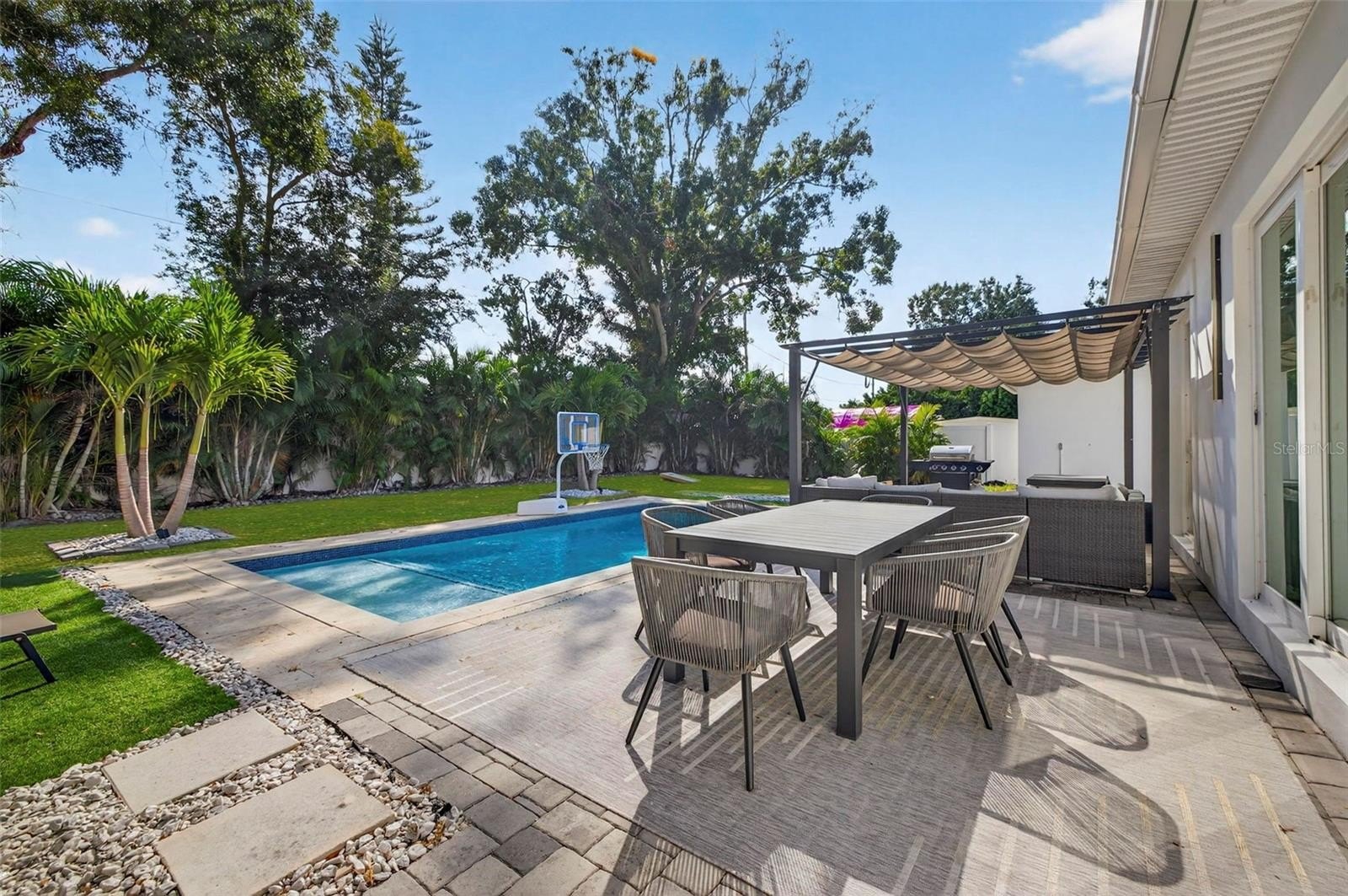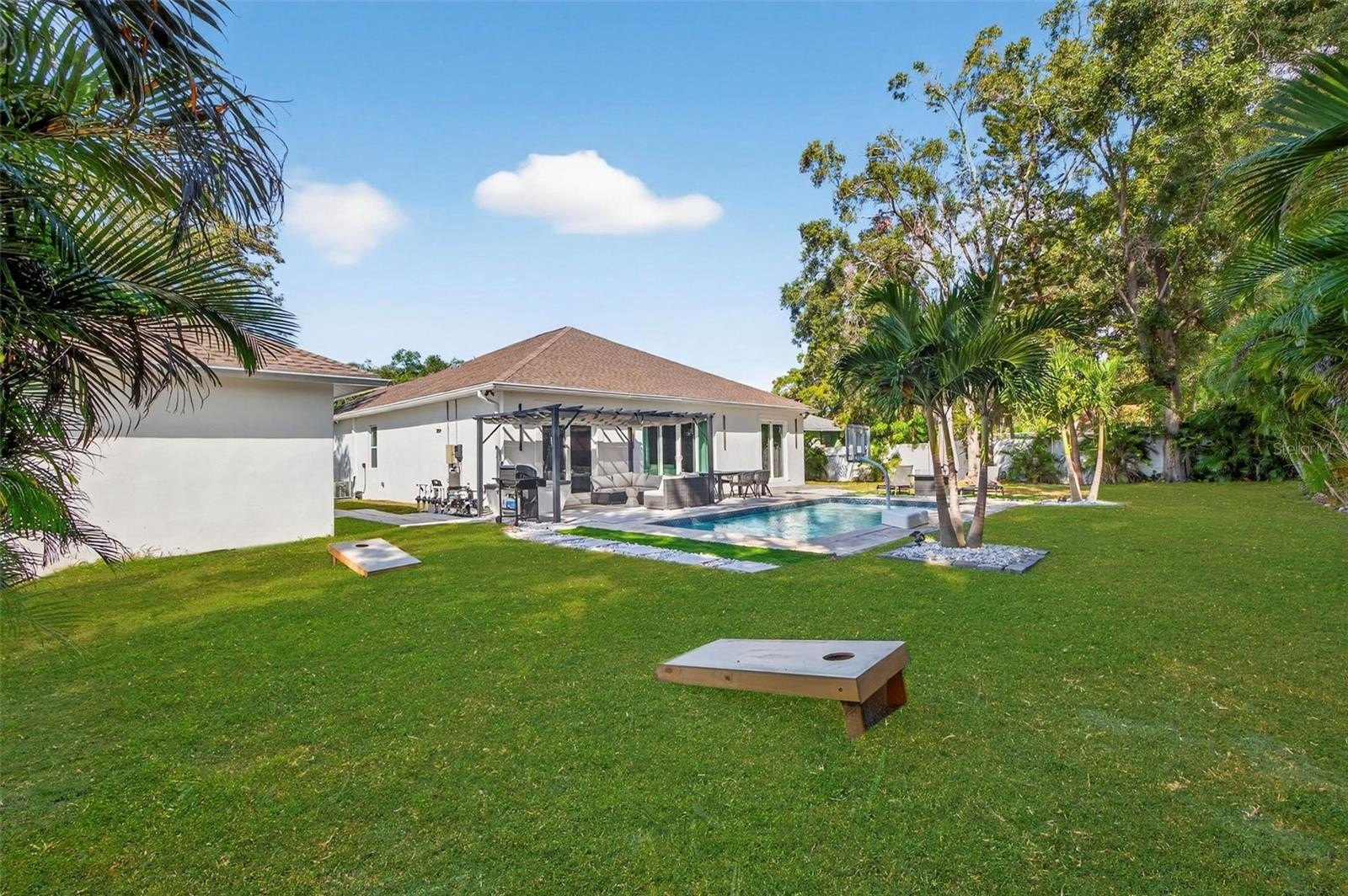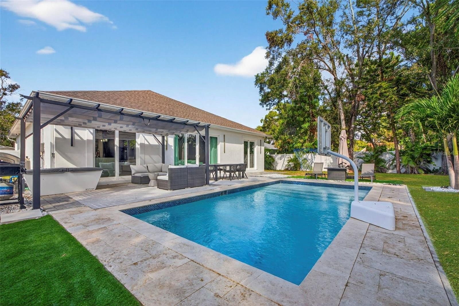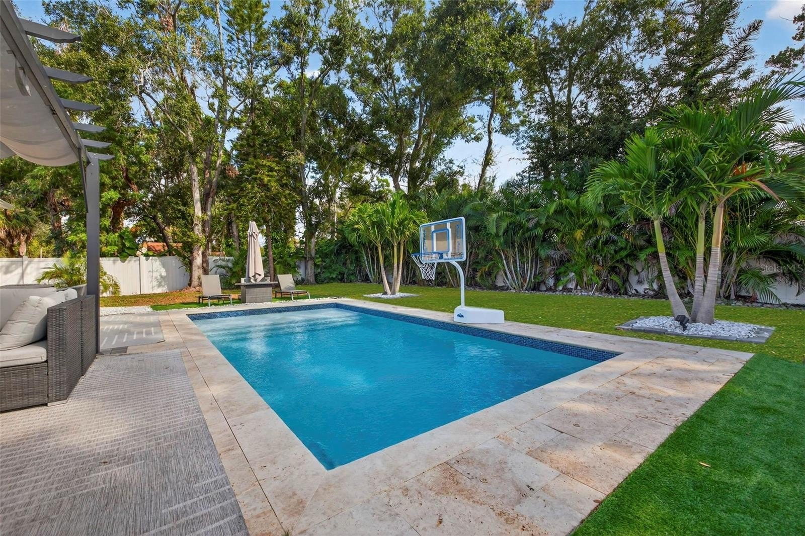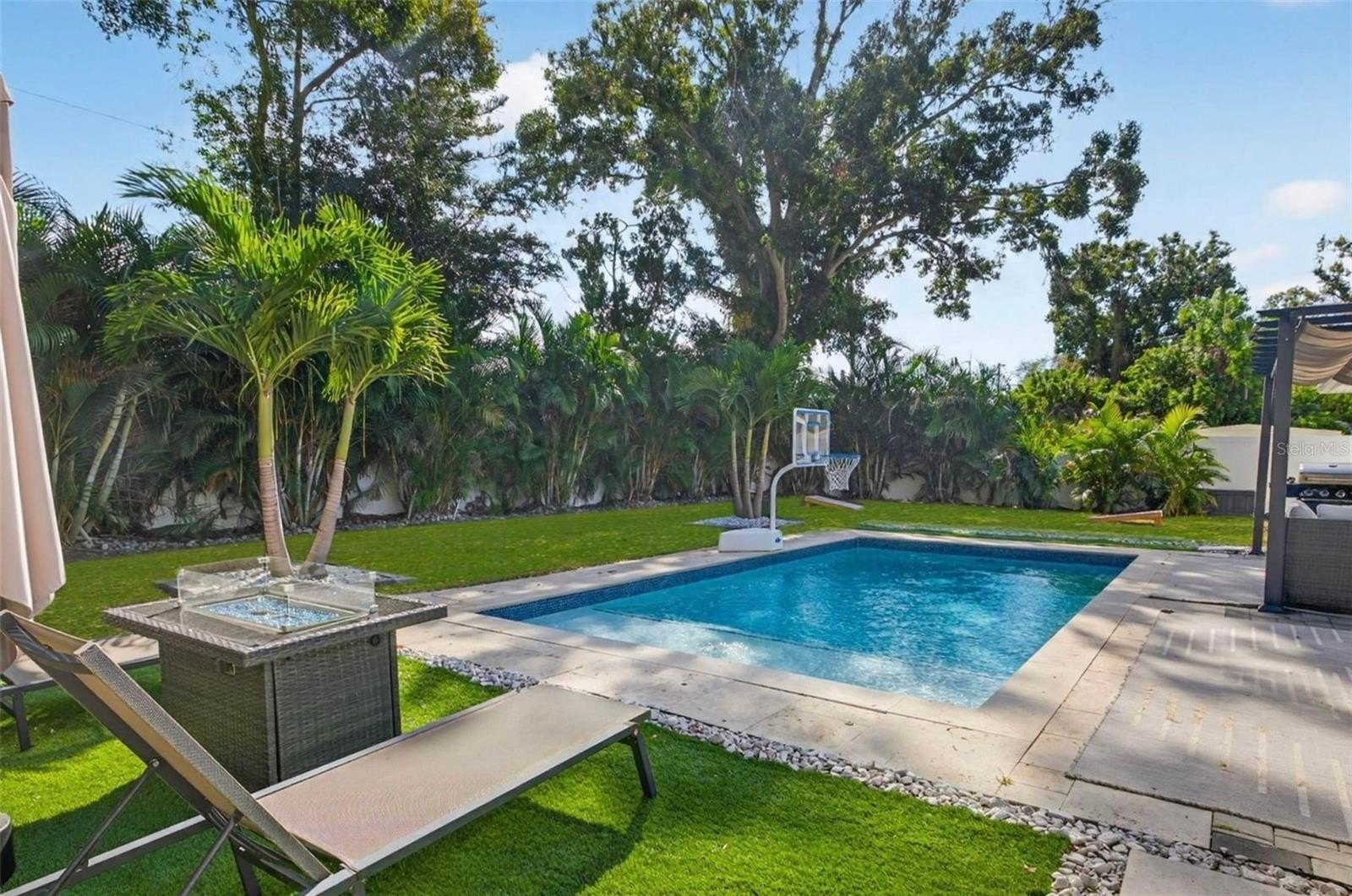 Located on a quiet street, this 4 bed, 3 bath pool home is practically new construction and sits on a third of an acre lot with a 3 car garage. Built in 2023, this home is filled with beautiful finishes and is the perfect opportunity to own new construction without waiting for the long build times. The home has high 9.5 foot ceilings giving a lux and airy feel throughout. The living space is located in the back of the home creating privacy from the street and has an open floor plan between the living, dining, and kitchen area. The chef's kitchen has plenty of cabinet space and the cabinets are topped with a beautiful quartz. The oversized kitchen island has quartz waterfall countertops and is the perfect place for entertaining and everyday meals with its barstool space. The dinning space is set off to the side of the kitchen for an intimate feel and has a modern accent wall. The living room has plenty of space for the large sectional and the whole back wall of the living and kitchen space have large sliders leading out to the outdoor living space and backyard. The living room has a stunning fireplace as it's focal point with decorative tile and flanking wood floating shelves.The tray ceilings in the space have beautiful uplighting and give off a warm and cozy feel. The home has the ideal floor plan with the bedrooms separately located away from each other. The primary suite is located privately in the back of the home with large glass sliders overlooking the backyard. The room is large in size and has tray ceilings with up lighting. The primary suite bath has double vanity sinks with a soaking tub, and a tiled walk-in shower with a glass enclosure. The suite also includes a private water closet and a walk-in closet that has been fully built out. One of the guest bedrooms is off of the dining space and has its own private ensuite bath with a shower-tub combo complete with a glass enclosure. The remaining two guest bedrooms and common bath are conveniently located off of the foyer towards the front of the home which are perfect for a home office or visiting guests. The home is also equipped with electric roll blinds. Outside, the backyard oasis offers the perfect indoor/outdoor living situation with an extensive paver patio with plenty of space for dining and lounging. The salt water pool has a sun shelf that makes it the perfect spot to relax and cool off from the hot Florida sun. The pool only takes up a small portion of the homes backyard as there is plenty of green space for activities and a large side yard where there is a detached 1 car garage. The garage is multi-functional and is currently being used as a home gym. This home is central to all that St. Pete has to offer. You are minutes to Walter Fuller Park with tree lined paths providing lots of opportunities for bike riding, walking, and jogging. The park also has multiple sports courts, including pickleball courts, a pool, and a scenic trail around Jungle Lake. The home is just a short distance away from popular restaurants, groceries, shopping, and every need necessities. You are situated perfectly between the festivities of Downtown and the attractions of the Tyrone area. The popular white sand beaches of the Gulf of Mexico are just a few minutes away and the Tampa International Airport is under 30 minutes making travel and commuting easy.