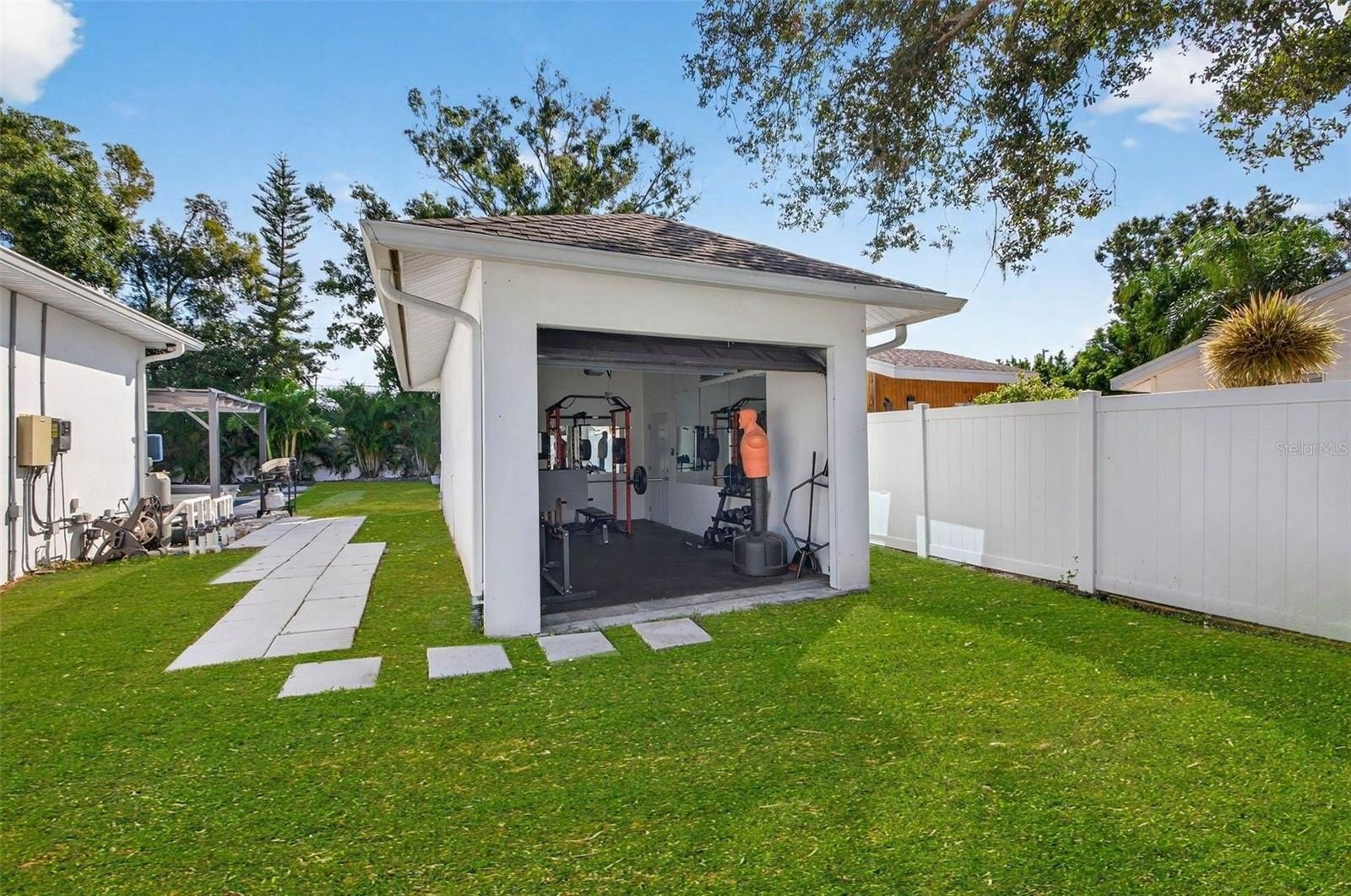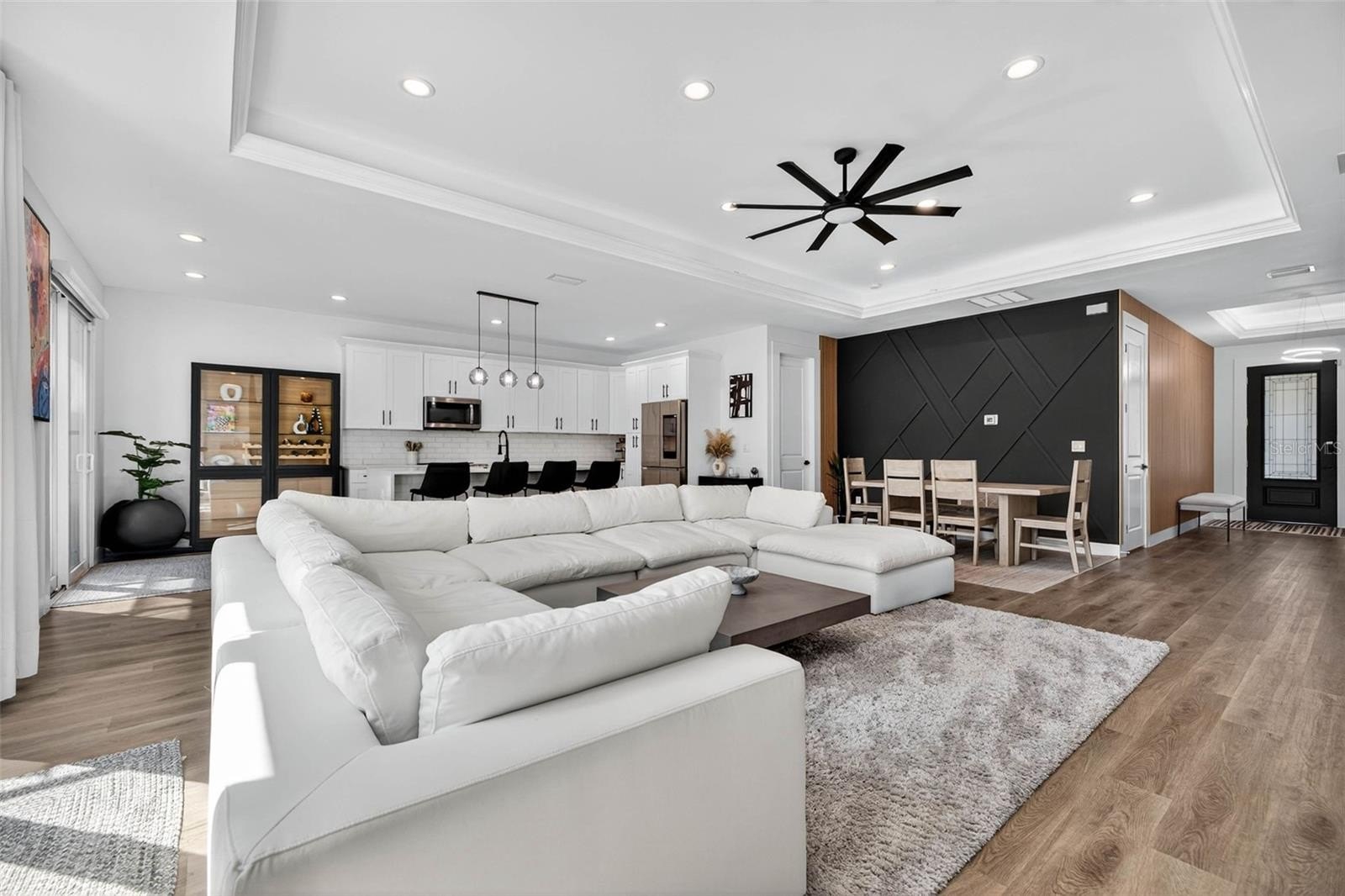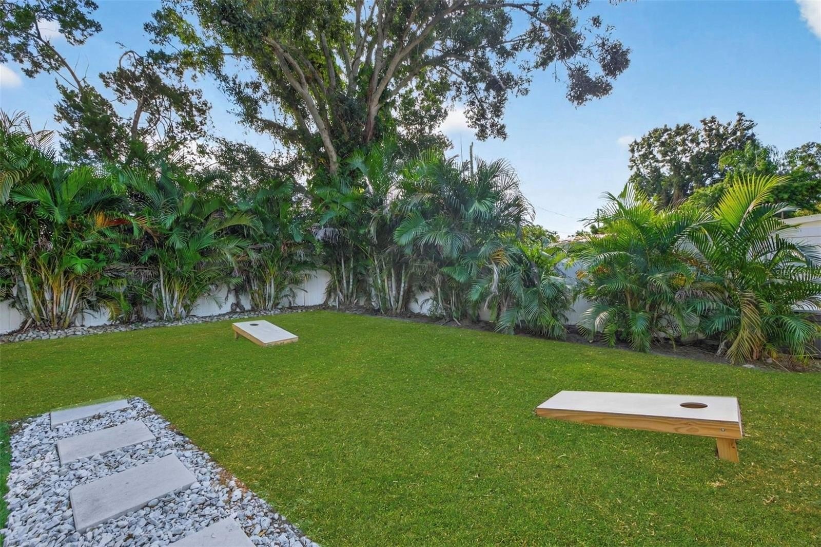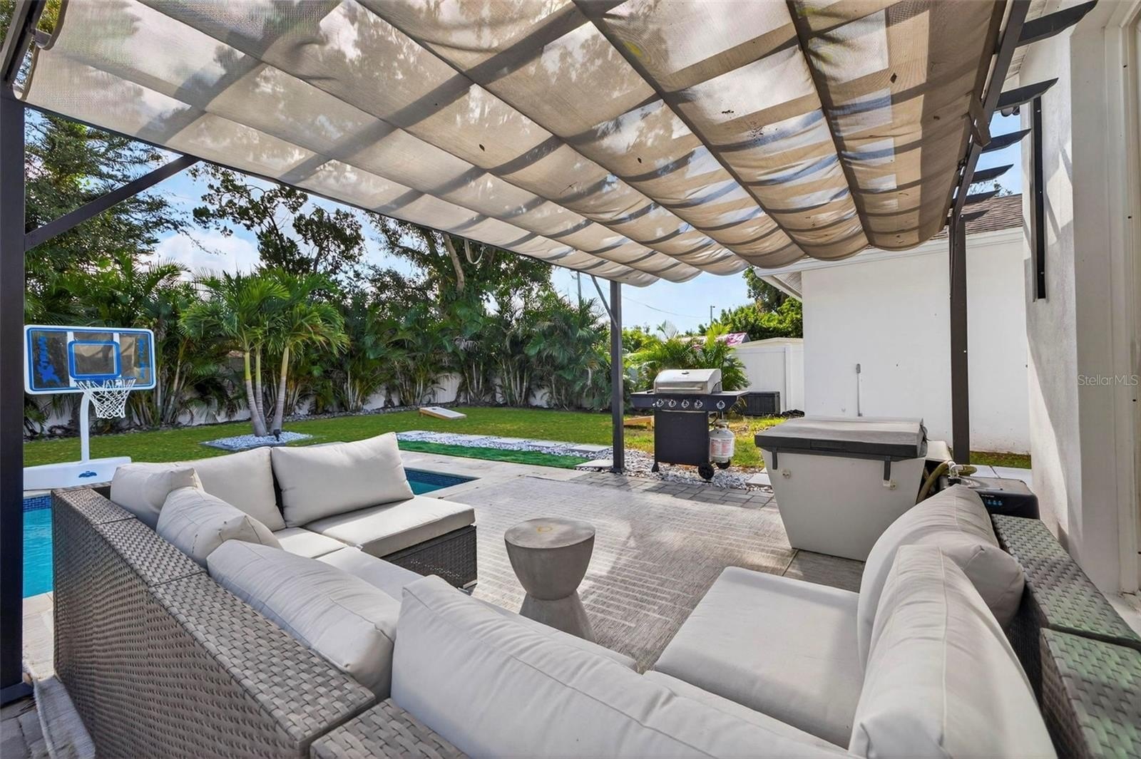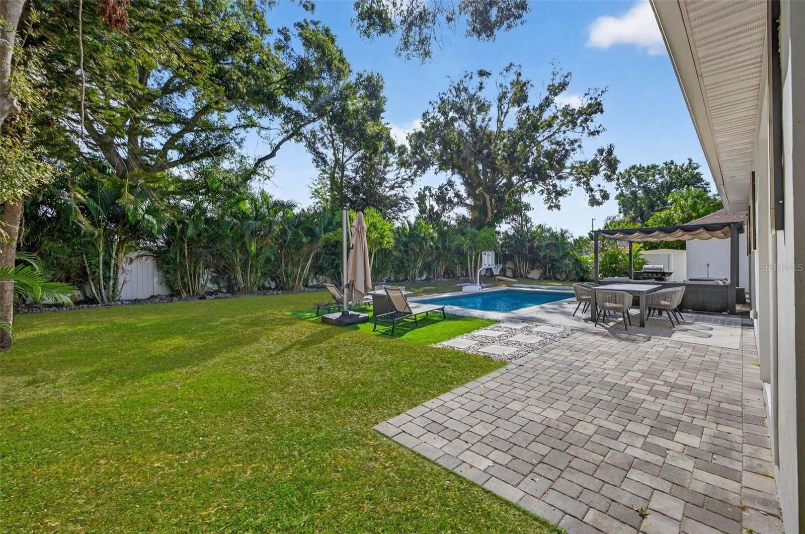 Located on a quiet street, this 4 bed, 3 bath pool home is practically new construction and sits on a third of an acre lot with a 3 car garage. Built in 2023, this home is filled with beautiful finishes and is the perfect opportunity to own new construction without waiting for the long build times. The home has high 9.5 foot ceilings giving a lux and airy feel throughout. The living space is located in the back of the home creating privacy from the street and has an open floor plan between the living, dining, and kitchen area. The chef's kitchen has plenty of cabinet space and the cabinets are topped with a beautiful quartz. The oversized kitchen island has quartz waterfall countertops and is the perfect place for entertaining and everyday meals with its barstool space. The dinning space is set off to the side of the kitchen for an intimate feel and has a modern accent wall. The living room has plenty of space for the large sectional and the whole back wall of the living and kitchen space have large sliders leading out to the outdoor living space and backyard. The living room has a stunning fireplace as it's focal point with decorative tile and flanking wood floating shelves.The tray ceilings in the space have beautiful uplighting and give off a warm and cozy feel. The home has the ideal floor plan with the bedrooms separately located away from each other. The primary suite is located privately in the back of the home with large glass sliders overlooking the backyard. The room is large in size and has tray ceilings with up lighting. The primary suite bath has double vanity sinks with a soaking tub, and a tiled walk-in shower with a glass enclosure. The suite also includes a private water closet and a walk-in closet that has been fully built out. One of the guest bedrooms is off of the dining space and has its own private ensuite bath with a shower-tub combo complete with a glass enclosure. The remaining two guest bedrooms and common bath are conveniently located off of the foyer towards the front of the home which are perfect for a home office or visiting guests. The home is also equipped with electric roll blinds. Outside, the backyard oasis offers the perfect indoor/outdoor living situation with an extensive paver patio with plenty of space for dining and lounging. The salt water pool has a sun shelf that makes it the perfect spot to relax and cool off from the hot Florida sun. The pool only takes up a small portion of the homes backyard as there is plenty of green space for activities and a large side yard where there is a detached 1 car garage. The garage is multi-functional and is currently being used as a home gym. This home is central to all that St. Pete has to offer. You are minutes to Walter Fuller Park with tree lined paths providing lots of opportunities for bike riding, walking, and jogging. The park also has multiple sports courts, including pickleball courts, a pool, and a scenic trail around Jungle Lake. The home is just a short distance away from popular restaurants, groceries, shopping, and every need necessities. You are situated perfectly between the festivities of Downtown and the attractions of the Tyrone area. The popular white sand beaches of the Gulf of Mexico are just a few minutes away and the Tampa International Airport is under 30 minutes making travel and commuting easy.